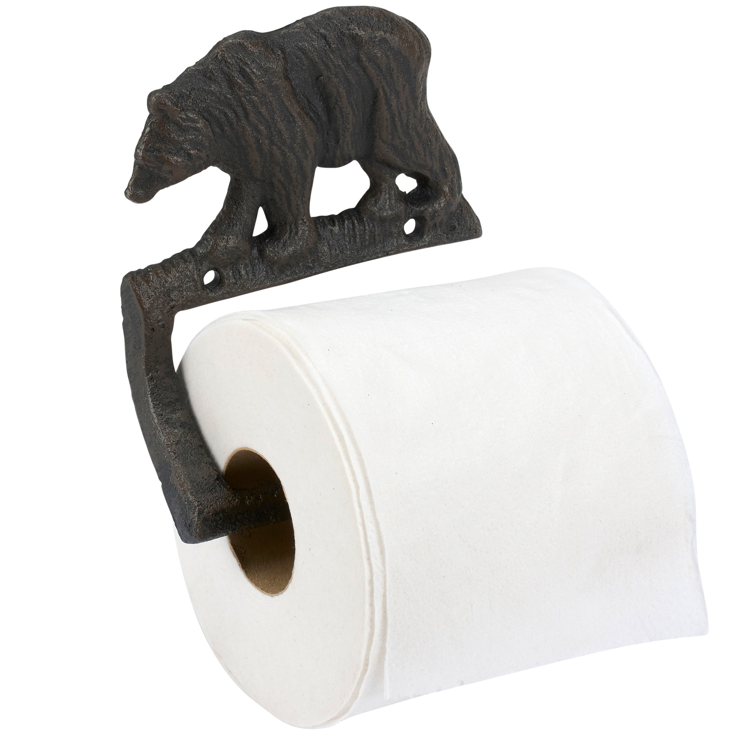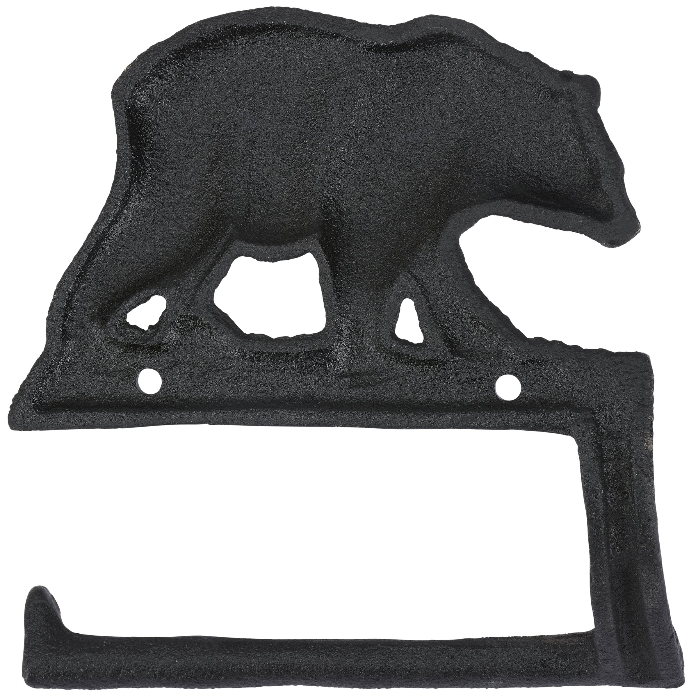 A metal toilet paper holder from our Lake & Cabin Collection displaying a rustic design inspired by cabin décor. This sturdy toilet paper holder features a sculpted black bear design with antique finish and hook to place roll. Our Black Bear toilet paper holder is easy to hang for display and use via predrilled holes. A rustic home accent that adds functional style to any bathroom.