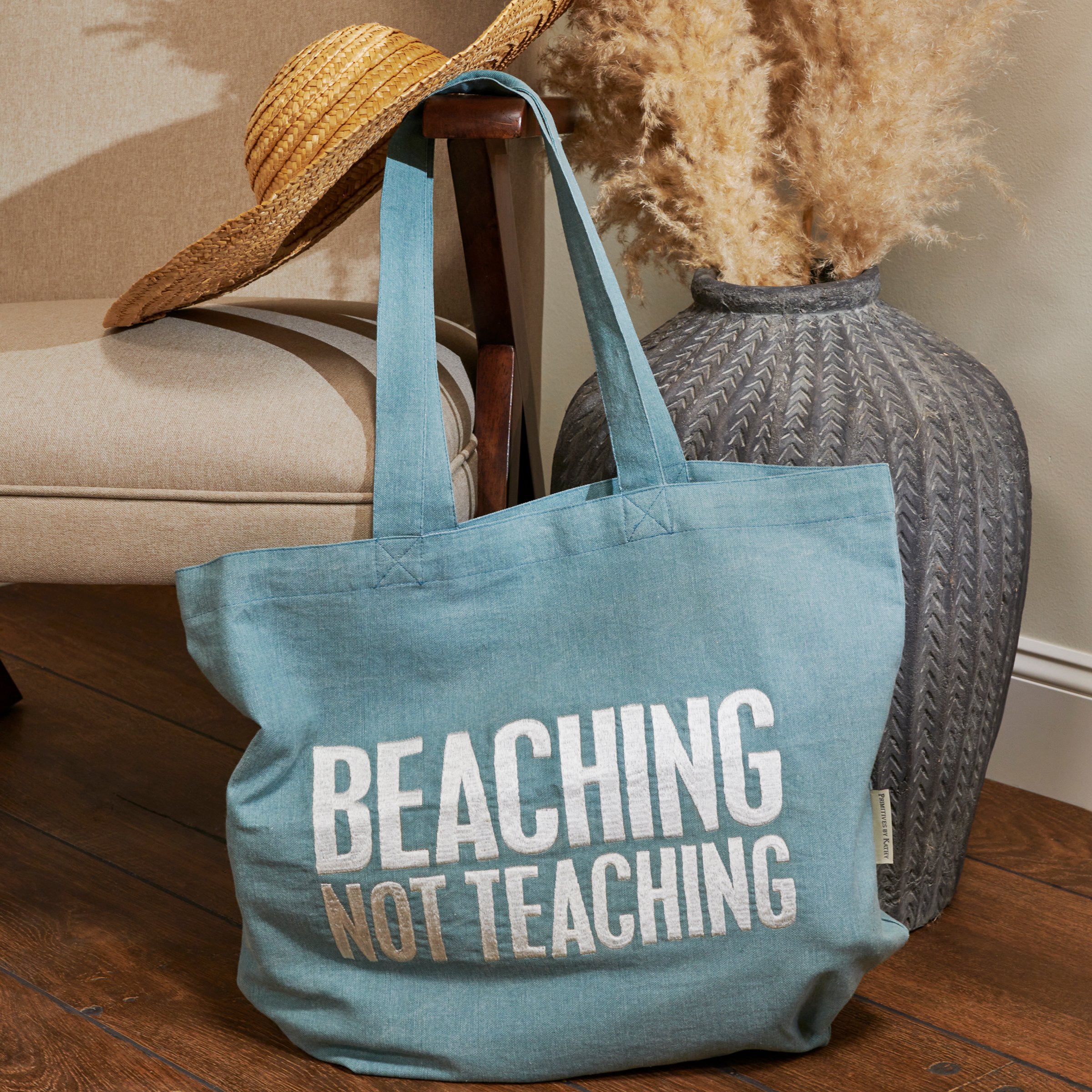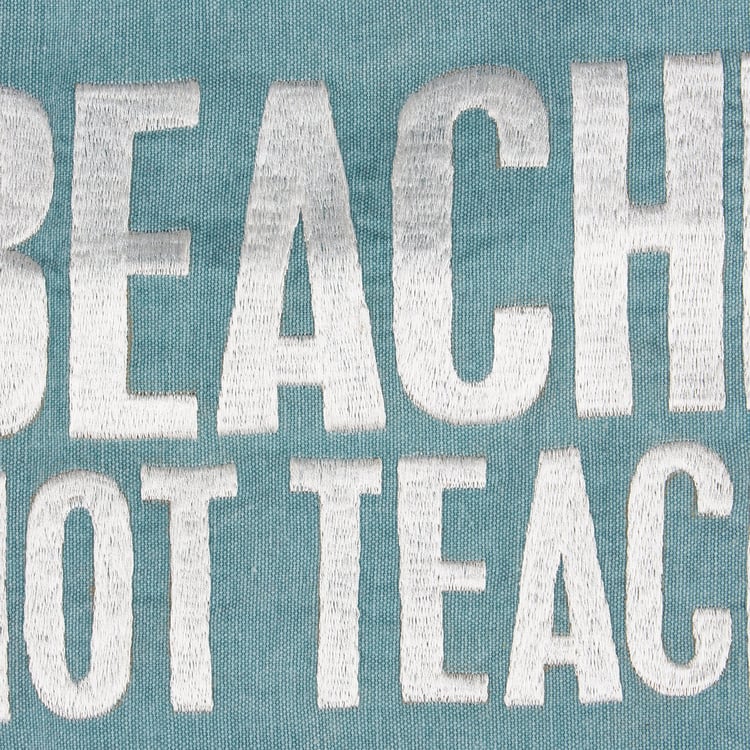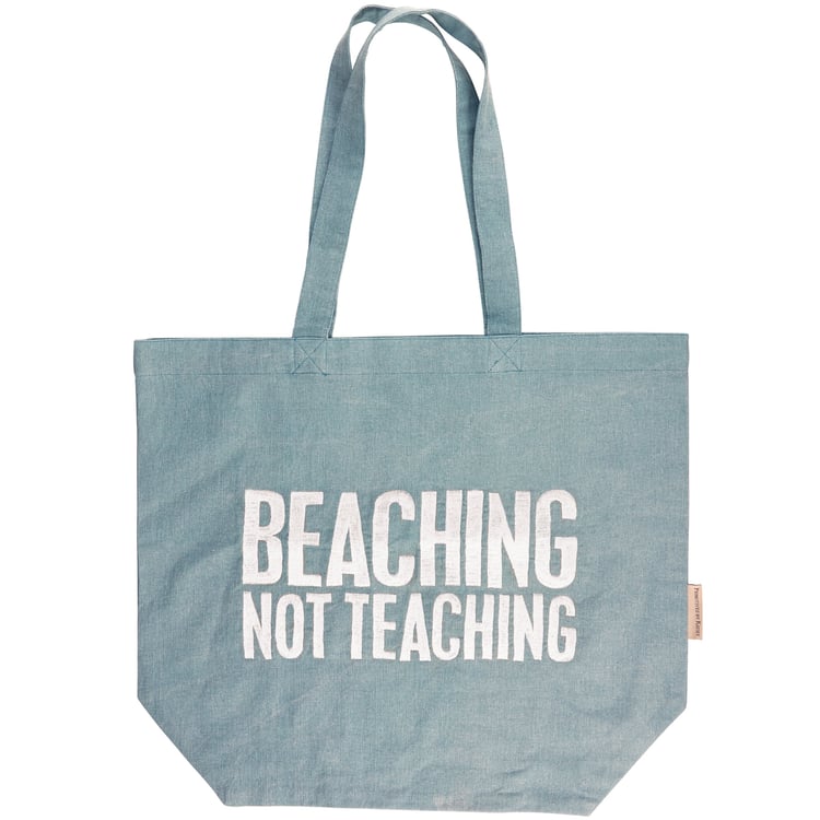 A cotton tote from our Beach Collection displaying a fun teacher and beach inspired sentiment that reads "Beaching Not Teaching" in a classic box sign style. Design features full embroidery on ocean blue tote for added interest. Our Beaching Not Teaching tote includes 11 inch straps for easy carrying. A fun teacher-themed accessory perfect for school summer vacation and beach trips.