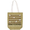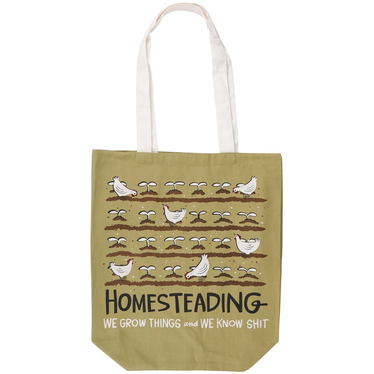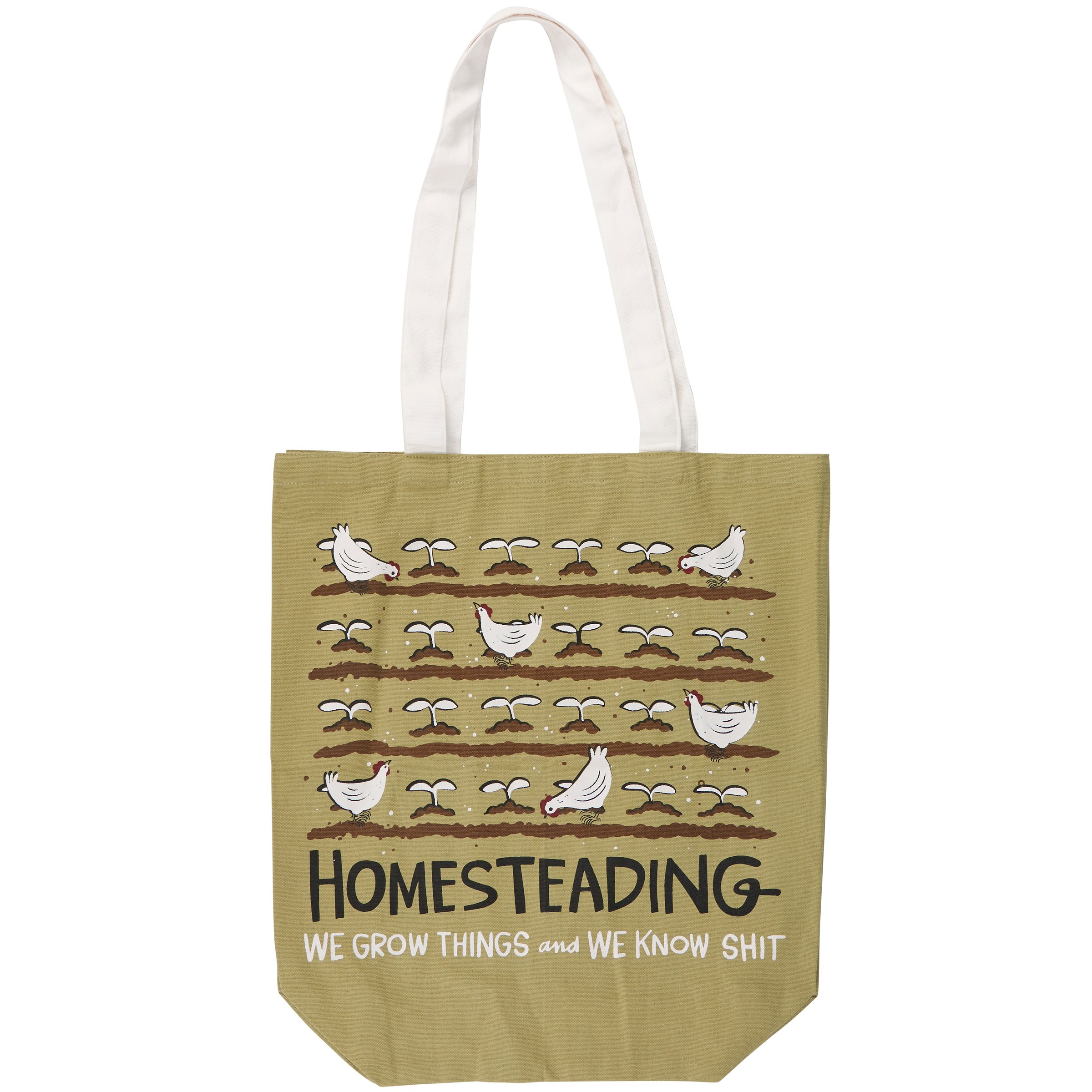 A double-sided cotton tote from our Homestead Collection displaying a unique hand illustrated design of a crop field and chickens with a farming inspired sentiment that reads "Homesteading - We Grow Things And We Know Shit." Our Homesteading tote includes 11 inch handles for easy carrying. A fun farm-themed accessory perfect for shopping and daily activities.