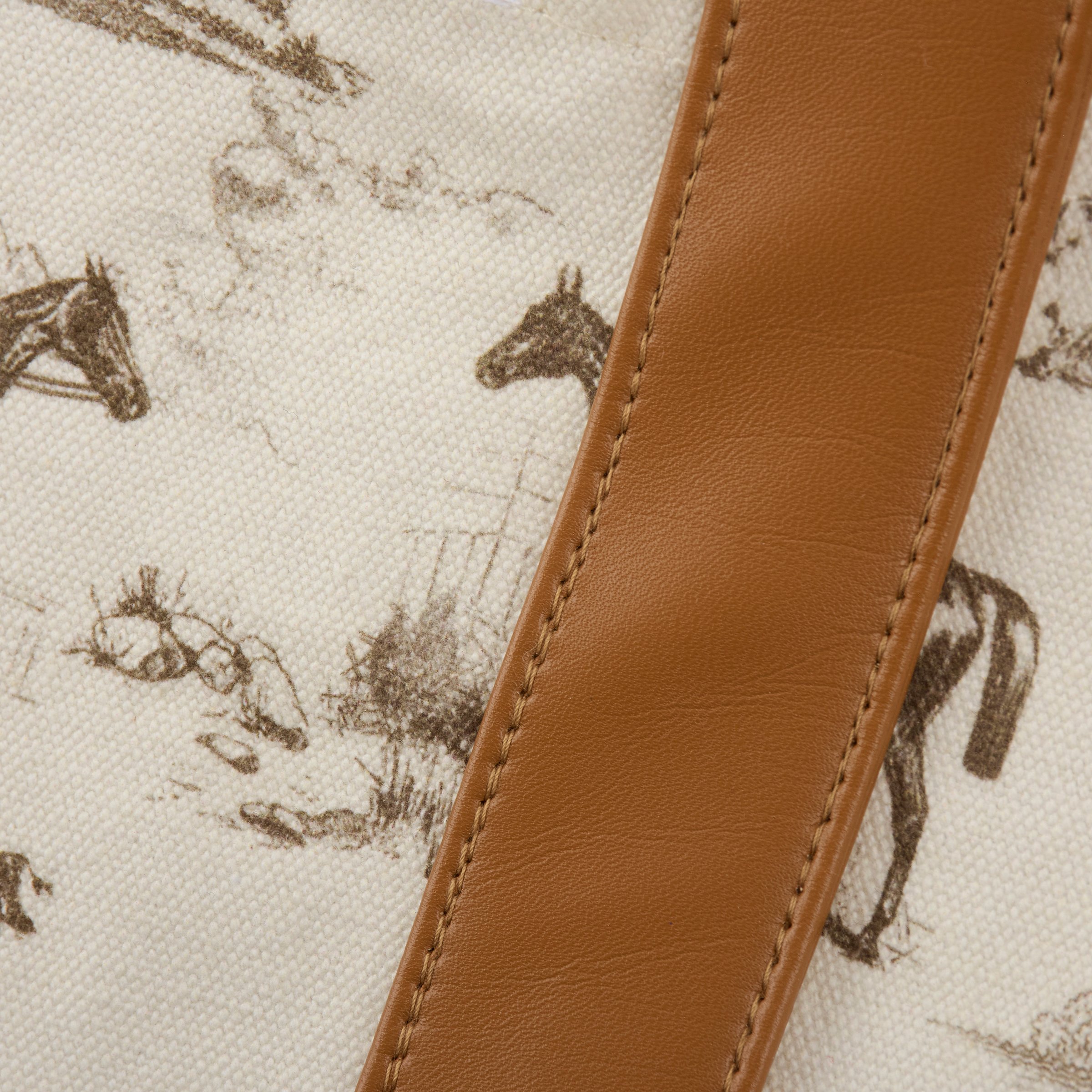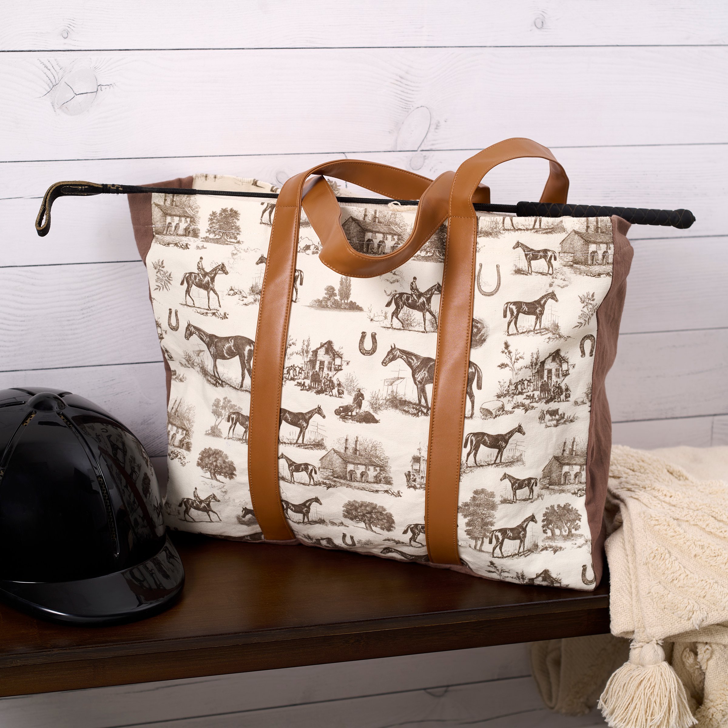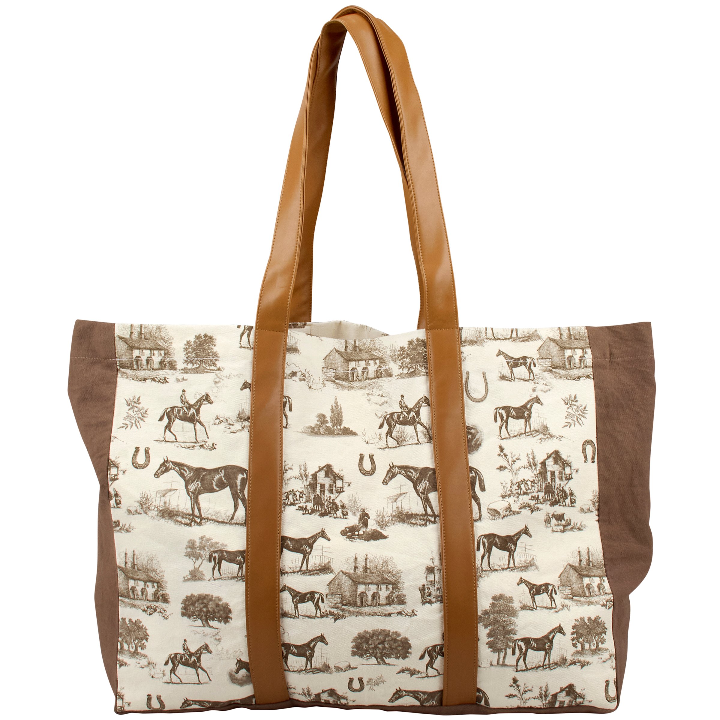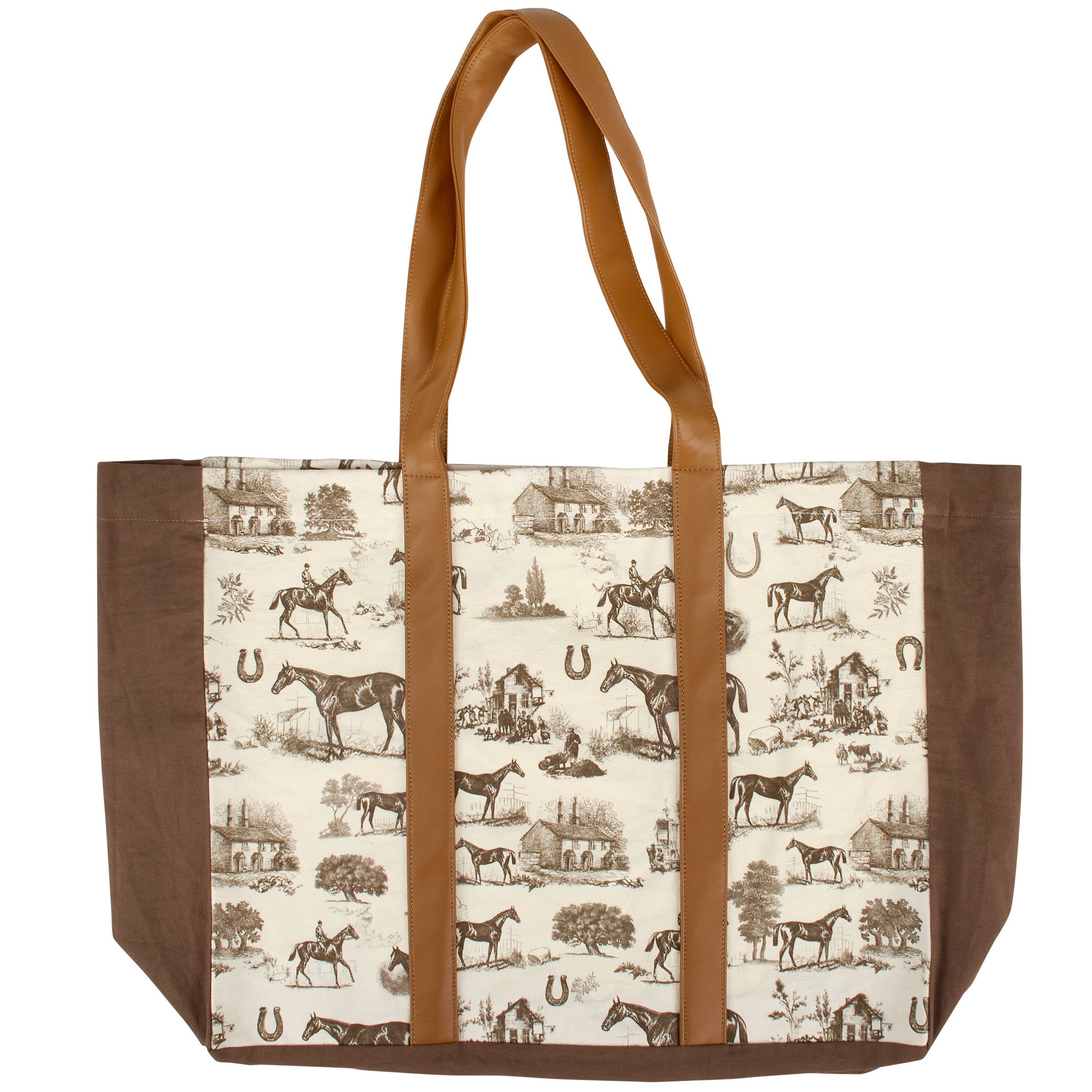 A canvas tote from our Preppy Heritage Collection featuring a double-sided design displaying a toile pattern of vintage equestrian art with faux leather strap accents. Our Horse Toile tote measures 18 inches by 14 inches ideal for shopping or travelling. An equestrian themed accessory perfect for vintage style when on the go.