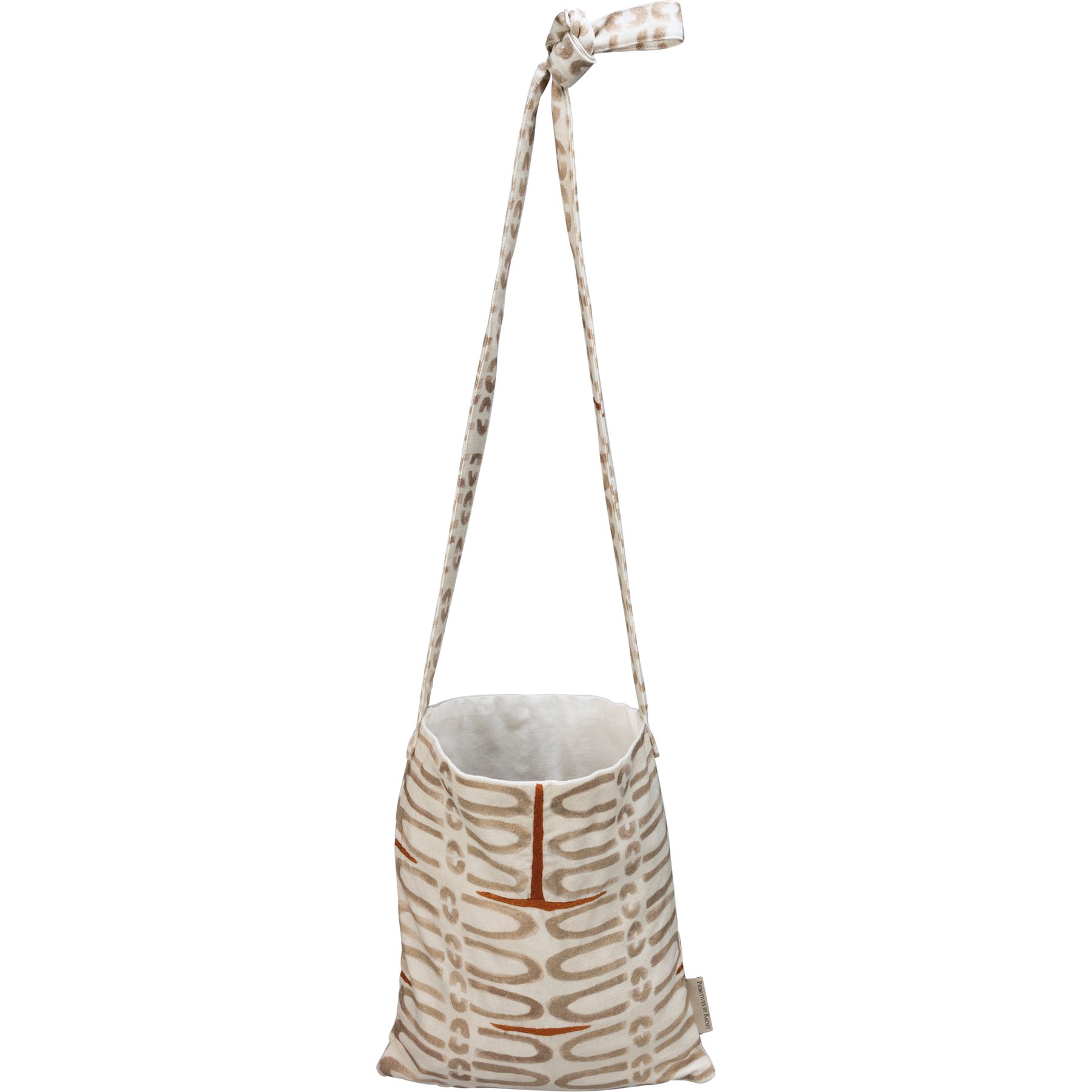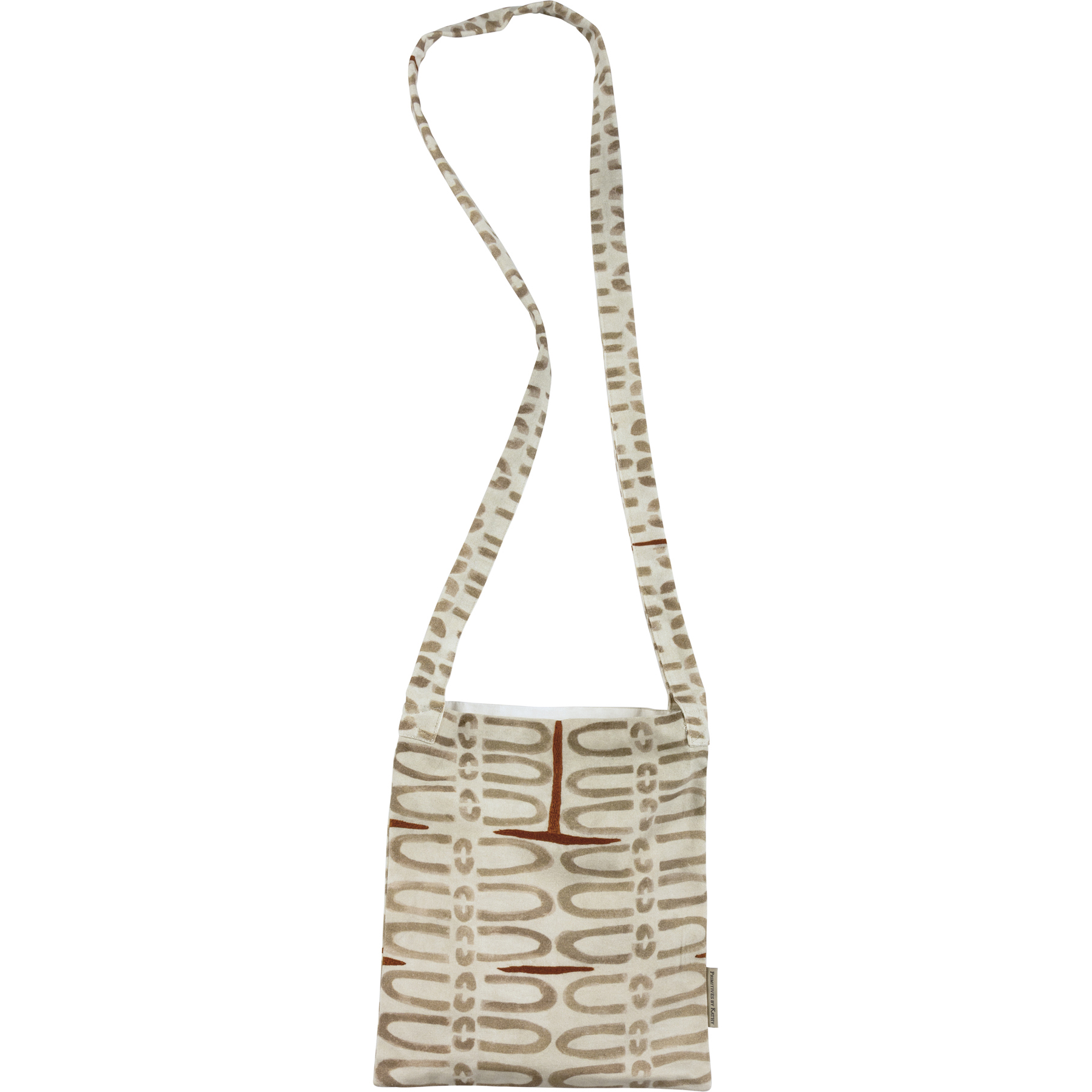A small double-sided cotton tote featuring an artisan-inspired geometric pattern and a neutral palette. Tote is easily adjustable -- simply tie a knot in the shoulder strap to achieve desired length.