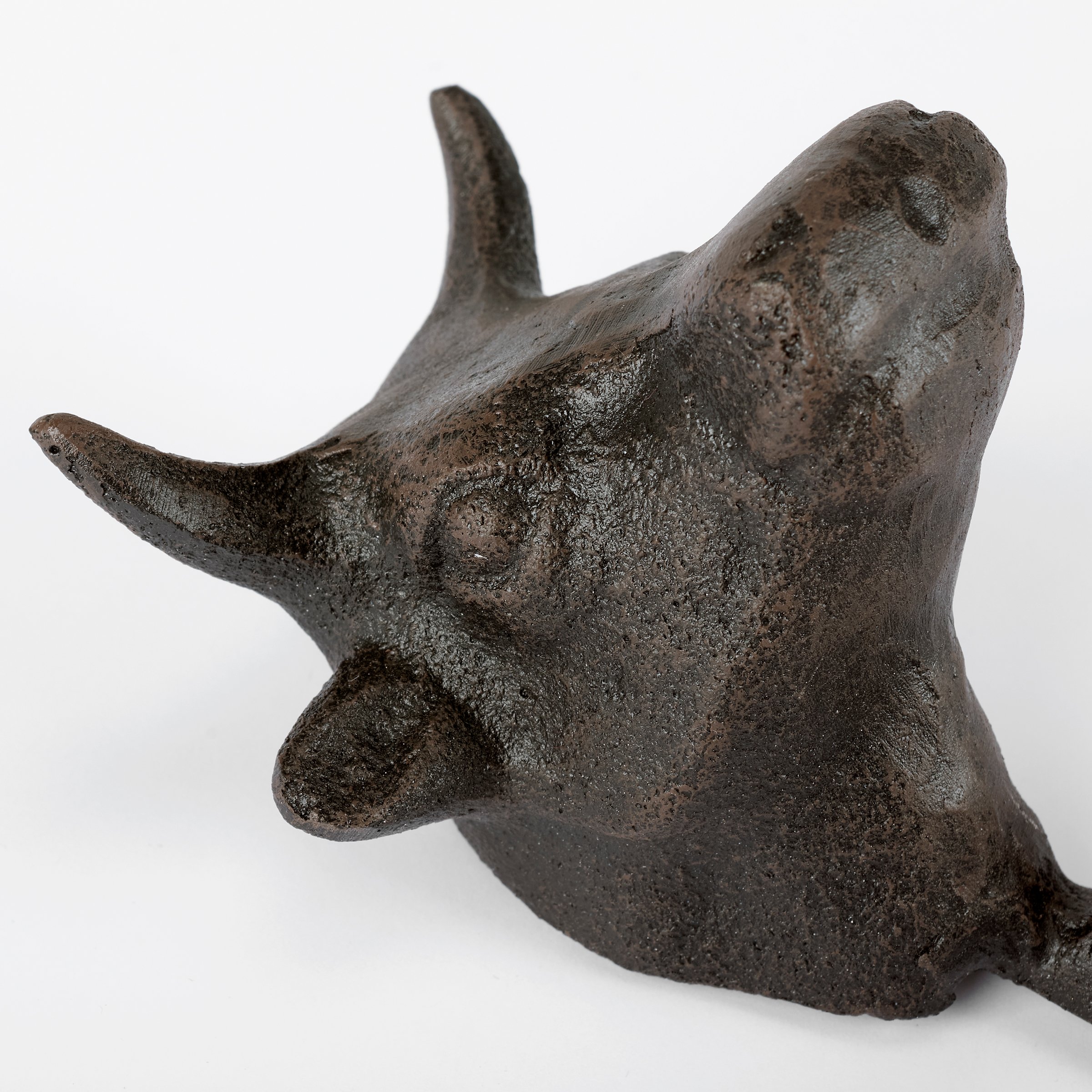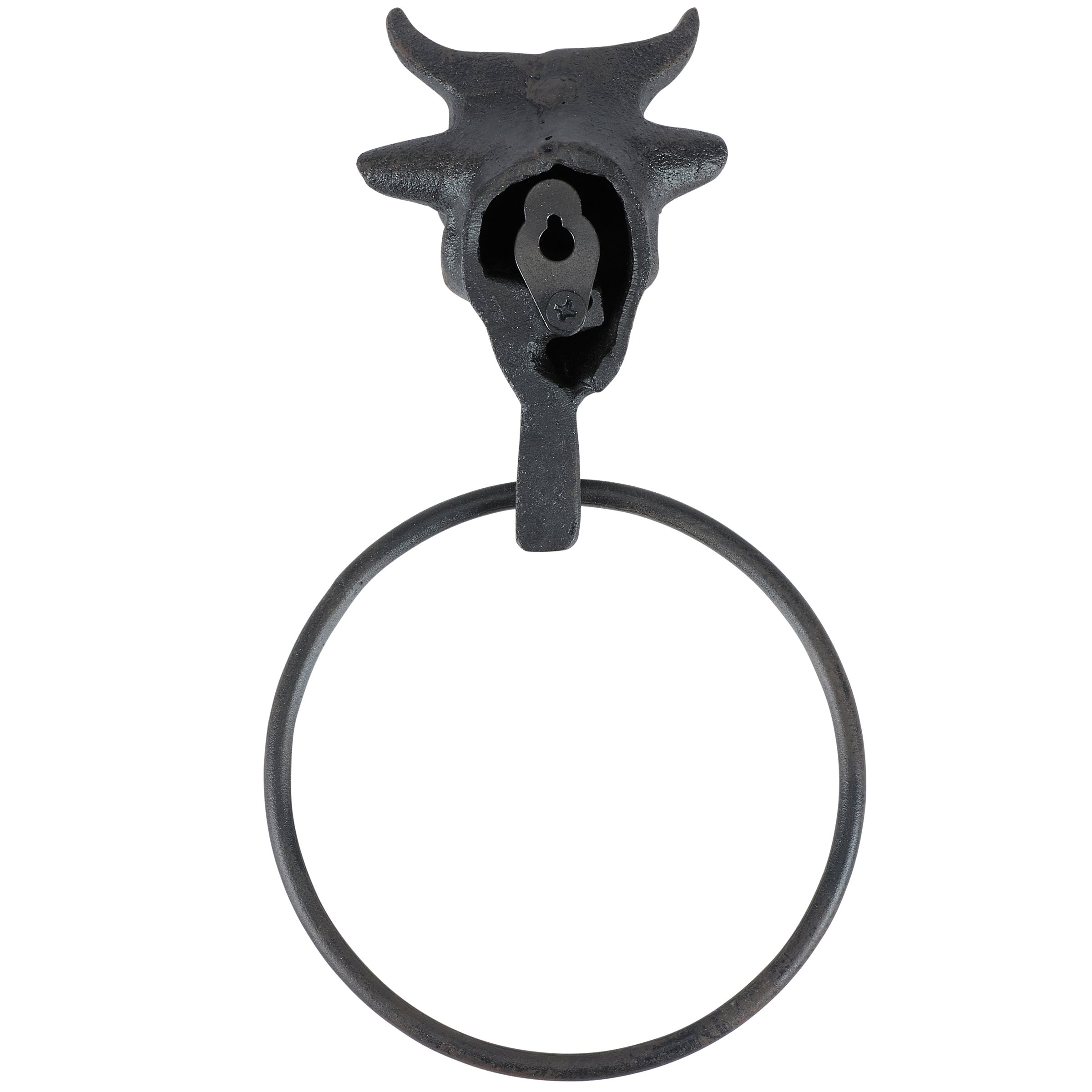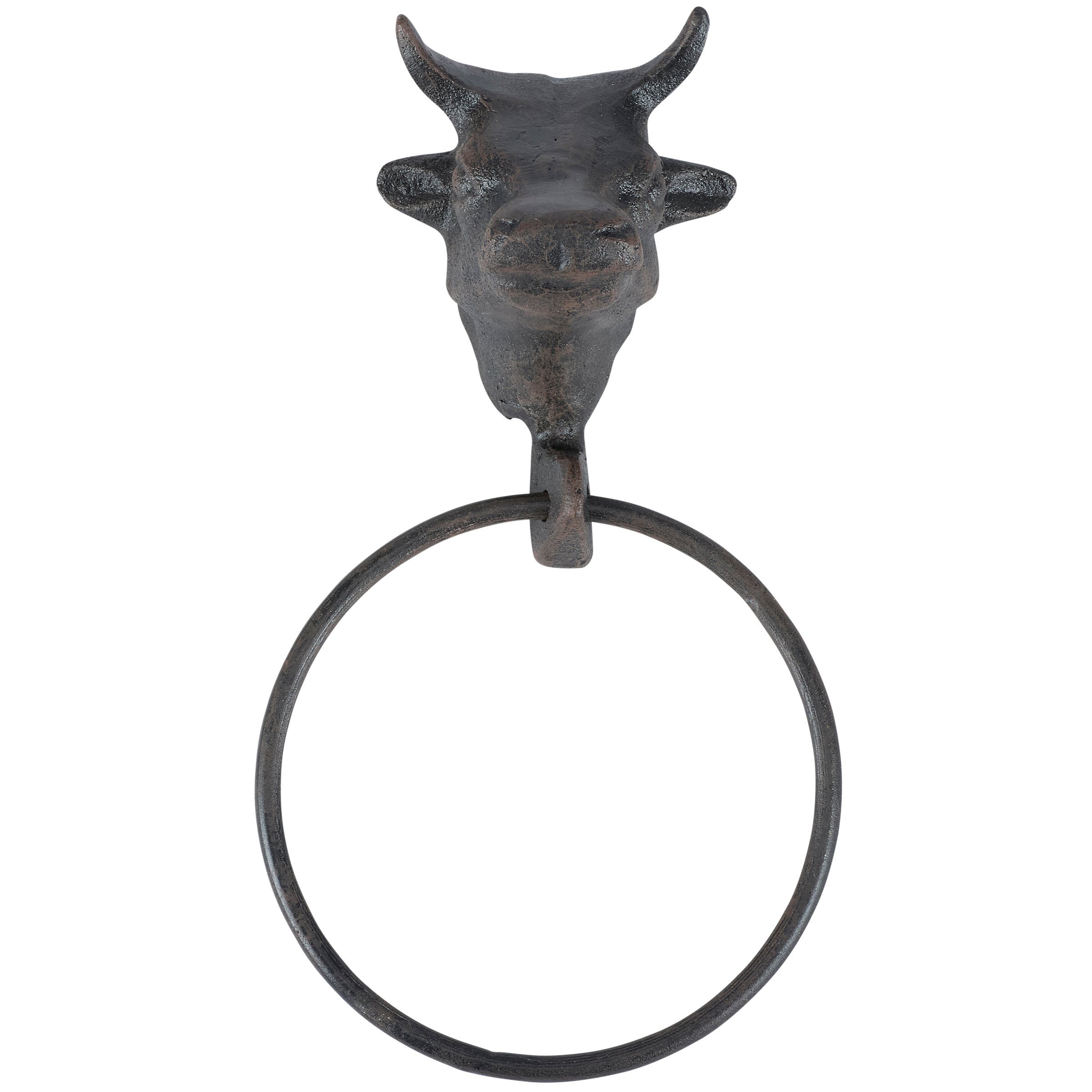 A metal towel holder from our Farmhouse Collection displaying a rustic bull inspired design. This sturdy towel holder features a sculpted bull head design with antique finish and attached ring to place hand towel. Our Bull's Head toilet paper holder is easy to hang for display and use via keyhole slot on the back. A rustic home accent that adds functional style to any bathroom or kitchen.