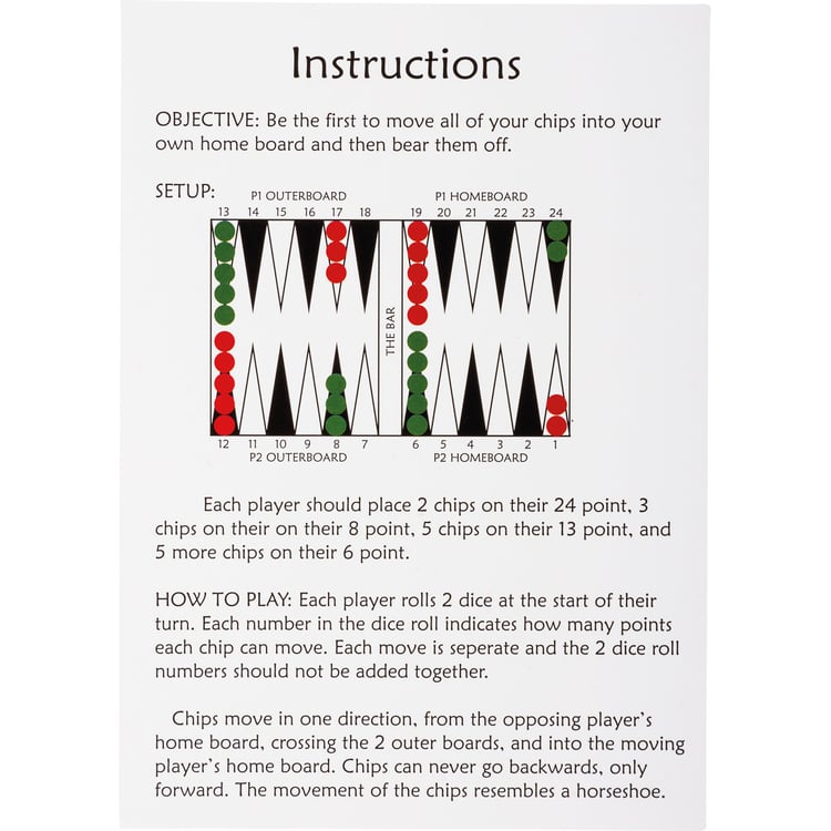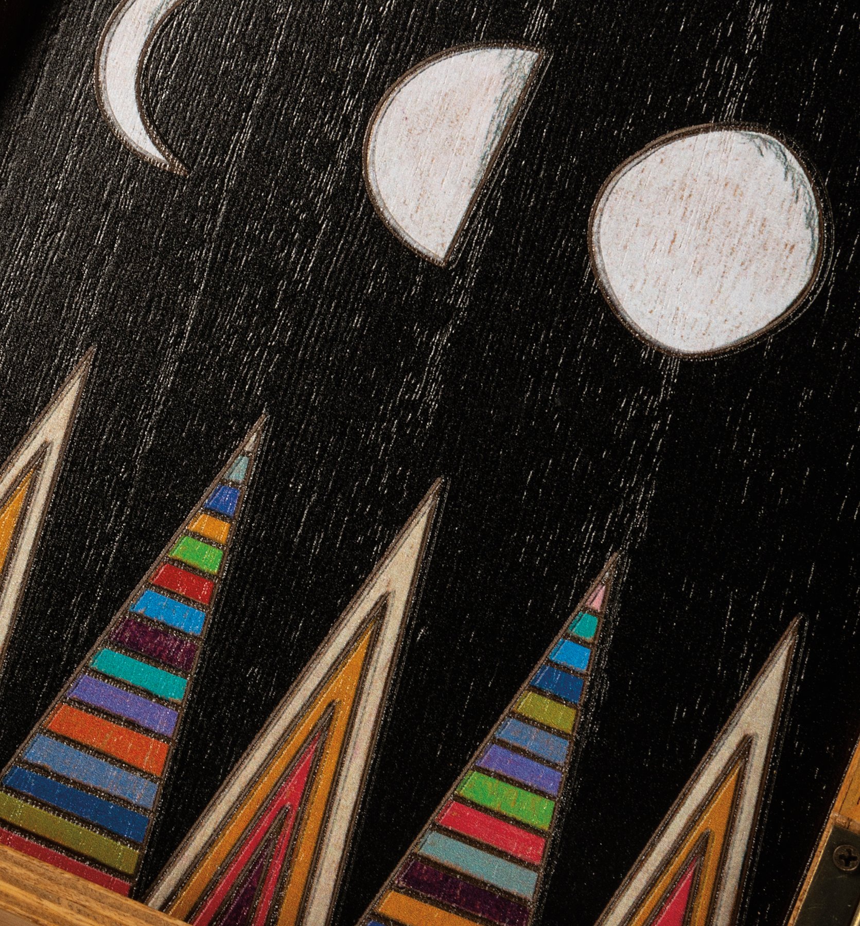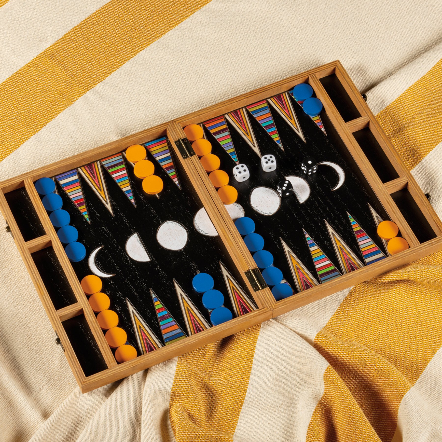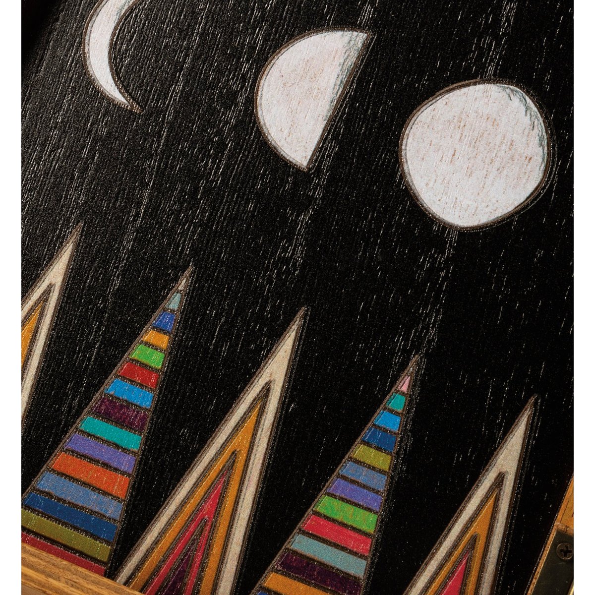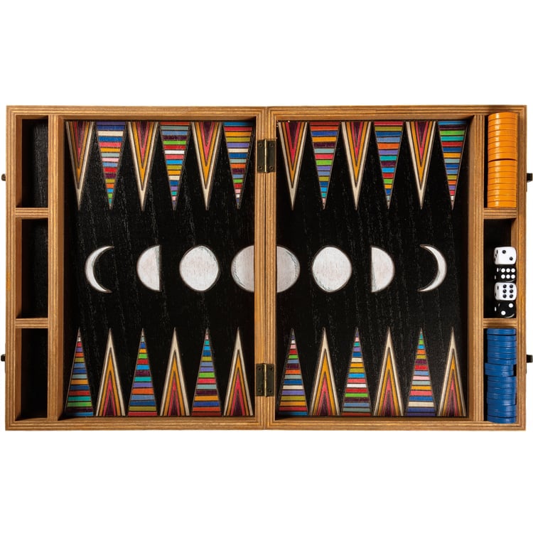 A wooden travel Backgammon game featuring intricate, vibrantly colored wood burned designs. Includes 34 game pieces that can be stored inside the latched game board. Also includes an instruction sheet.