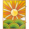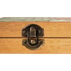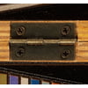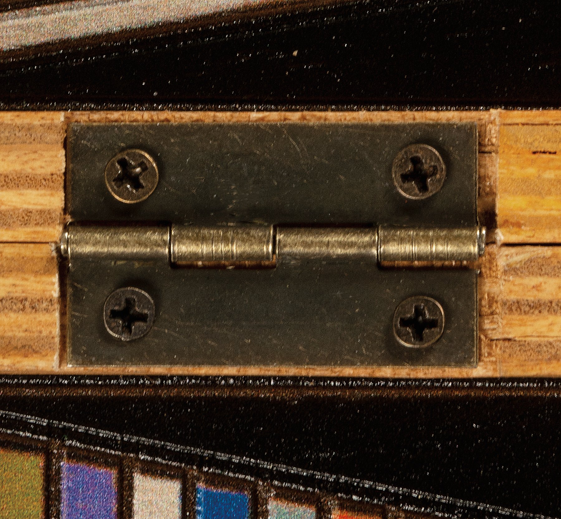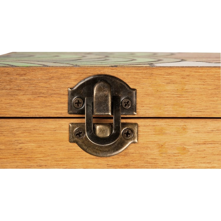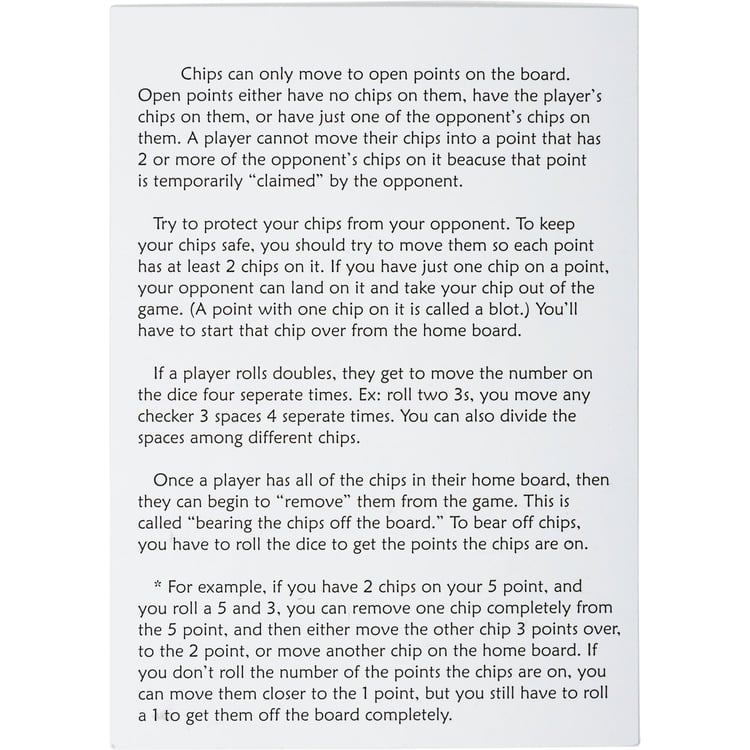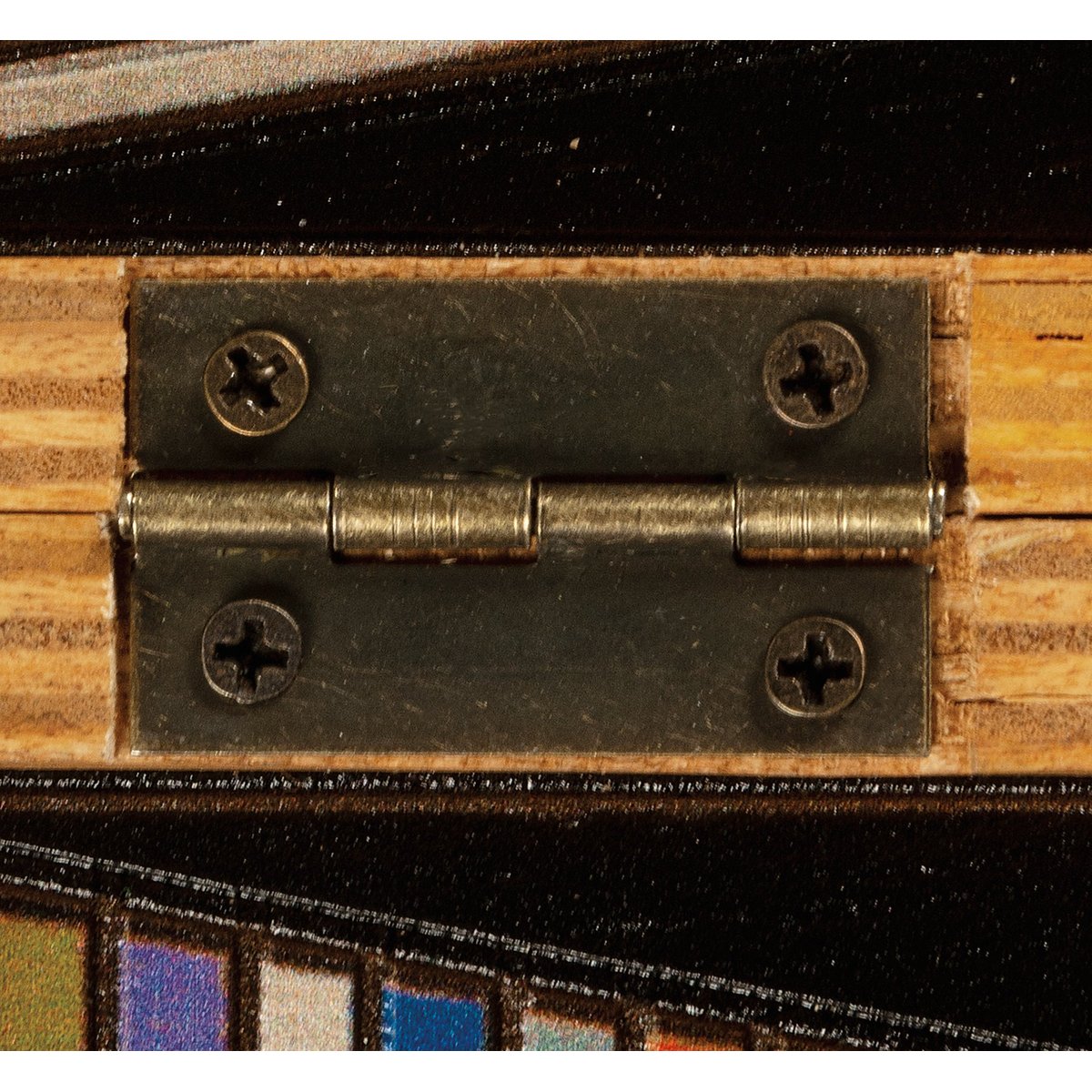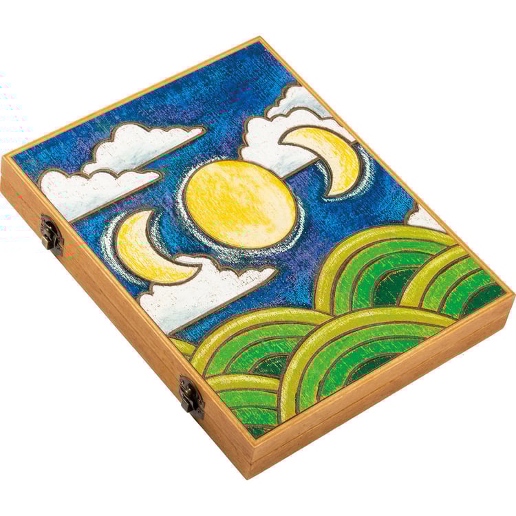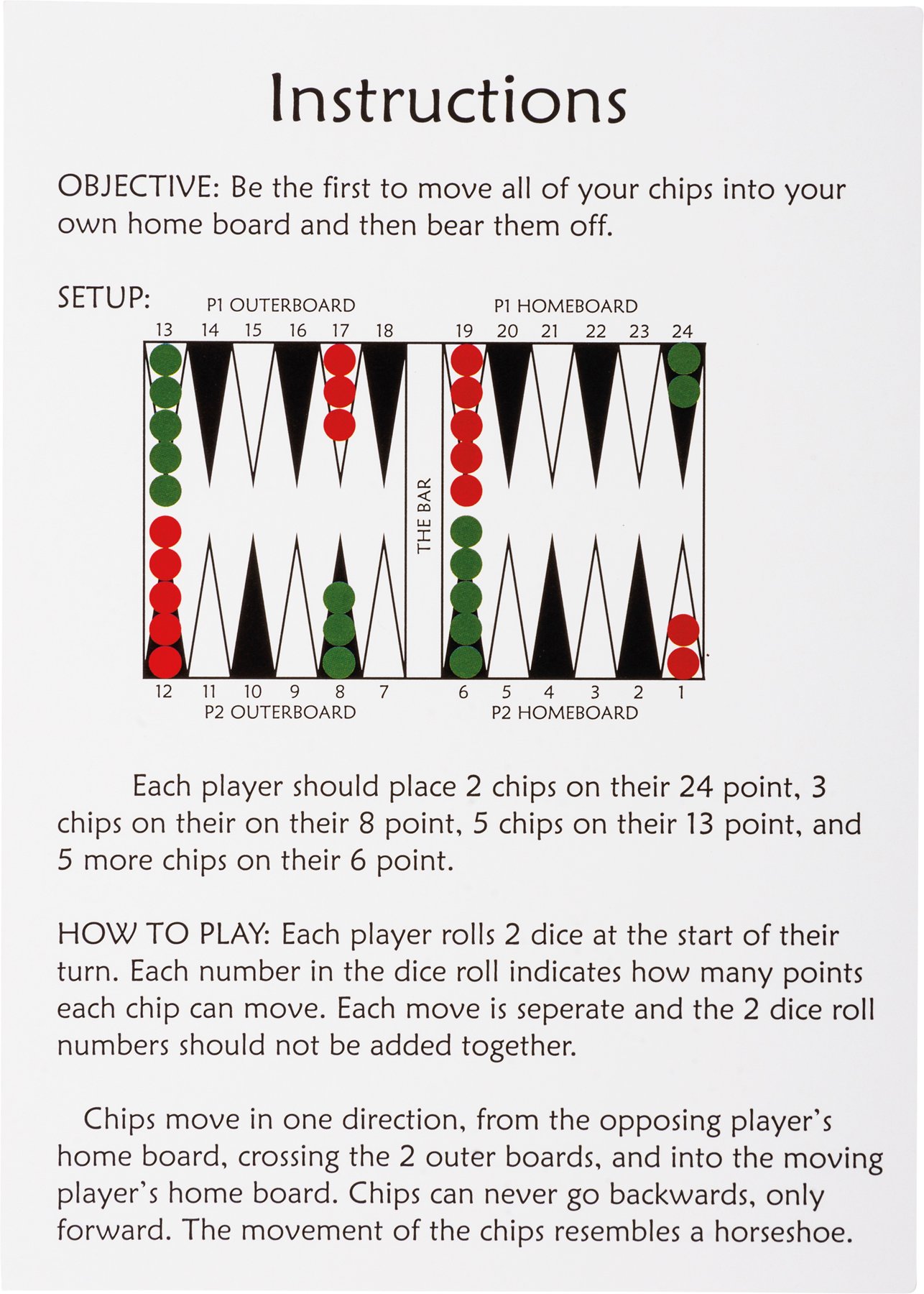 A wooden travel Backgammon game featuring intricate, vibrantly colored wood burned designs. Includes 34 game pieces that can be stored inside the latched game board. Also includes an instruction sheet.