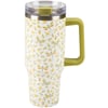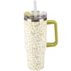A 40 oz stainless steel travel mug from our Garden Collection displaying a full wrap-around design of yellow butterflies and dragonflies with floral details. Design is replicated from original art hand painted in a watercolor style. Our Butterfly travel mug is insulated to keep beverages hot for 7 hours or cold for 11 hours and features a large handle as well as a narrow base that fits most cup holders making it great for on the go. Insulated travel mug includes a reusable straw and multipurpose lid with sip opening that can also be used with straw. Hand-wash only; do not microwave. A charming garden-themed accessory perfect for on-the-go.