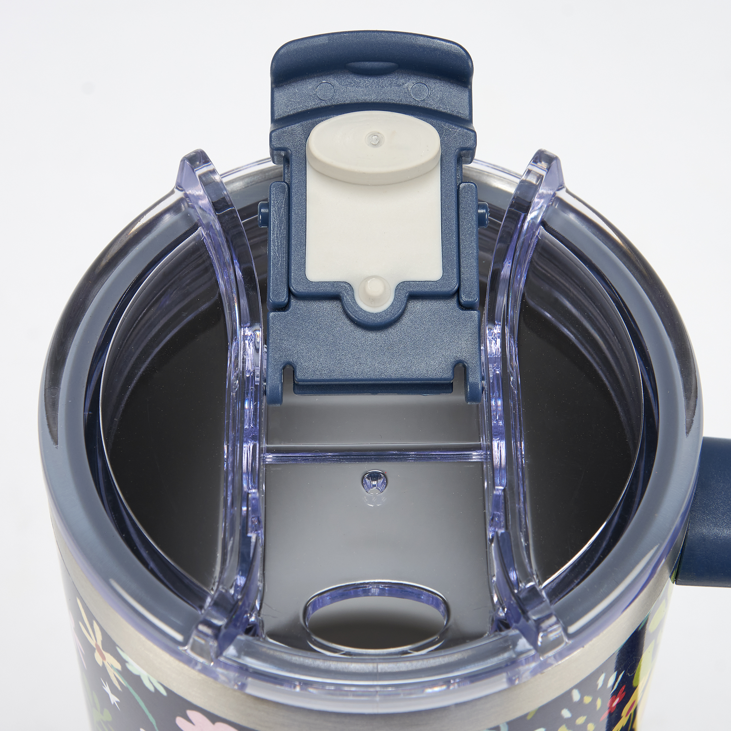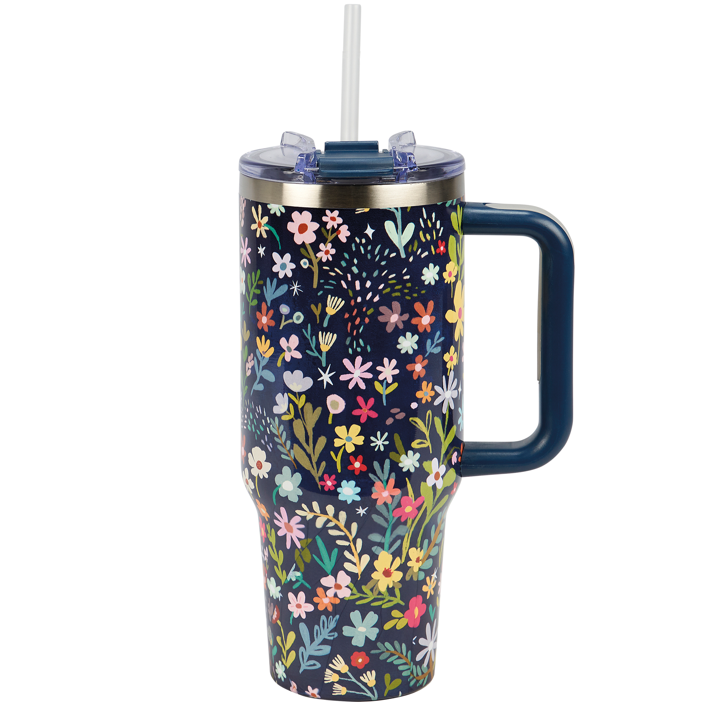 A 40 oz stainless steel travel mug from our Inspiration & Blooms Collection displaying a full wrap-around design of vibrant hand illustrated florals on a dark blue background. Our Dark Florals travel mug is insulated to keep beverages hot for 7 hours or cold for 11 hours and features a large handle as well as a narrow base that fits most cup holders making it great for on the go. Insulated travel mug includes a reusable straw and multipurpose lid with sip opening that can also be used with straw. Hand-wash only; not microwave safe. A stylish floral-themed accessory perfect for on-the-go hydration.