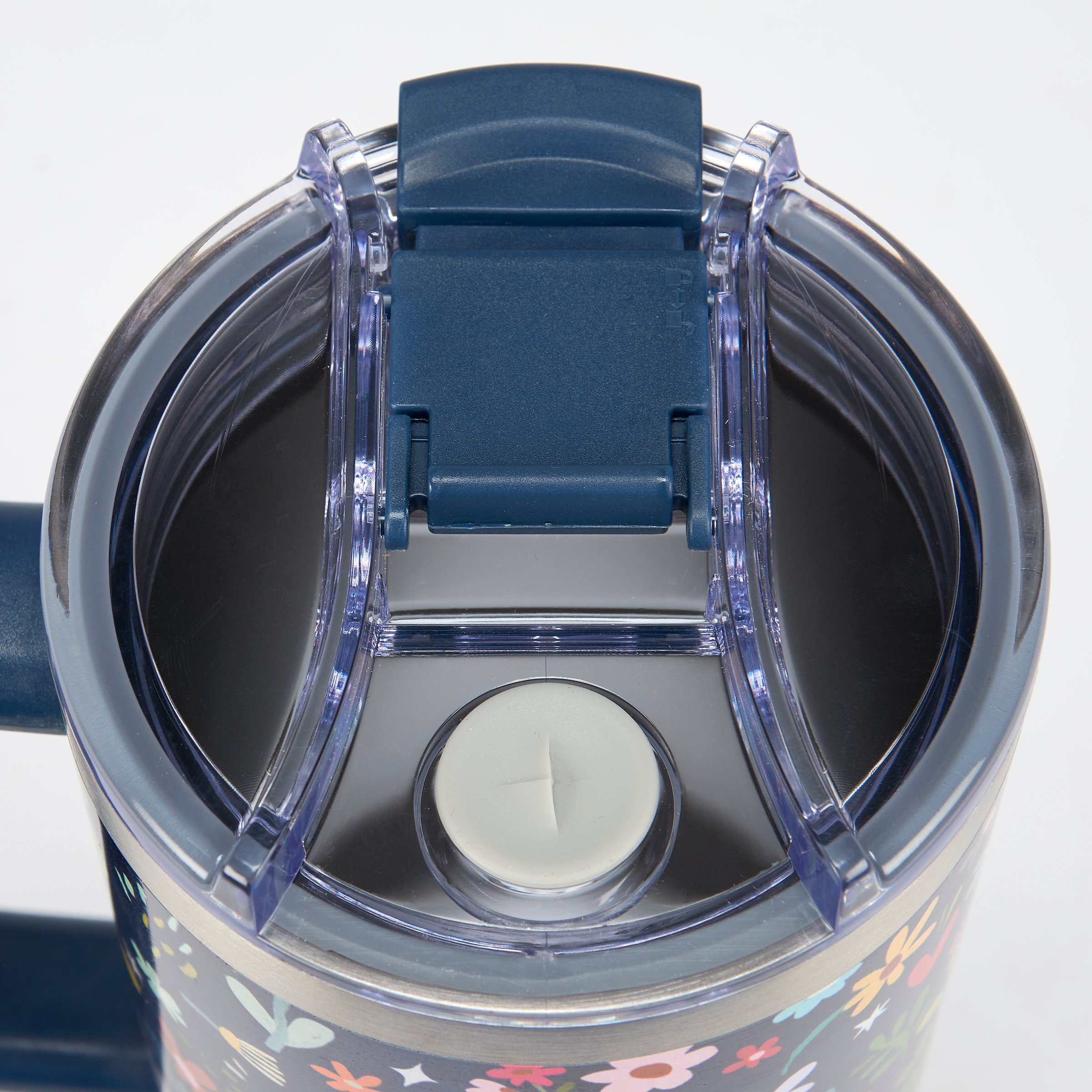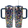 A 40 oz stainless steel travel mug from our Inspiration & Blooms Collection displaying a full wrap-around design of vibrant hand illustrated florals on a dark blue background. Our Dark Florals travel mug is insulated to keep beverages hot for 7 hours or cold for 11 hours and features a large handle as well as a narrow base that fits most cup holders making it great for on the go. Insulated travel mug includes a reusable straw and multipurpose lid with sip opening that can also be used with straw. Hand-wash only; not microwave safe. A stylish floral-themed accessory perfect for on-the-go hydration.