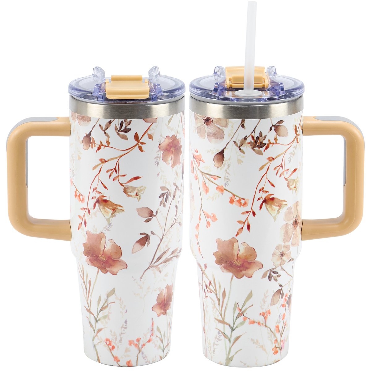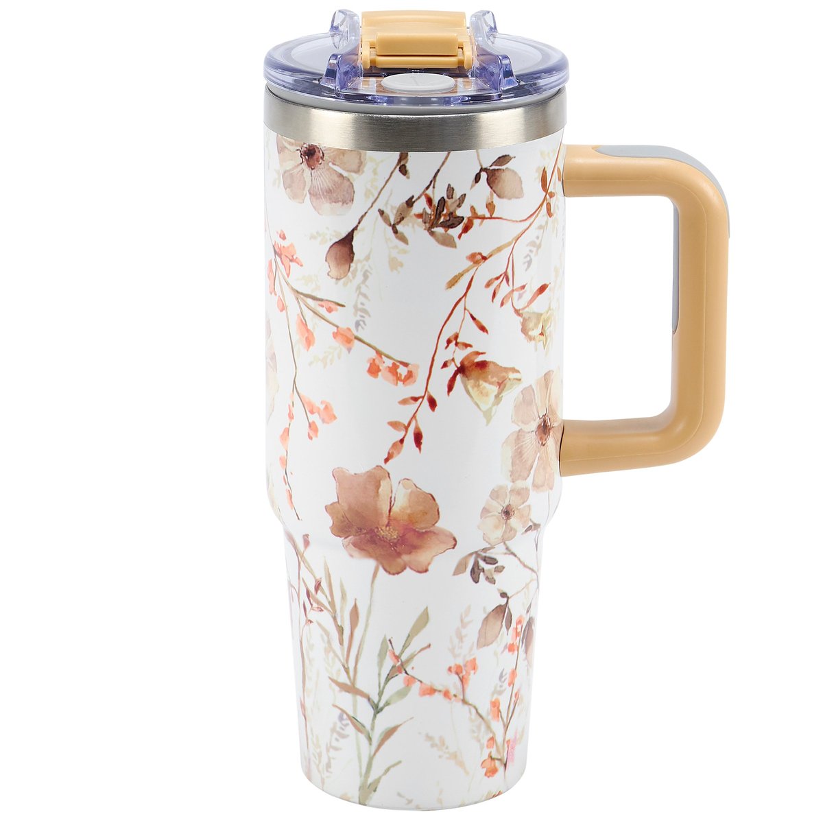 A 30 oz stainless steel travel mug from our Cottagecore Collection displaying a full wrap-around design of charming wildflowers. Garden design is replicated from original art hand painted in a unique watercolor style. Our medium Cottage Garden travel mug is insulated to keep beverages hot for 5 hours or cold for 9 hours and features a large handle as well as a narrow base that fits most cup holders making it great for on the go. Insulated travel mug includes a reusable straw and multipurpose lid with sip opening that can also be used with straw. Hand-wash only; not microwave safe. A stylish nature-themed accessory perfect for on-the-go hydration.