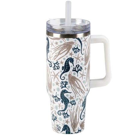 A 40 oz stainless steel travel mug from our Beach Collection displaying a full wrap-around pattern of various sea creatures in deep nautical color palette. Our Sea Creatures travel mug is insulated to keep beverages hot for 7 hours or cold for 11 hours and features a large handle as well as a narrow base that fits most cup holders making it great for on the go. Insulated travel mug includes a reusable straw and multipurpose lid with sip opening that can also be used with straw. Hand-wash only; do not microwave. A fun ocean-themed accessory perfect for on-the-go.