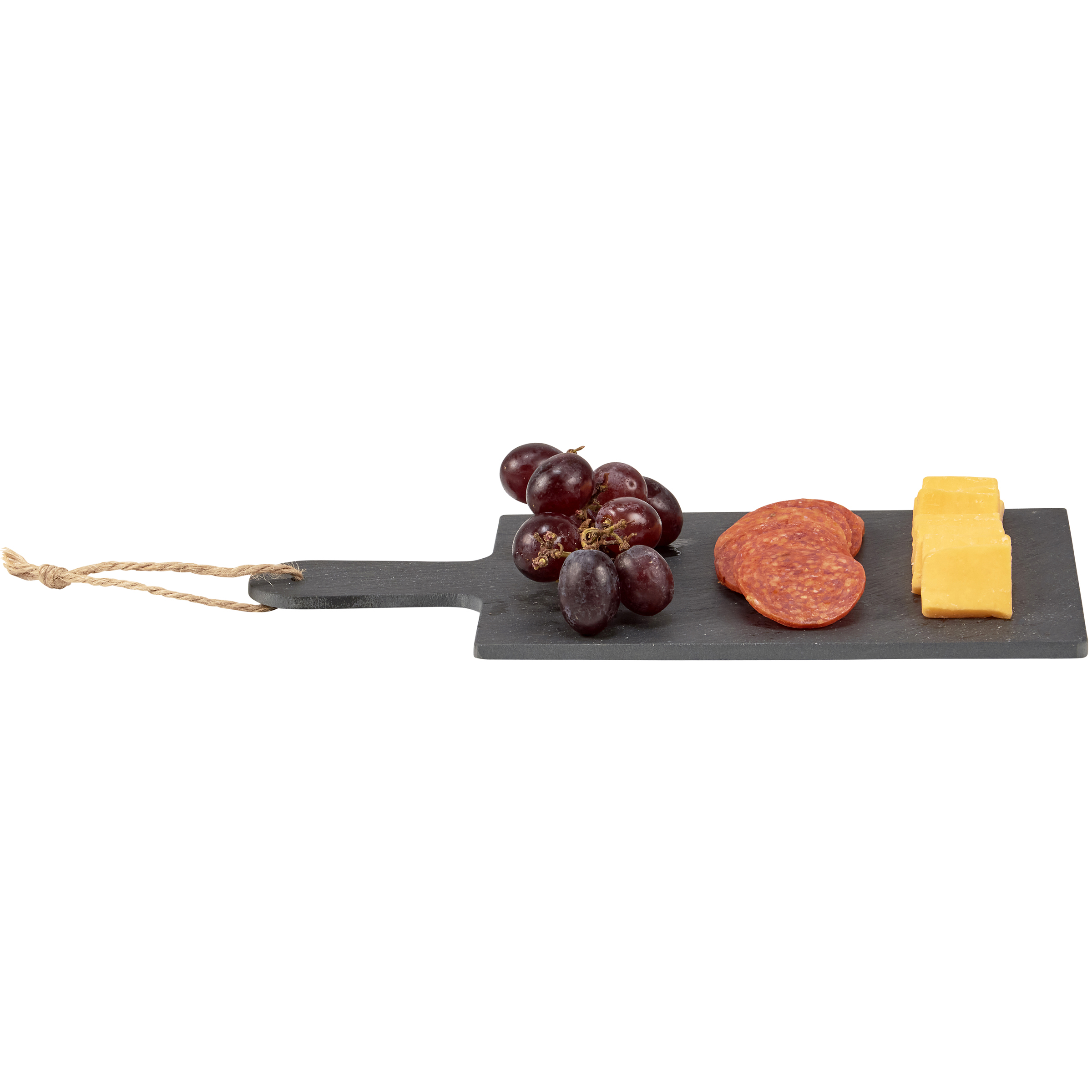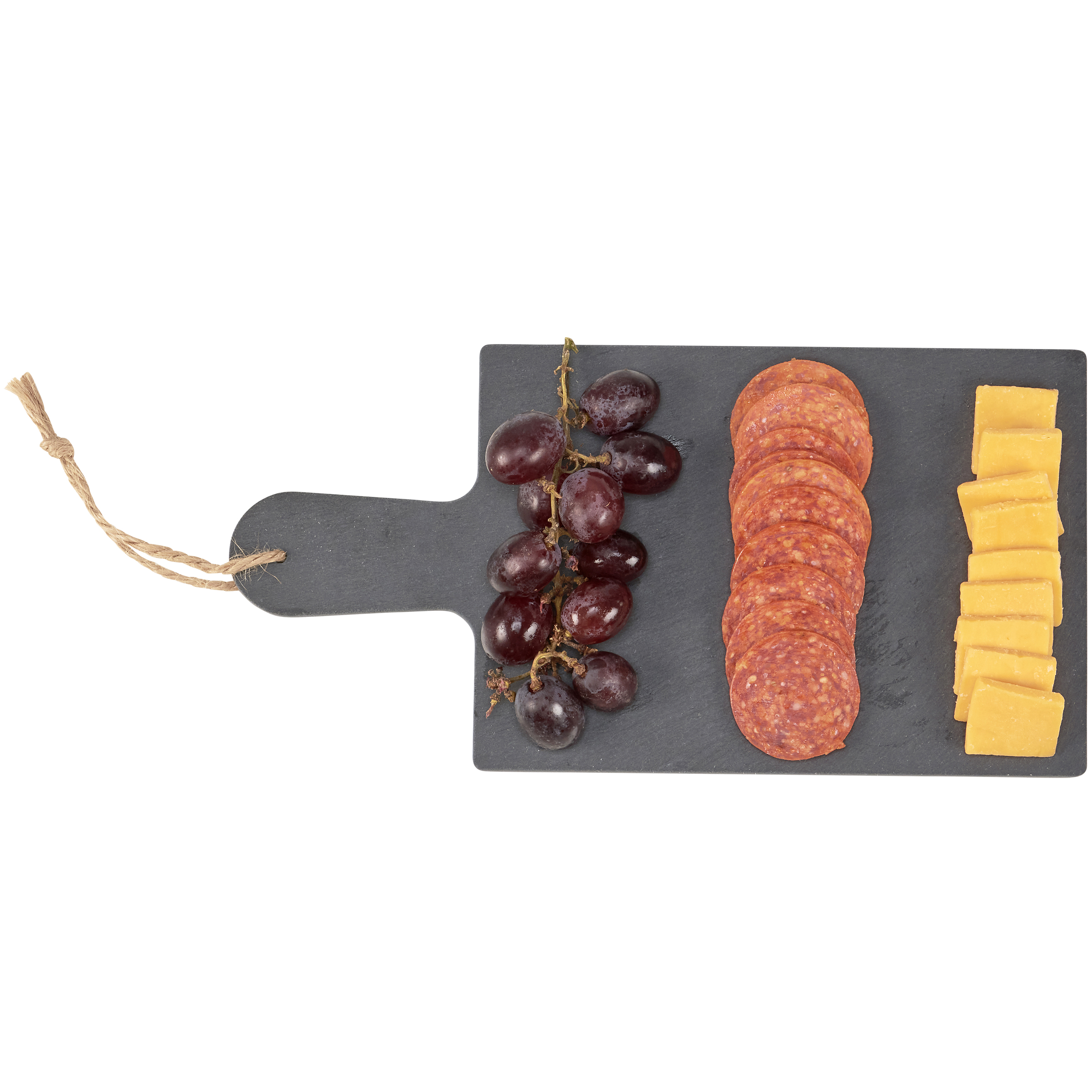 A slate serving tray from our Tabletop Collection designed to use as a stylish charcuterie board. Our Charcuterie tray features a rectangle shape with a food-safe surface and a handle to easily carry. Tray also features soft pads on the bottom for safe placement and jute loop for hanging when not in use. A stylish kitchen accessory perfect for everyday gatherings.