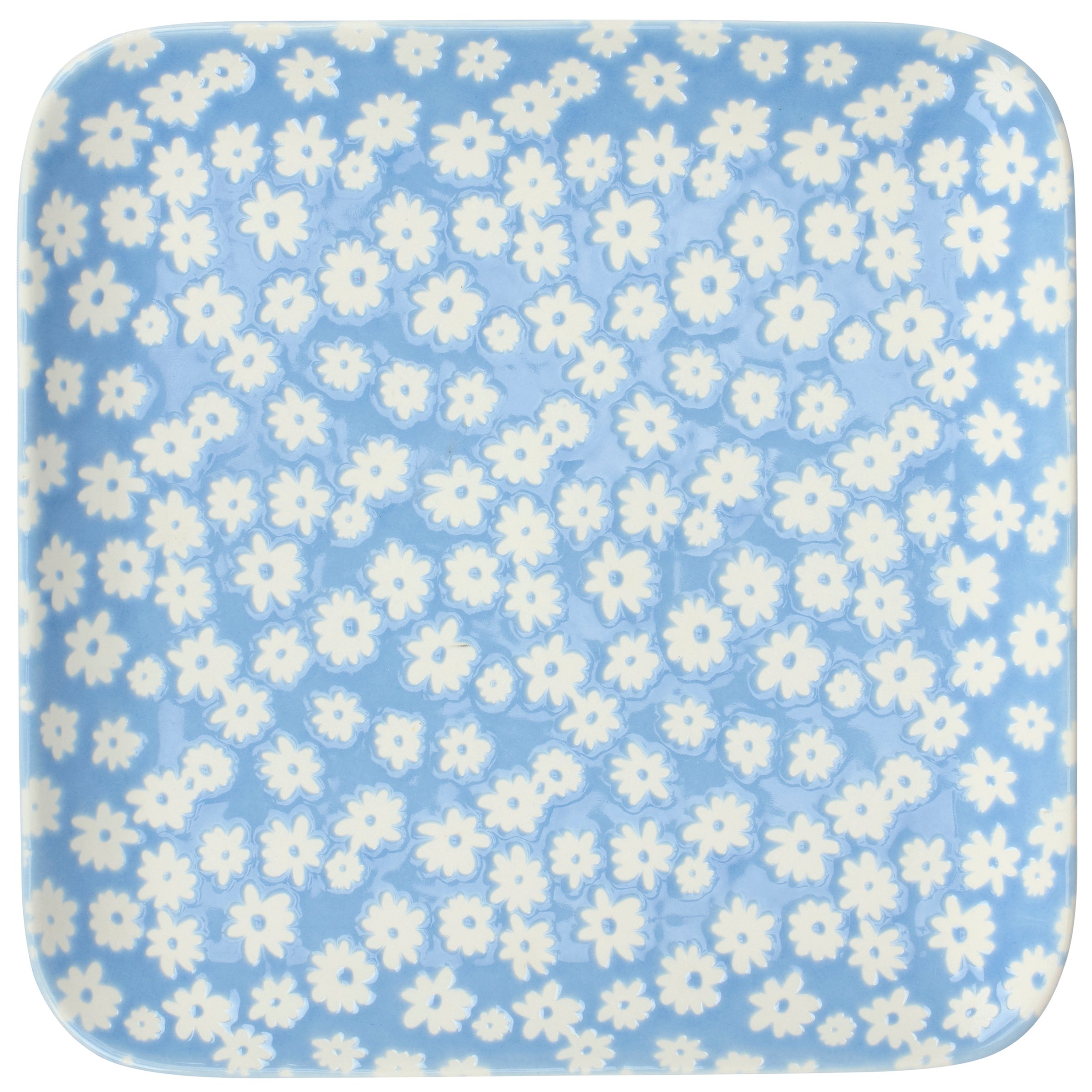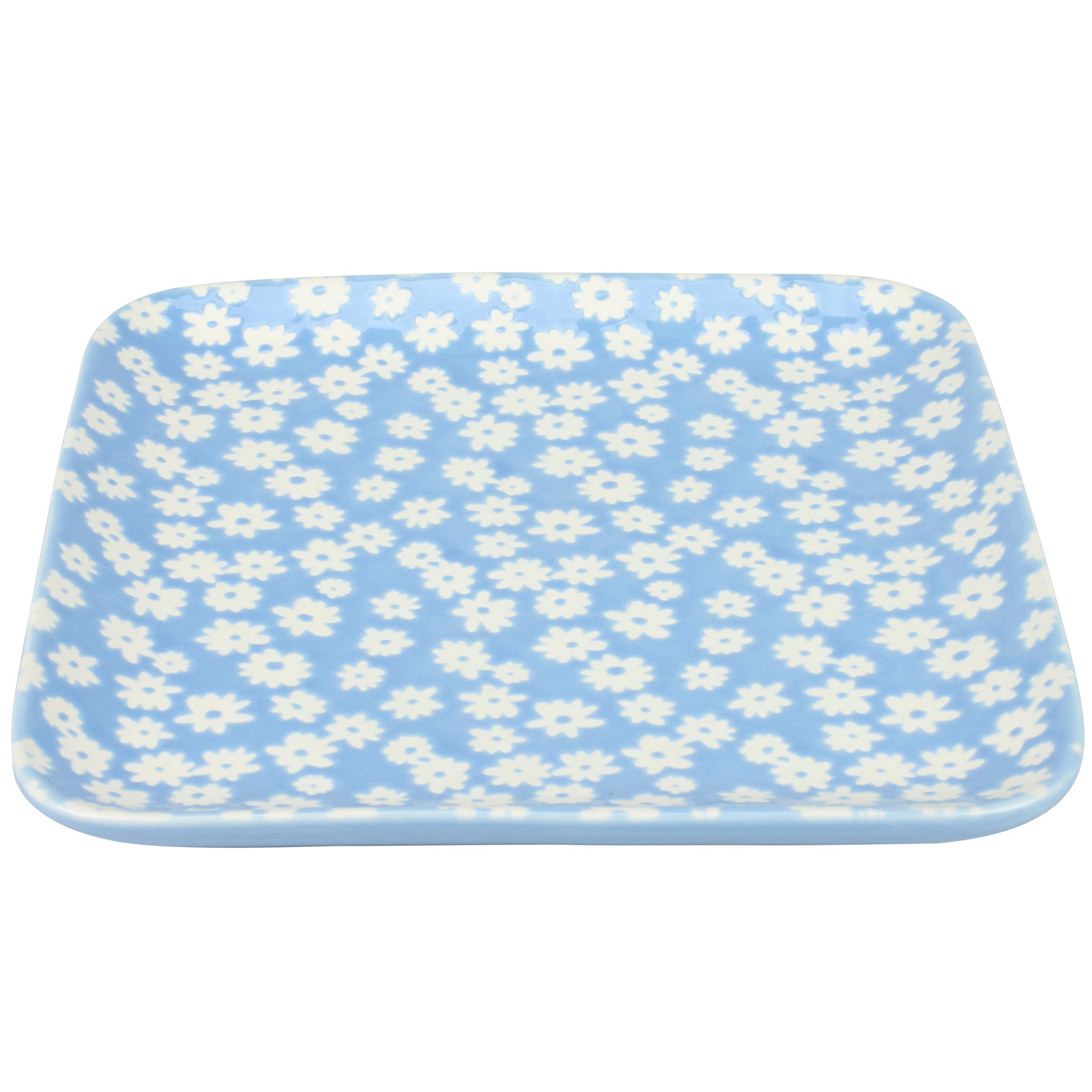 A stoneware tray from our Garden Collection displaying a sky blue glaze finish with a delightful daisy pattern debossed on the inside of the tray. Our Daisy tray is conveniently microwave, oven, dishwasher, and food safe for easy use. A piece of daisy themed tableware perfect for garden inspired tablescapes.