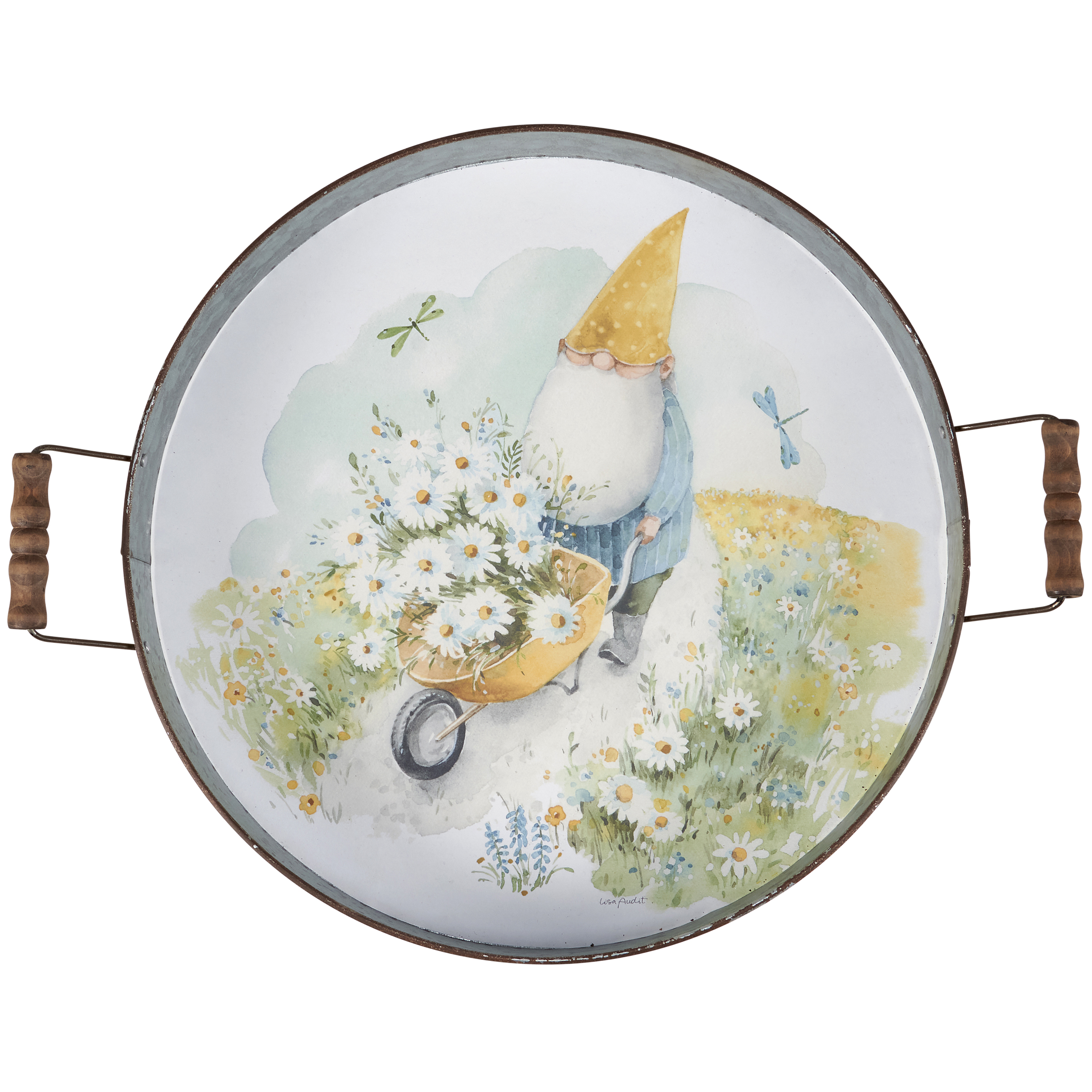 A galvanized metal tray from our Garden Collection displaying a charming scene of a gnome gathering daisies with a yellow gingham pattern along the sides of the tray. Designs are replicated from original art hand painted in a delicate watercolor style. Our Daisy Gnome tray includes dual metal handles with wooden grips for easy carrying. Decorative use only; not food safe. A charming daisy-themed home accent perfect for everyday use.