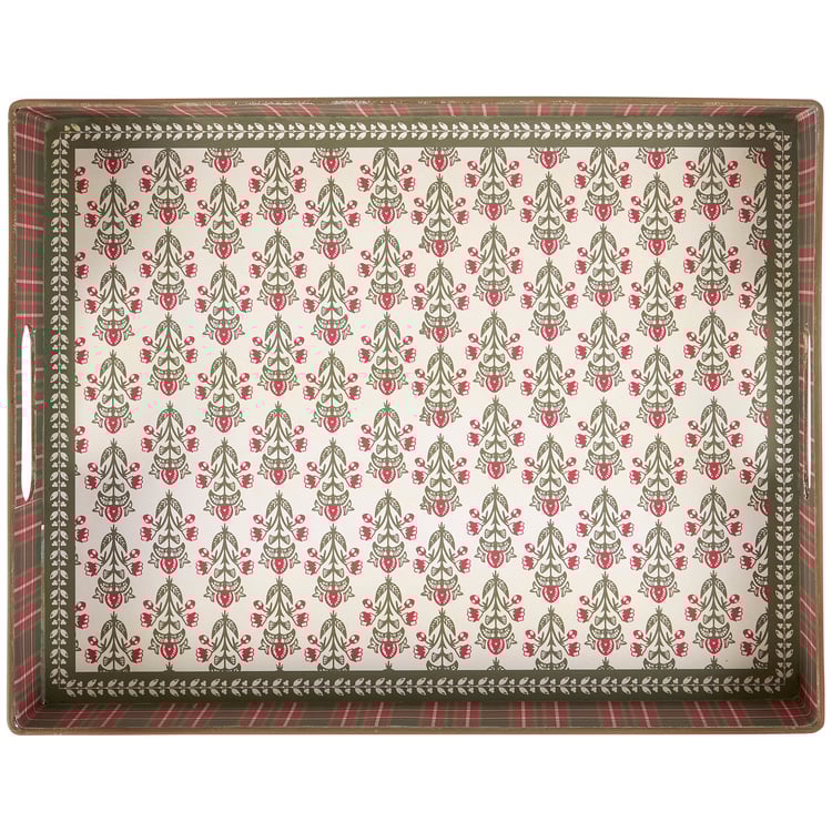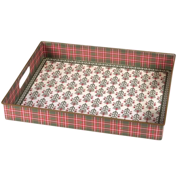 A metal tray from our Christmas Collection featuring a vintage floral block print pattern that coordinates well with rustic cabin decor and a complementing holiday plaid pattern along the sides. Our Floral Block Print tray includes dual side handles for easy carrying. A rustic cabin-themed Christmas home accent perfect for seasonal use.