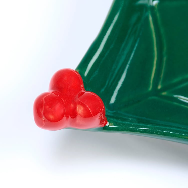 A ceramic tray from our Christmas Collection displaying a sculpted holly leaf design with glaze finish and debossed details. Our Holly Leaf tray can be used for Christmas tablescapes or displaying seasonal accents. Hand wash only; not microwave safe. A fun Christmas home accent perfect for seasonal decorating.