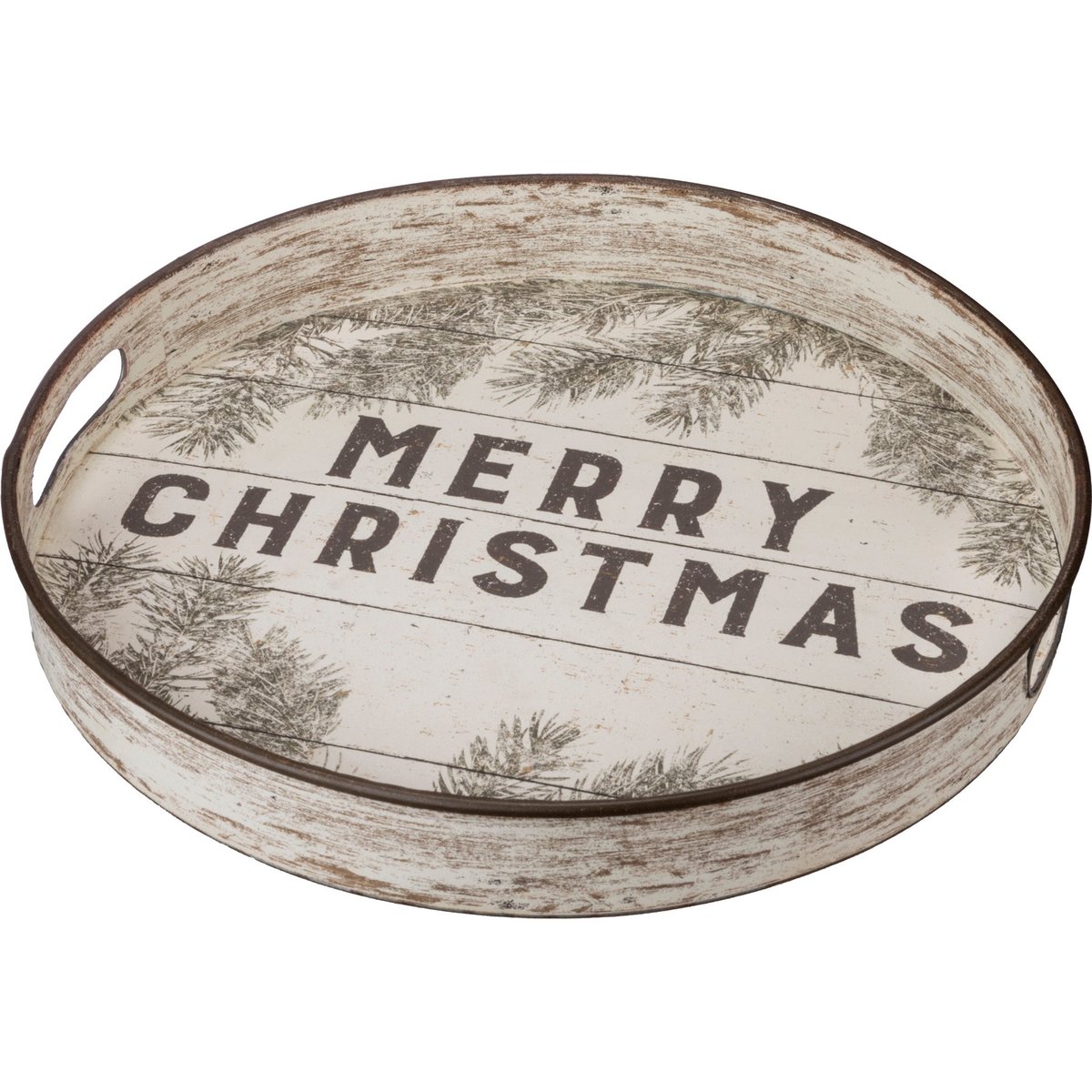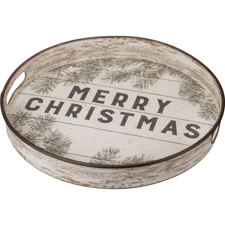 A round rustic metal holiday tray from our Christmas Collection lending a "Merry Christmas" sentiment over a slatted wood background print with tree branch designs. The Merry Christmas tray features distressed details on inside and outside of rim with cutout handles. Complements well with other pieces in collection.