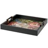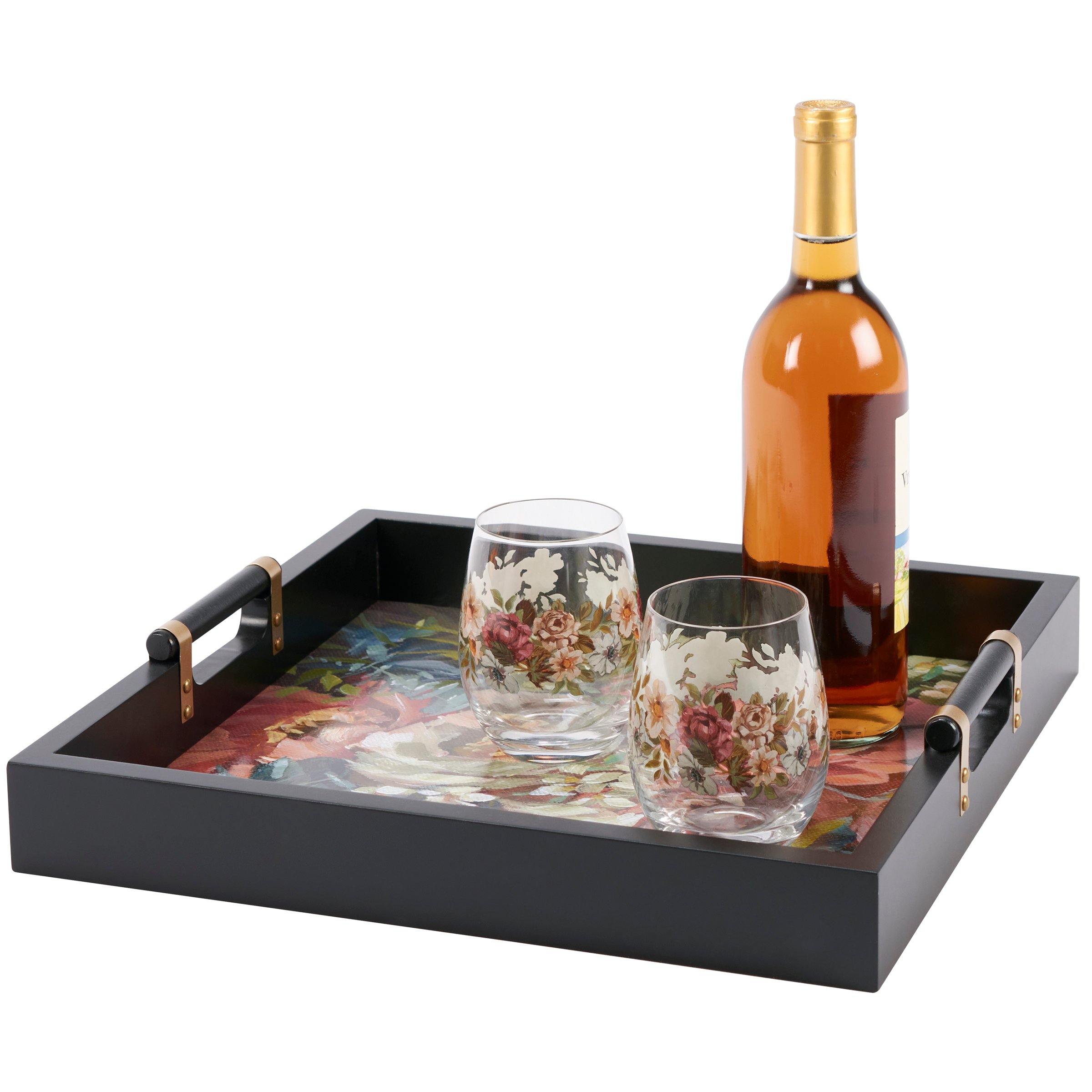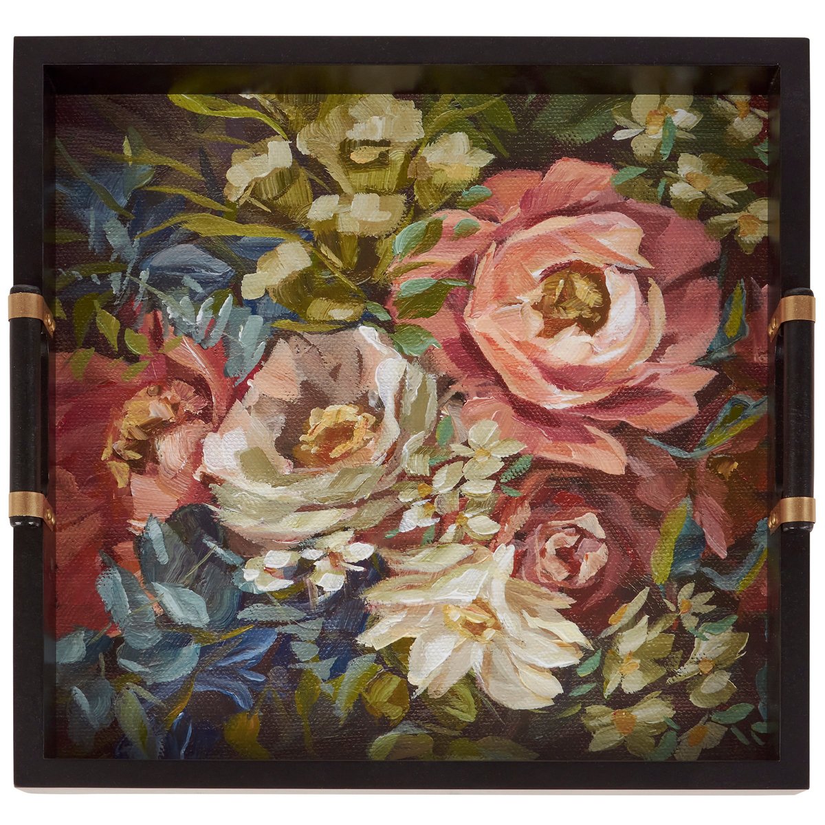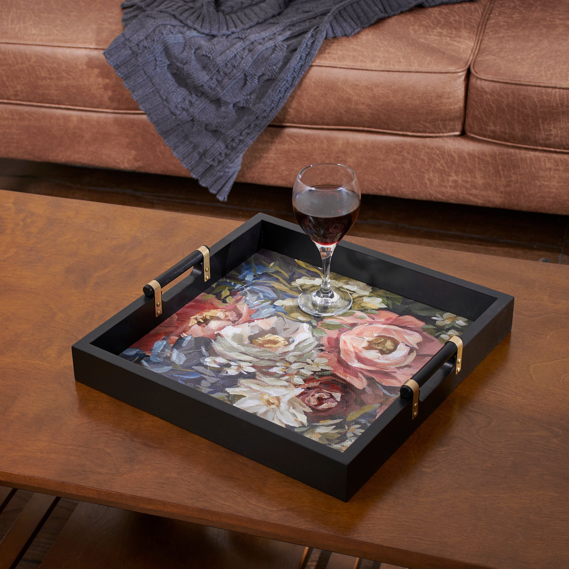 A wooden tray from our Moody Collection displaying florals with a deep color palette inside the tray. Design is replicated from original art hand painted in a unique watercolor style. Tray can be used for serving guests or as a unique home accent. Our Moody Floral tray includes side handles with metallic gold metal accents for easy carrying. A stylish piece of serveware perfect for everyday gatherings.
