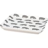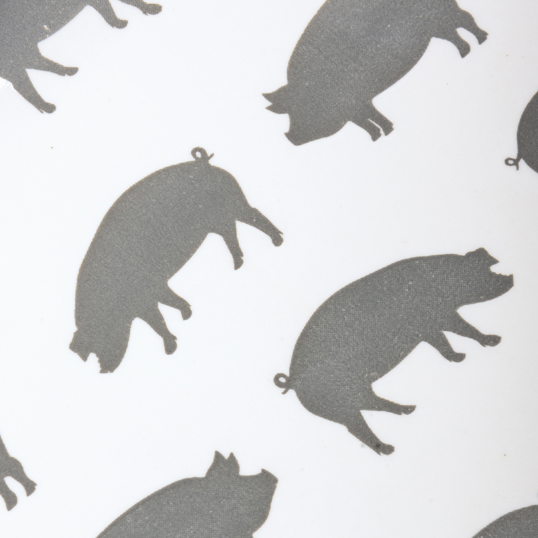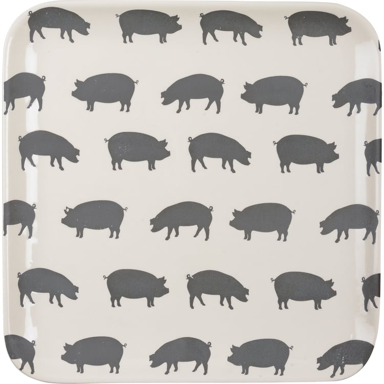 A white stoneware tray featuring debossed gray pig designs. Our Pig tray is microwave, oven, dishwasher, and food safe.