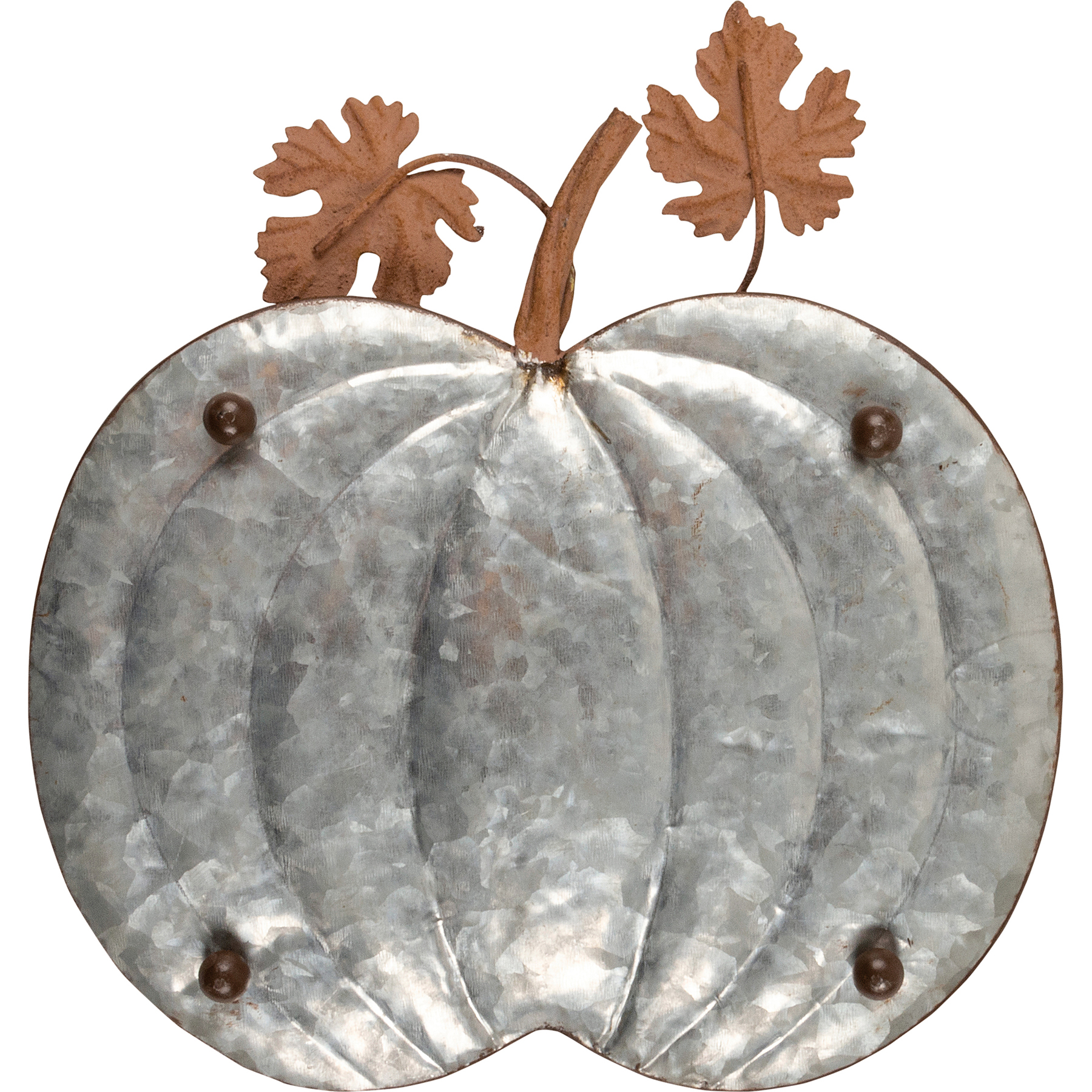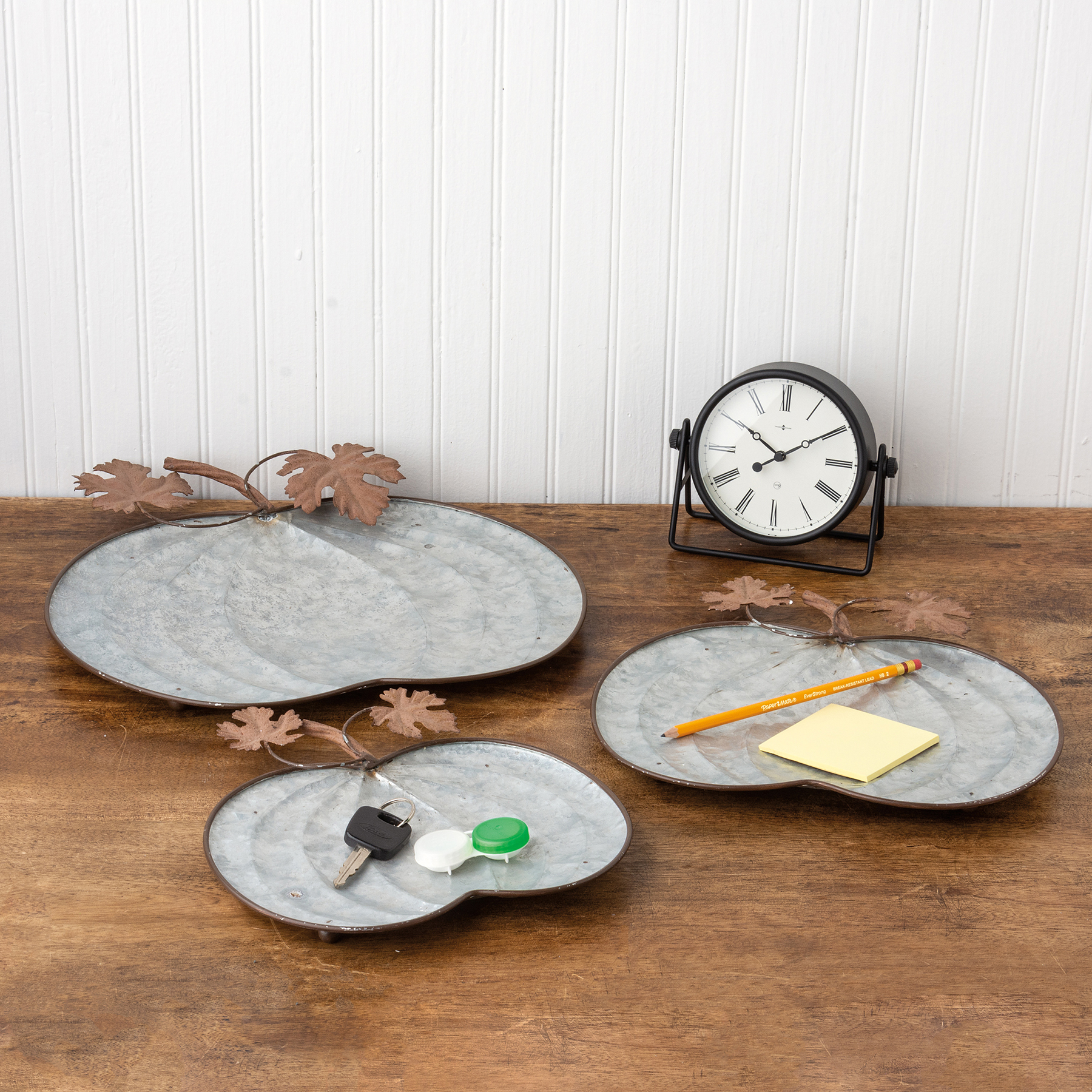 A set of three pumpkin-shaped galvanized metal trays with attached metal leaf accents for added interest. Our Galvanized Pumpkins tray set is perfect for holding food, drinks, plants, and other décor items.