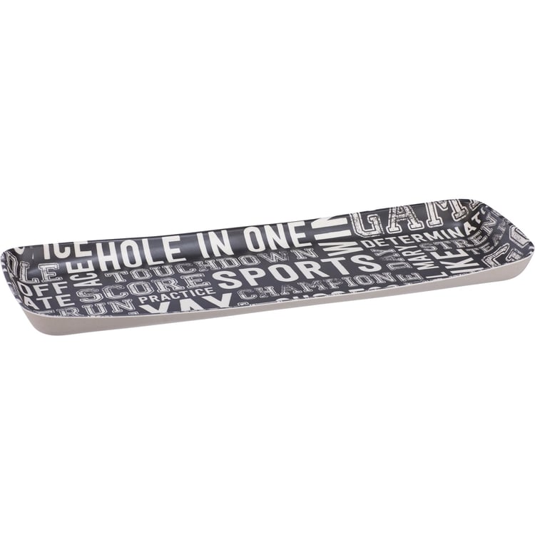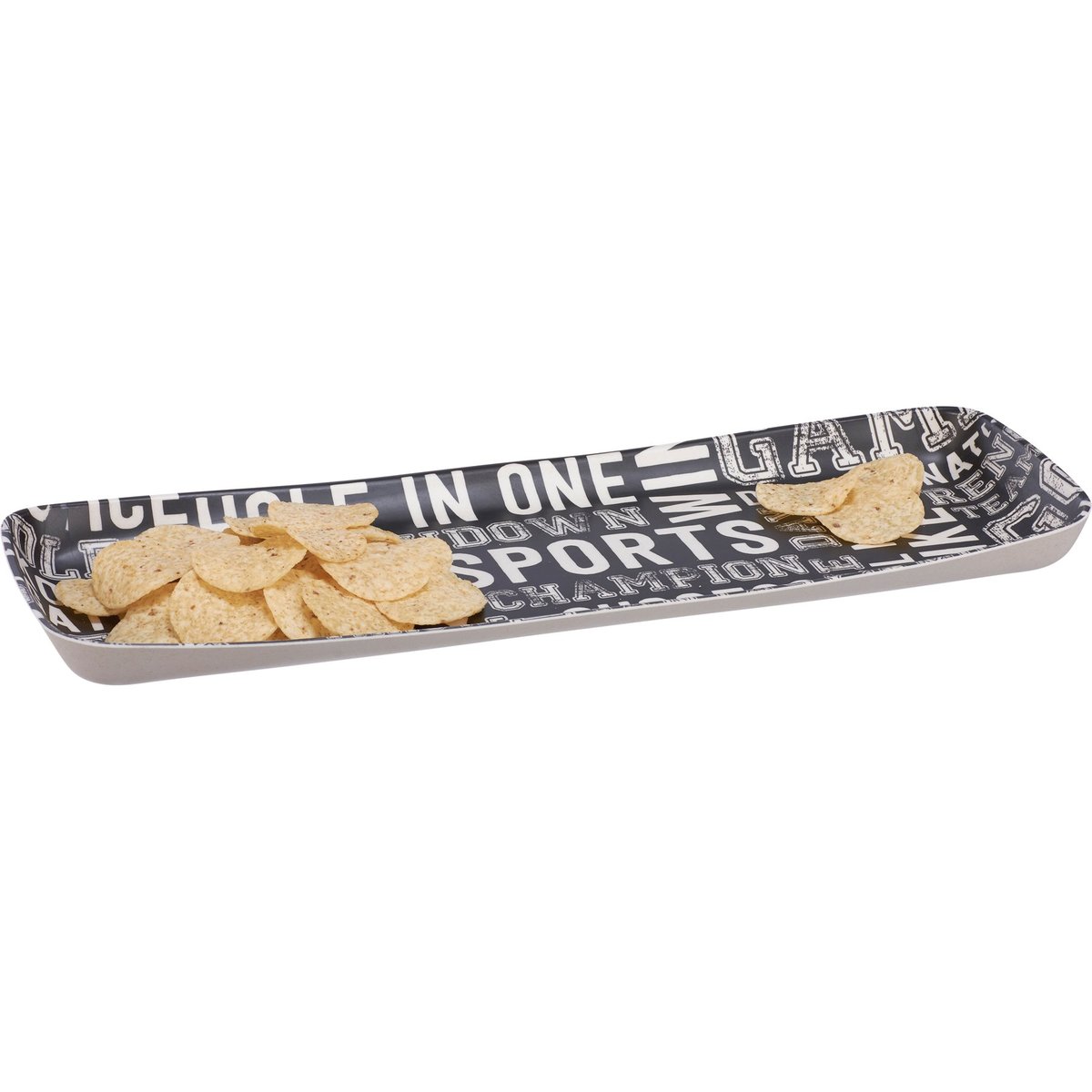 Perfect for gameday, a wide tray displaying sports-themed phrases in an all-over design with distressed detailing. Tray is large enough to place multiple food items throughout. Complements well with coordinating pieces in our Sports Collection for a cohesive table display. Our Sports tray is made with bamboo fiber, melamine, and BPA-free. Dishwasher safe; do not microwave.