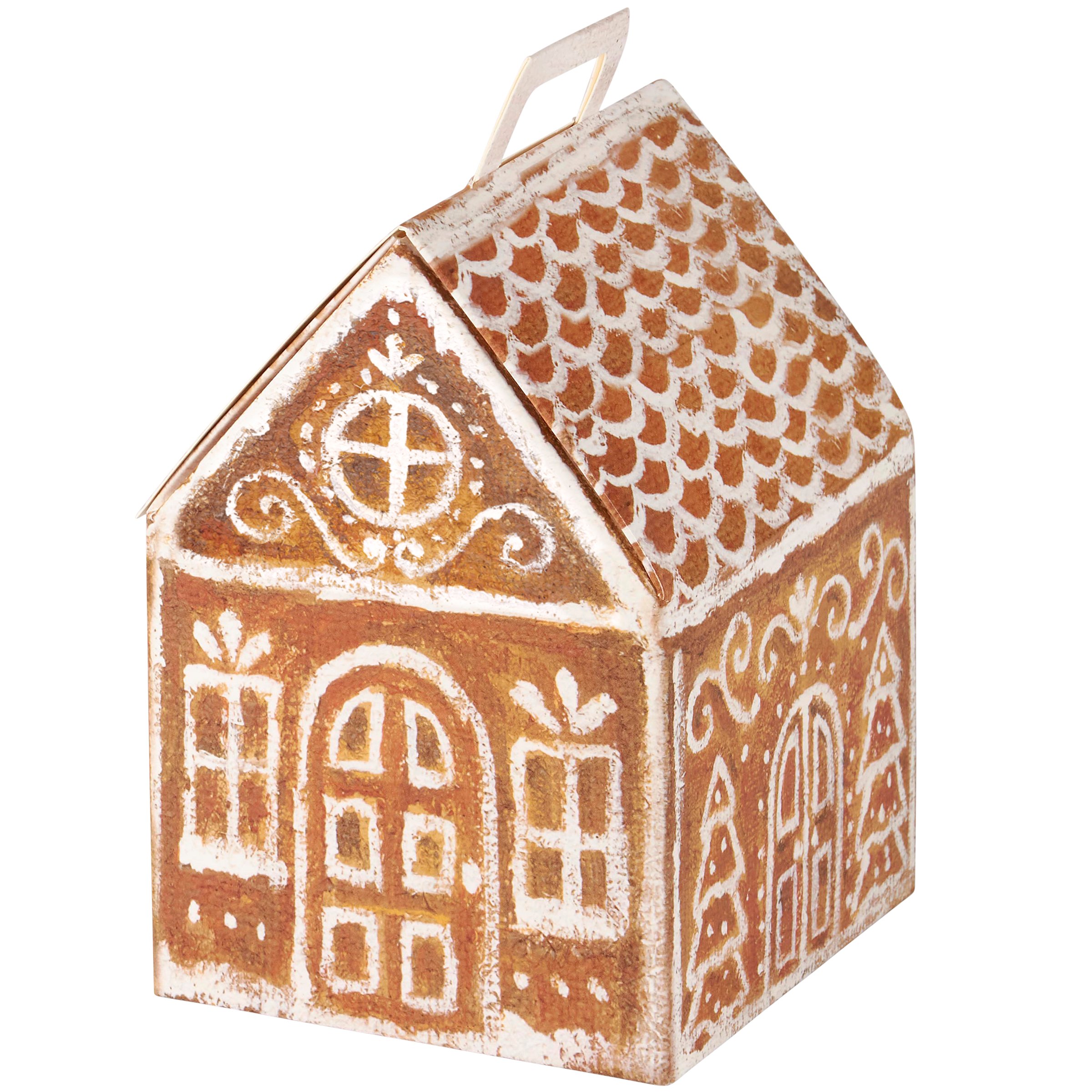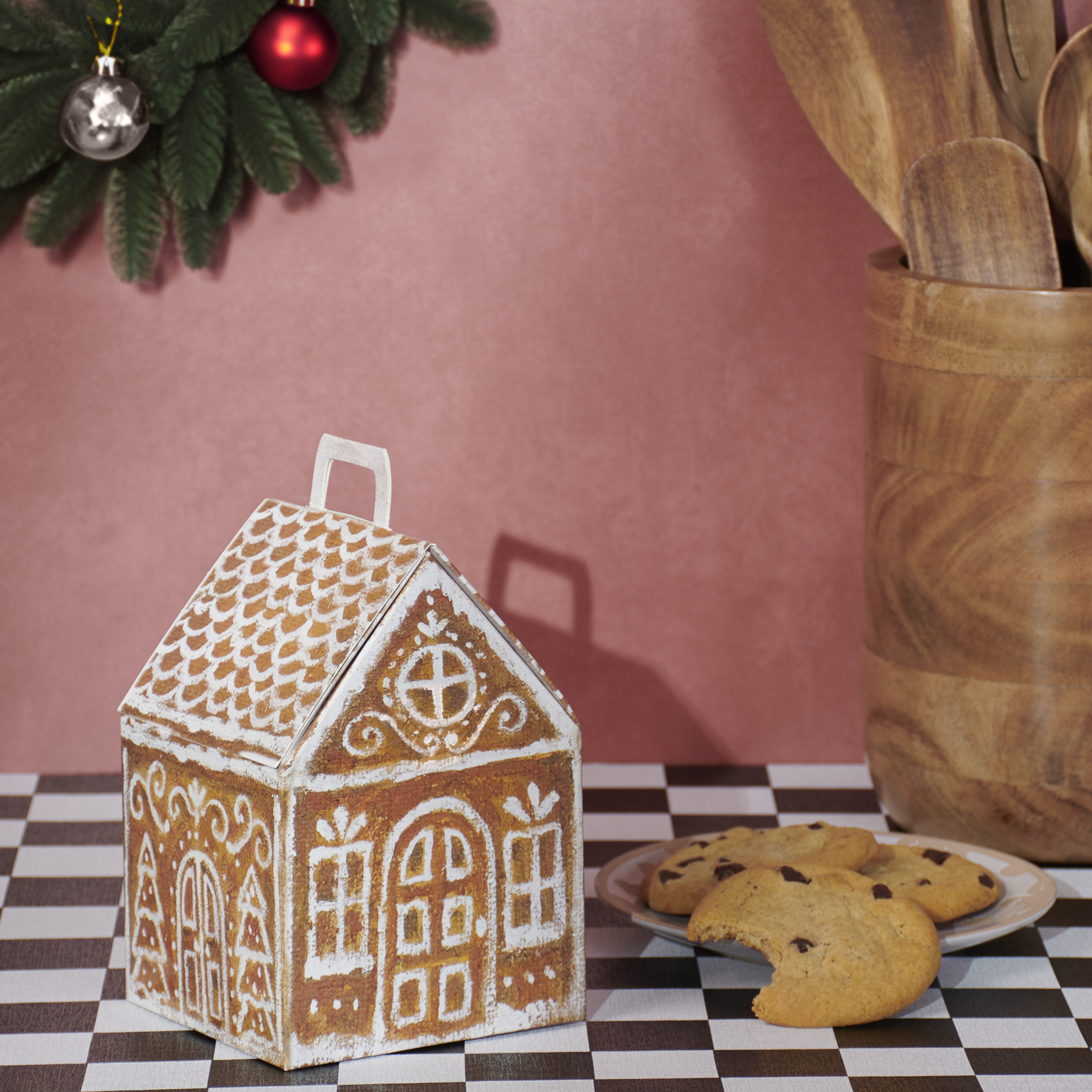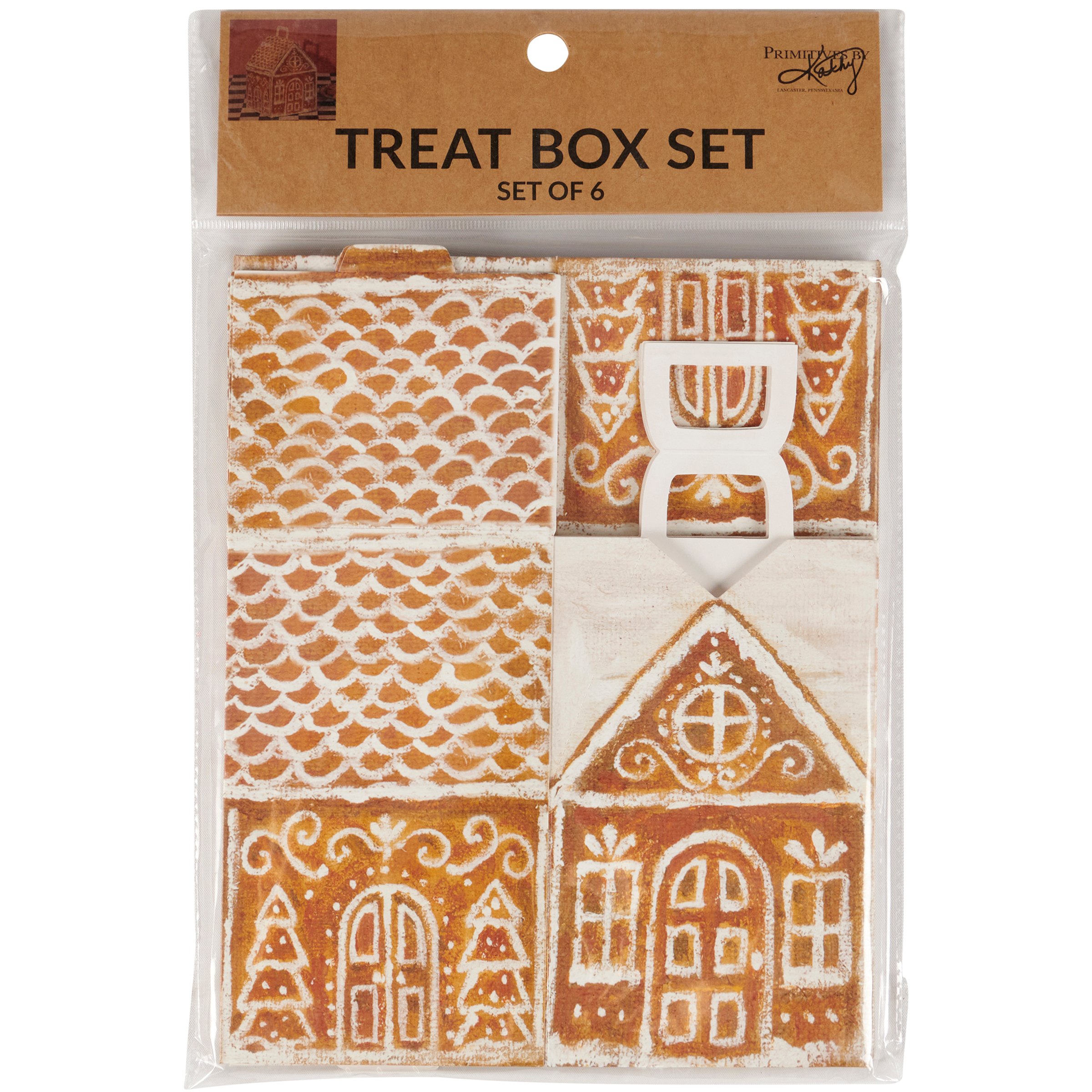 A pack of paper treat boxes from our Christmas Collection perfect for gifting baked holiday treats. Seasonal treat boxes feature a print of a gingerbread house replicated from original hand painted art that folds and latches to create a dimensional gingerbread house appearance with handle on top for convenient carrying and gifting. Our Gingerbread House treat boxes include 6 flat treat boxes for easy storage. A fun gingerbread-themed set perfect for enhancing Christmas gifting.