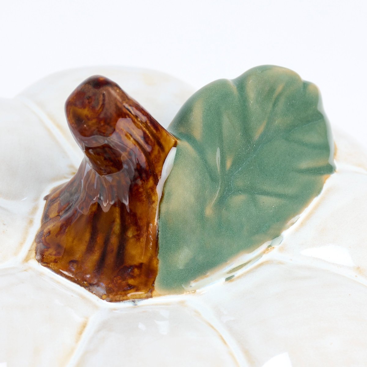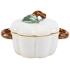 A ceramic treat jar from our Fall & Harvest Collection displaying a white pumpkin design. Our White Pumpkin treat jar features glaze finish with sculpted details and pumpkin top design for the lid as well as side handles for easy carrying. Hand wash only. A rustic fall kitchen accessory perfect for storing holiday treats.