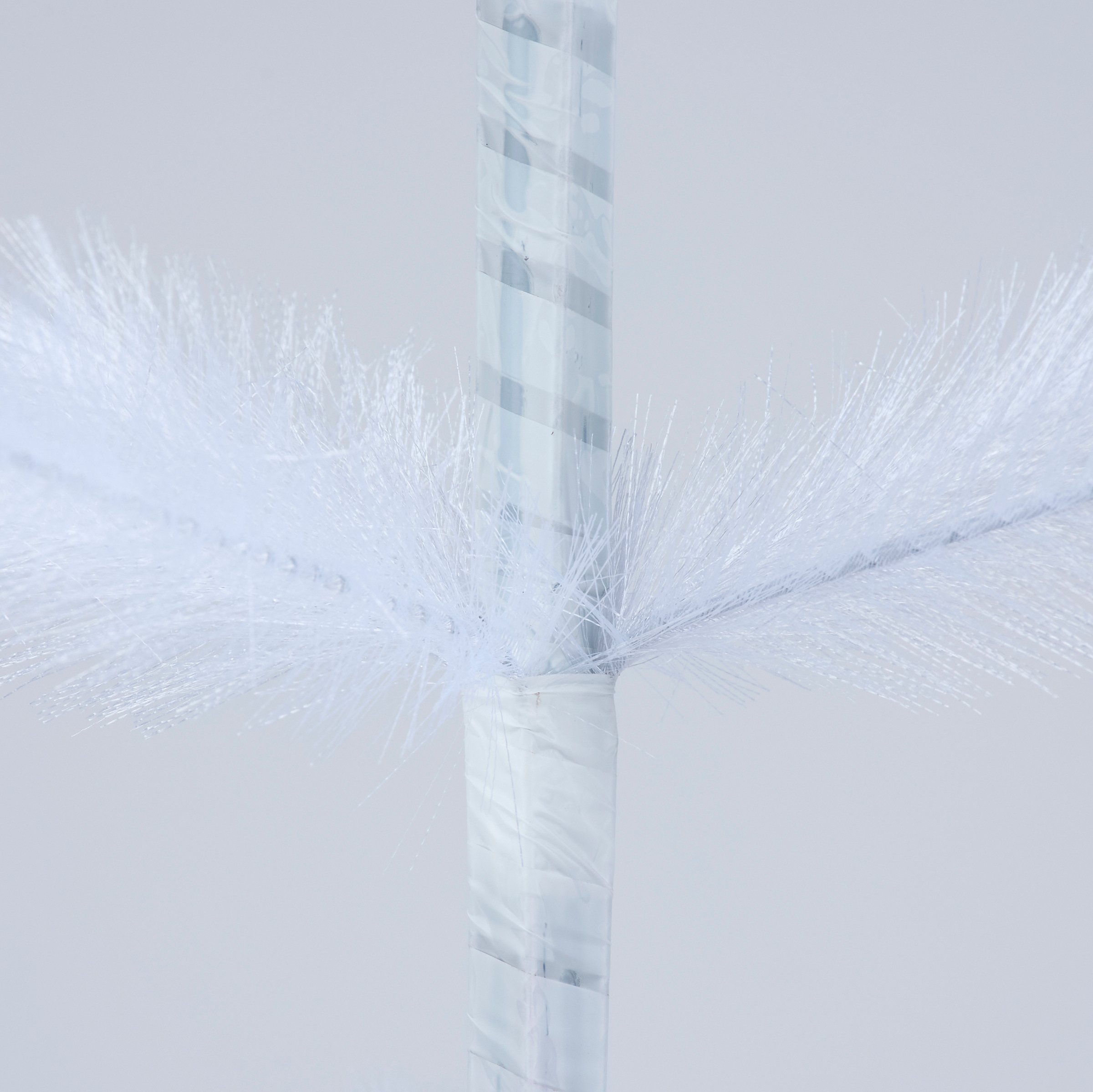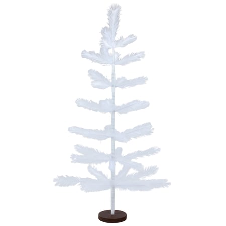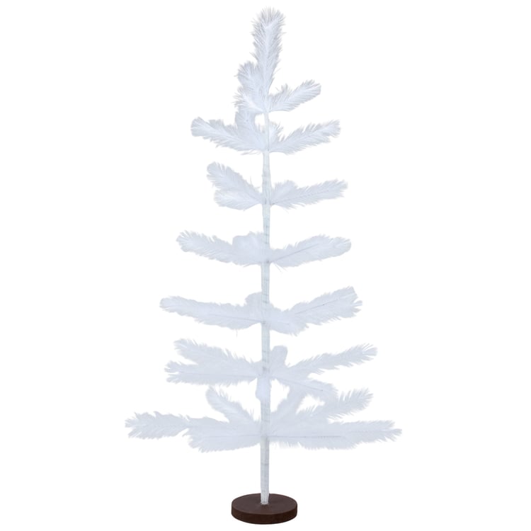 A medium decorative tree from our Christmas Collection displaying a pampas tree inspired design with an all white color palette. Our medium White Pampas tree stands 35.5 inches tall and is attached to a dark stained wood base. A faux tree perfect for displaying as retro home decor or as a miniature Christmas tree with ornaments.