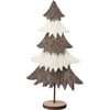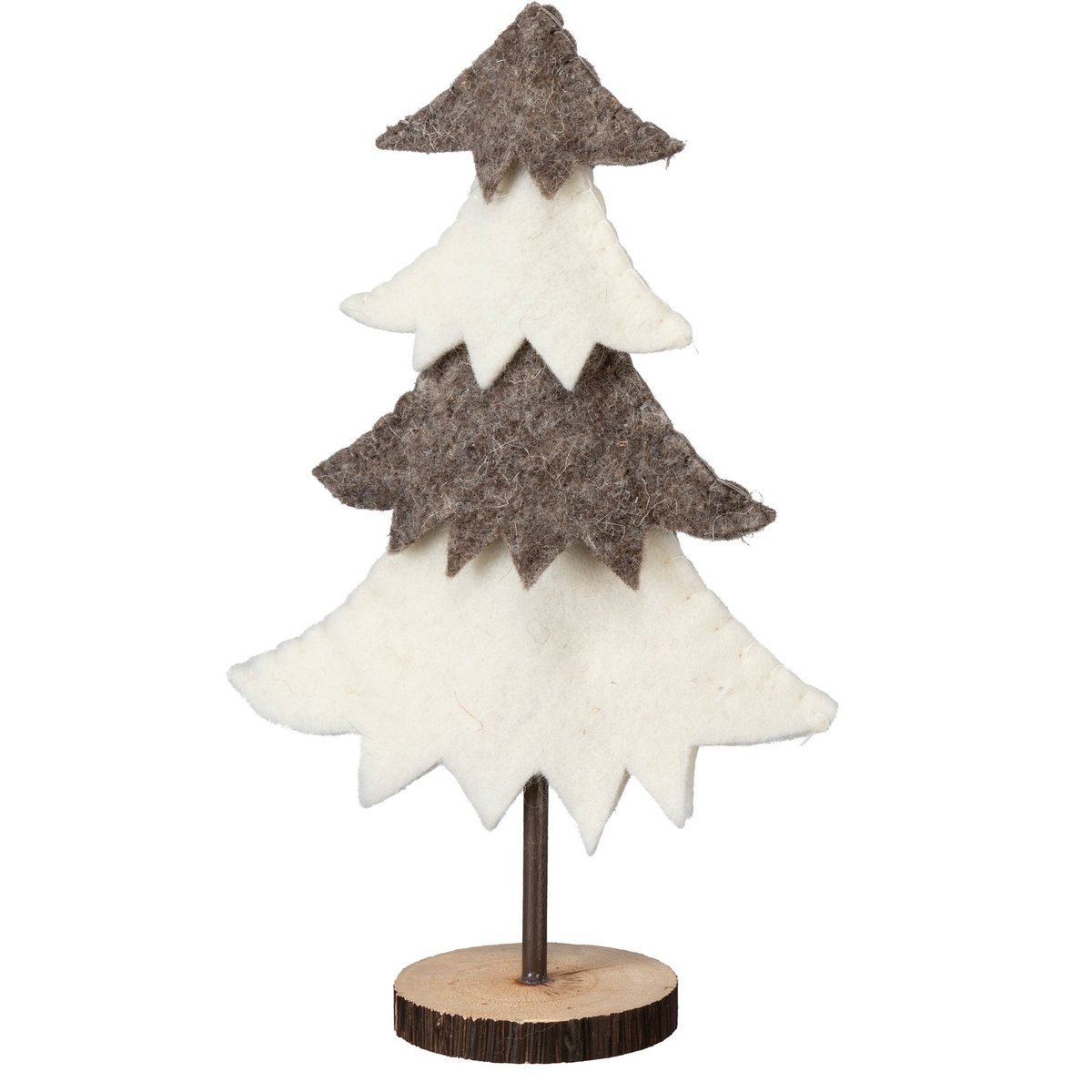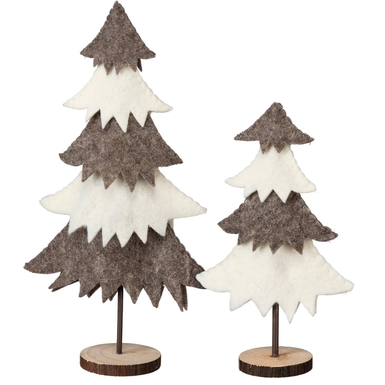 A set of two felt tiered trees. Both the large and small tree includes wooden base and features alternating black and white color palette. Complements well with other felt critters to create a cohesive display.