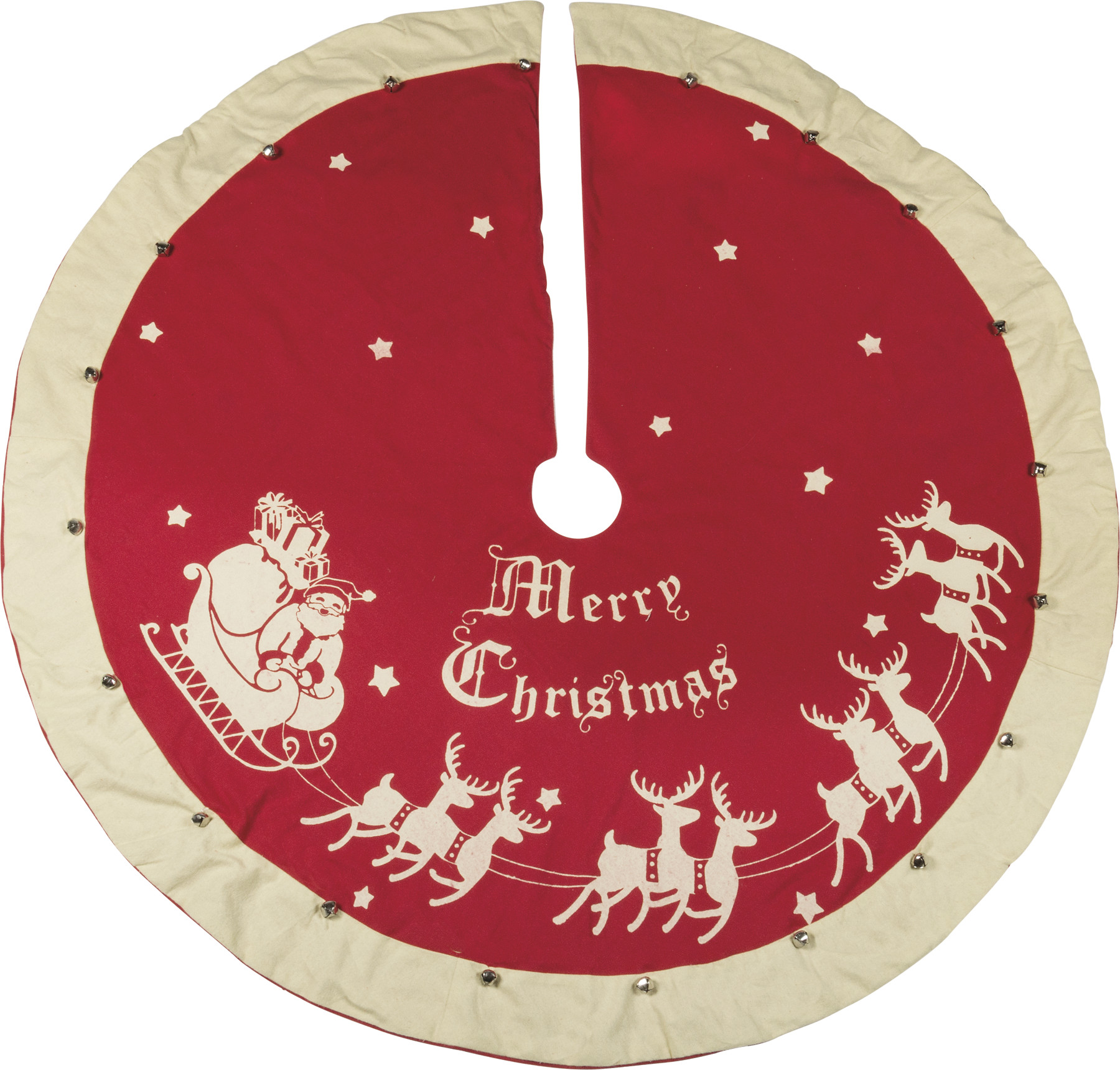 A large vintage tree skirt featuring a "Merry Christmas" sentiment, Santa and sleigh designs, bell trim details, and back slit opening.