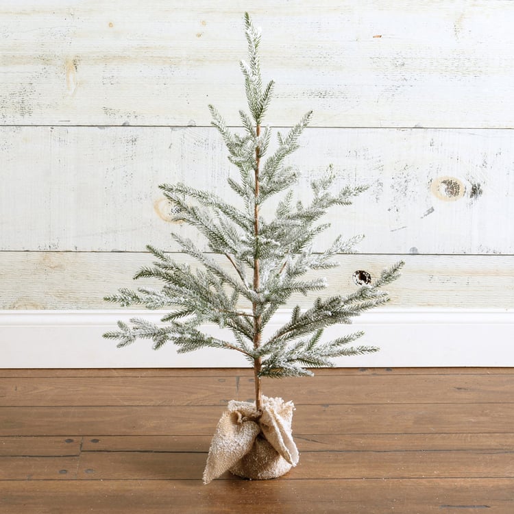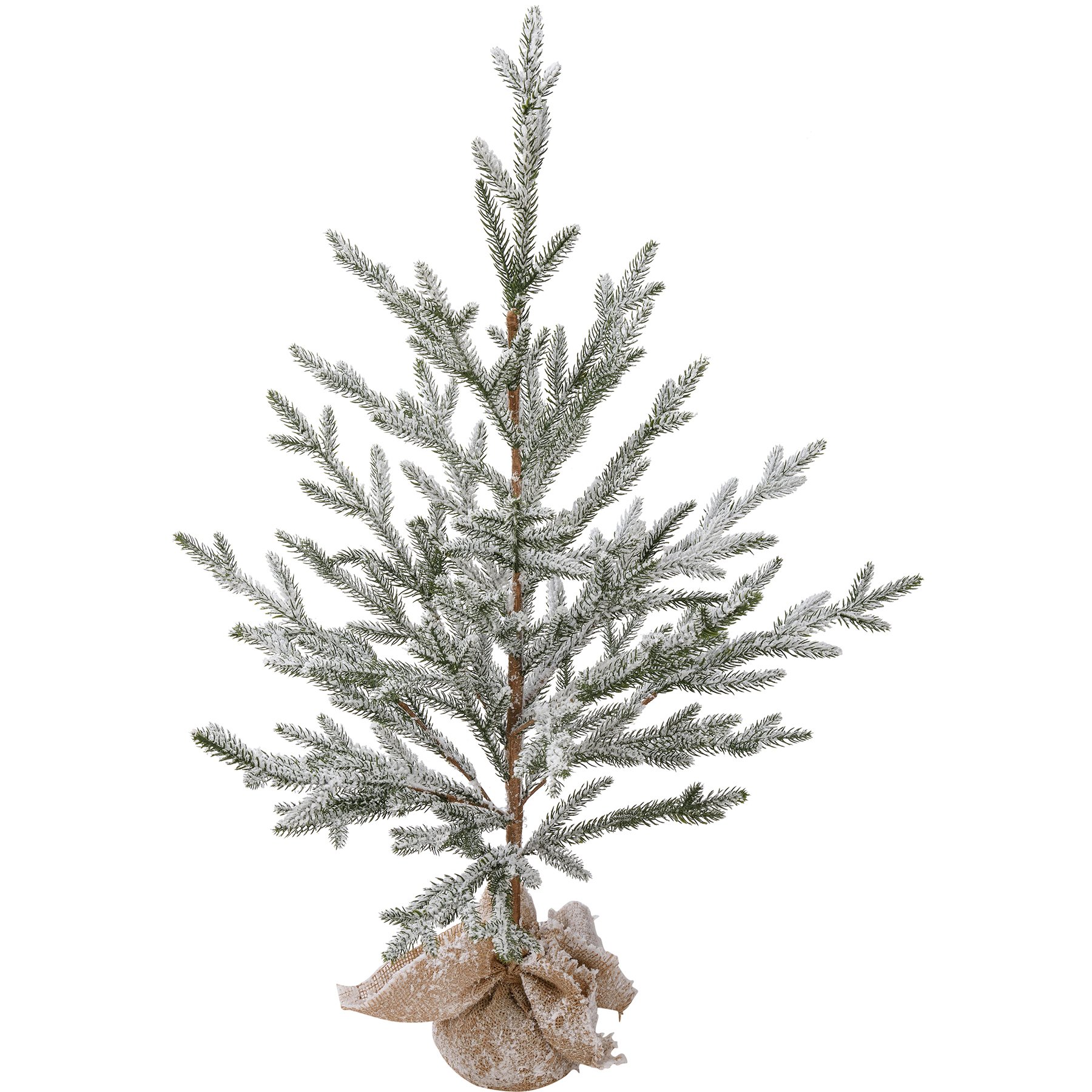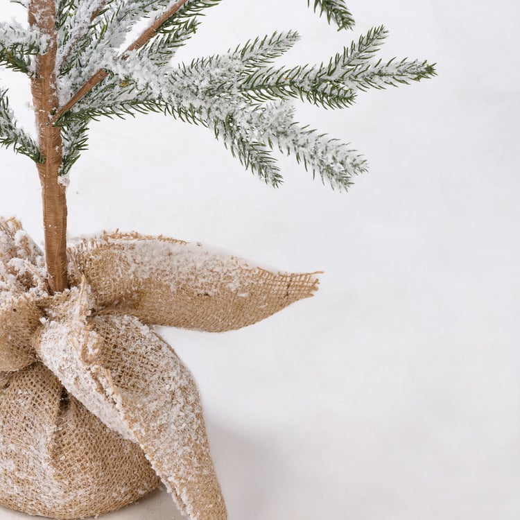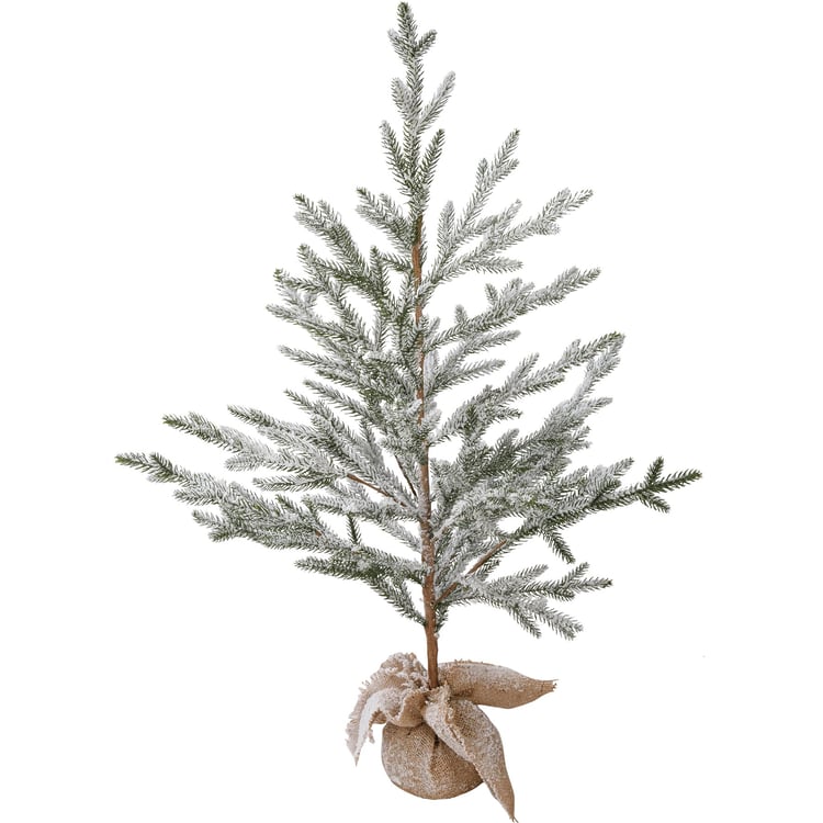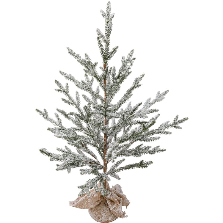A small faux pine tree featuring a flocked coating for a snowy effect and a burlap-wrapped base for added interest.