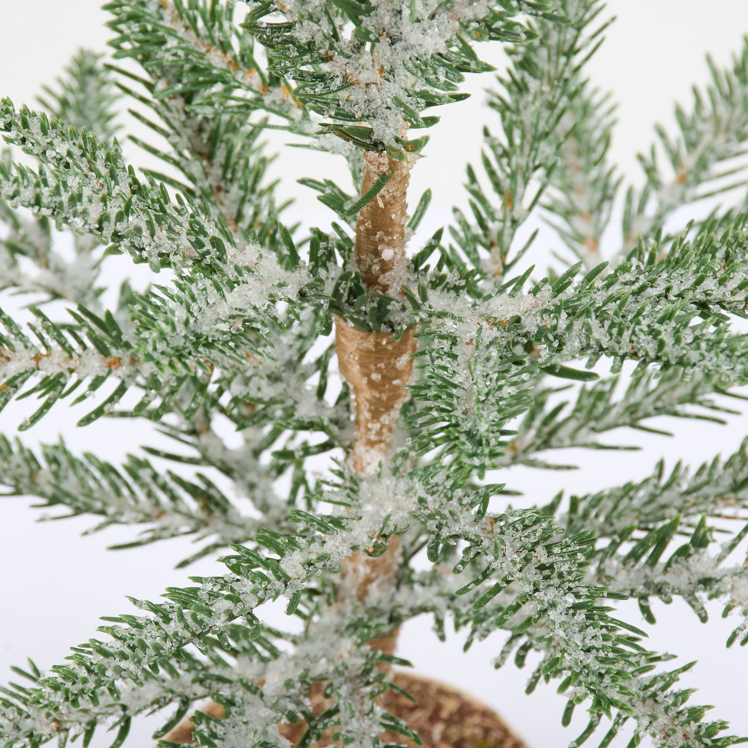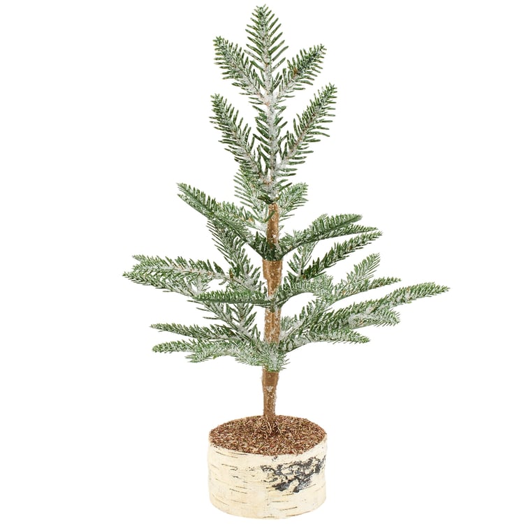 A small decorative tree from our Christmas Collection displaying a natural pine tree design with a mica coating on the branches for a frosty finish. Our small Icy Pine tree stands 12 inches tall and is attached to a faux tree trunk base designed to free stand on a flat surface for easy display. A faux tree perfect for displaying as natural home decor or as a miniature Christmas tree with ornaments.