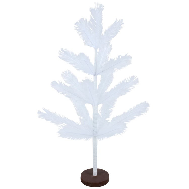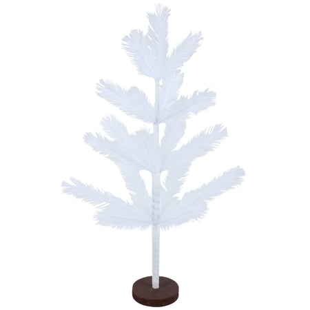 A small decorative tree from our Christmas Collection displaying a pampas tree inspired design with an all white color palette. Our small White Pampas tree stands 24 inches tall and is attached to a dark stained wood base. A faux tree perfect for displaying as retro home decor or as a miniature Christmas tree with ornaments.