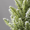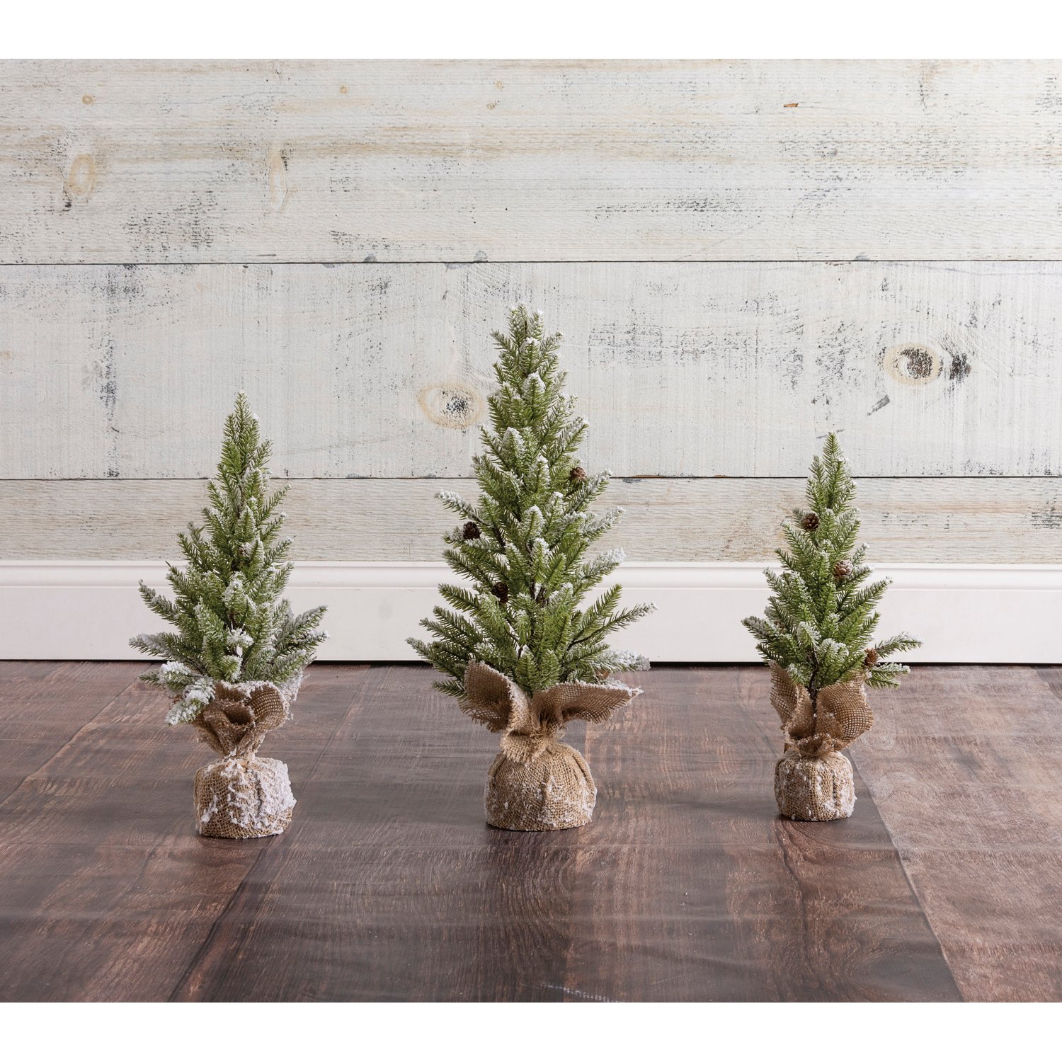 A standing bristle tree featuring flocked accents for a snowy effect. 18" tall with a burlap covered base.