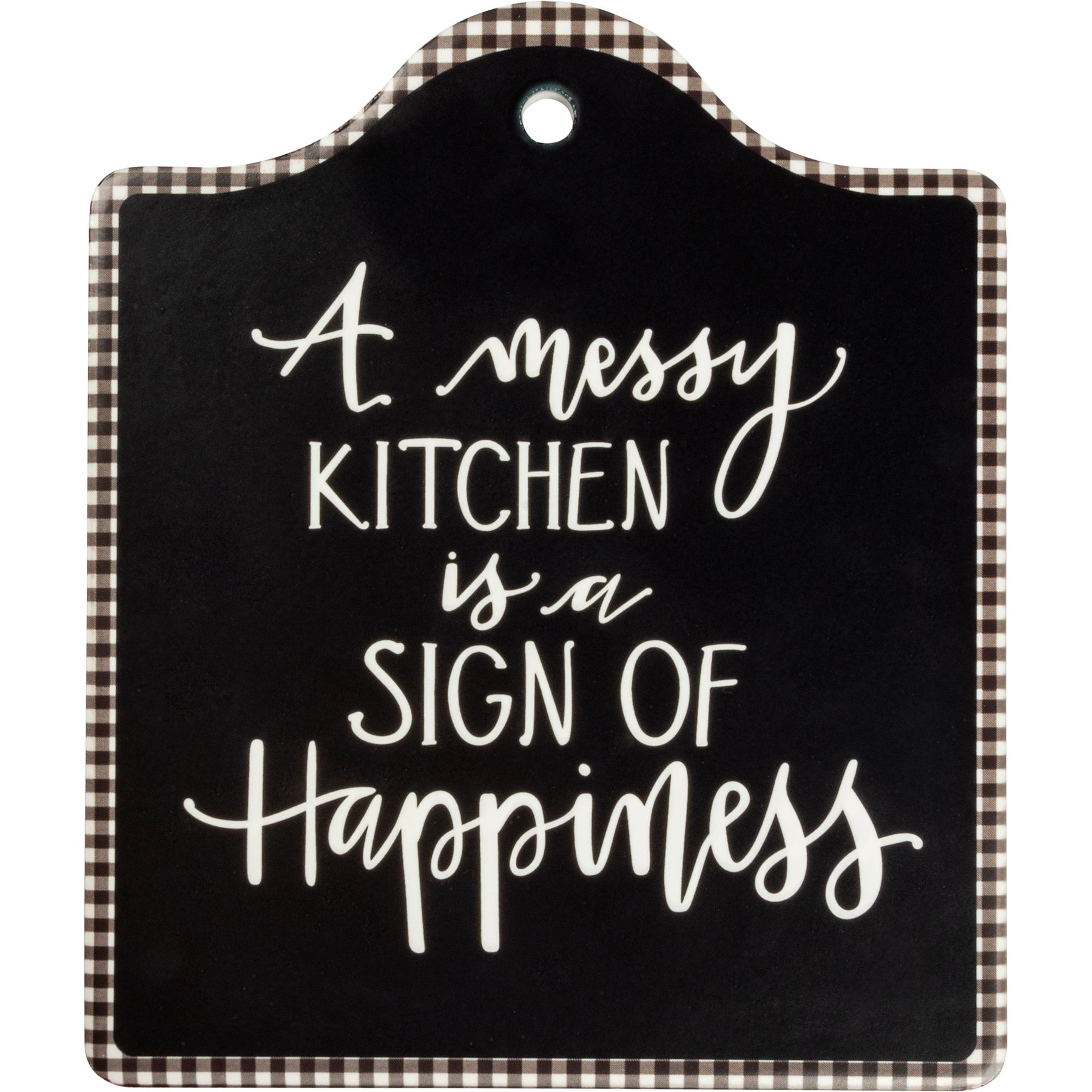 A stone trivet tray lending "A Messy Kitchen Is A Sign Of Happiness" sentiment and black and white checkered border. Complements well with coordinating kitchen designs.