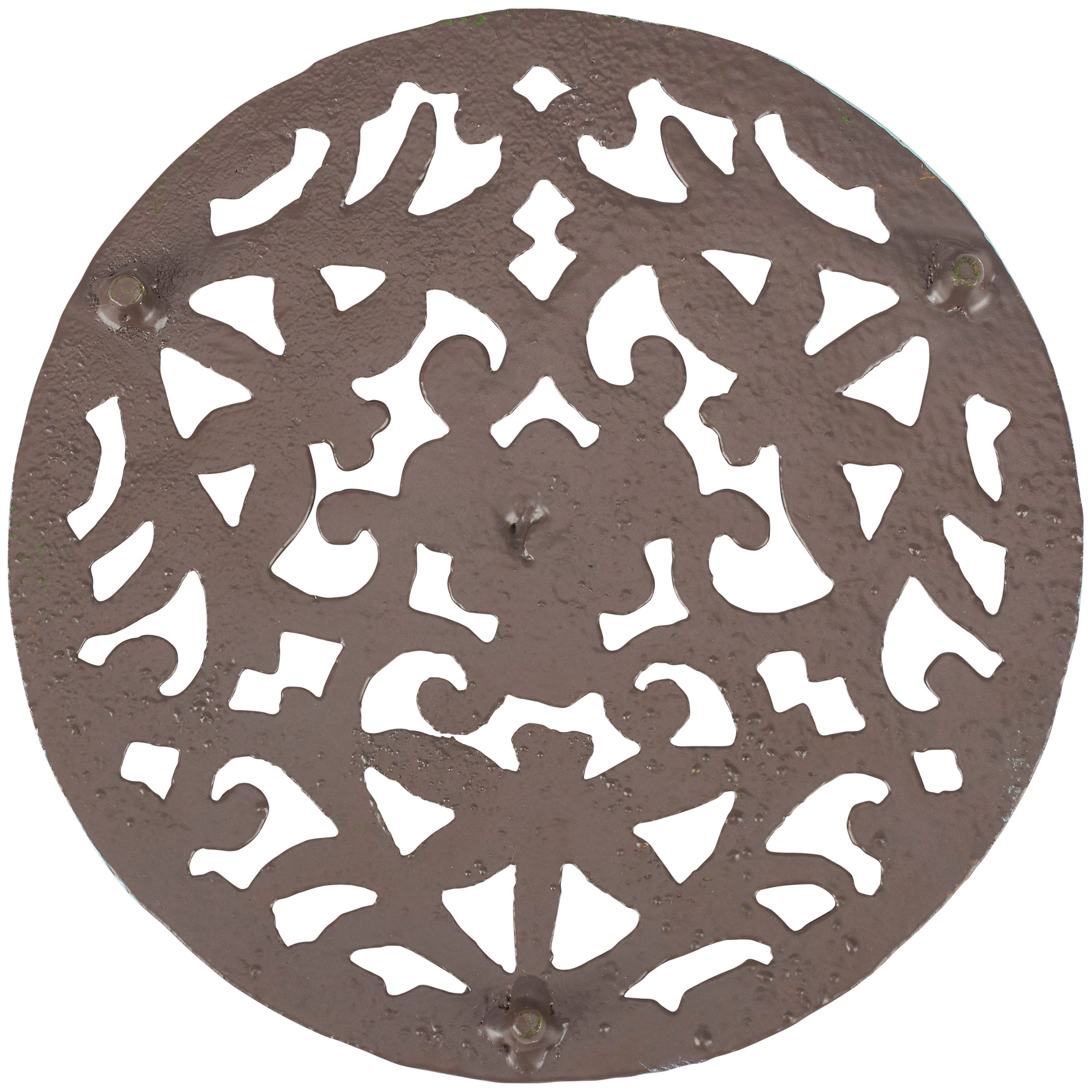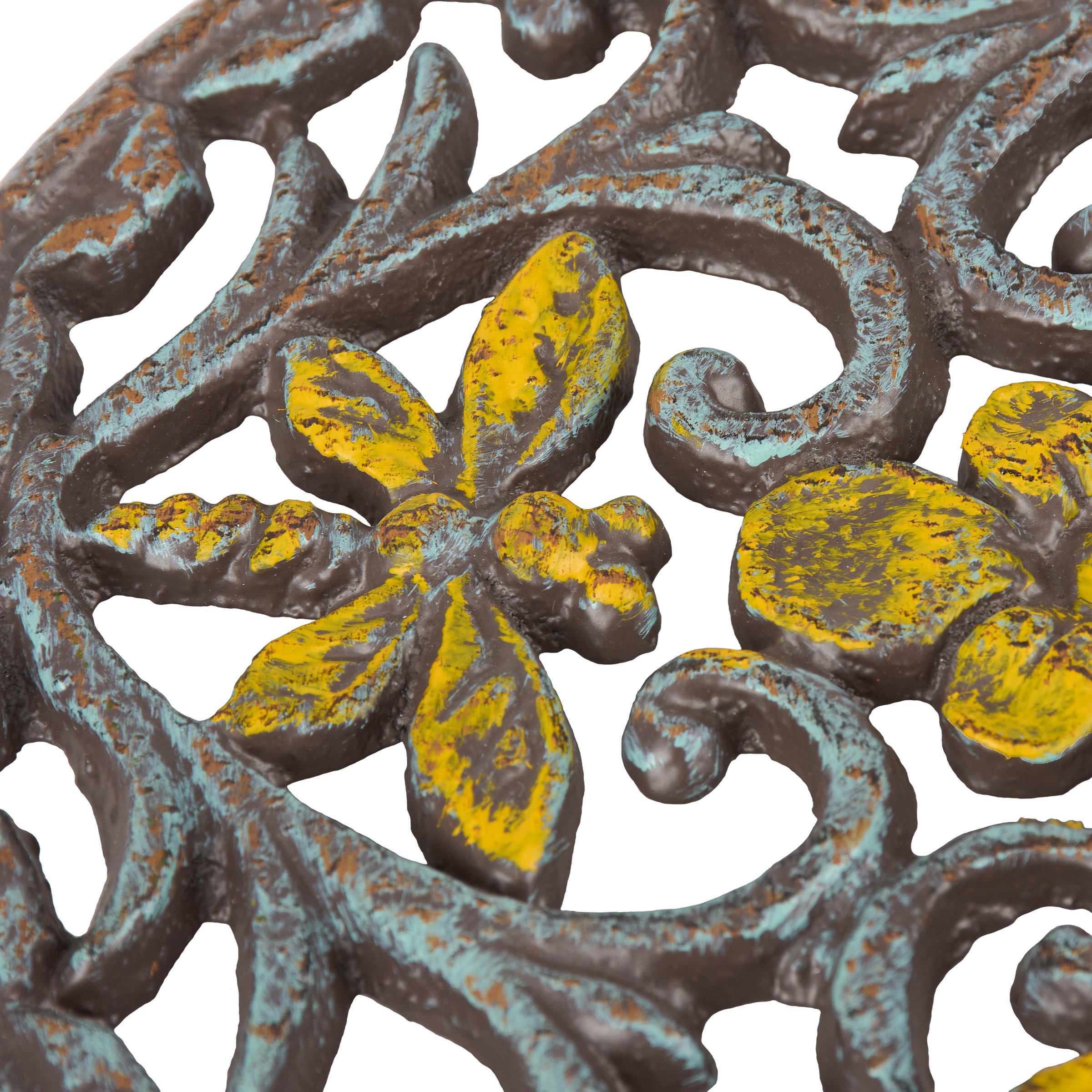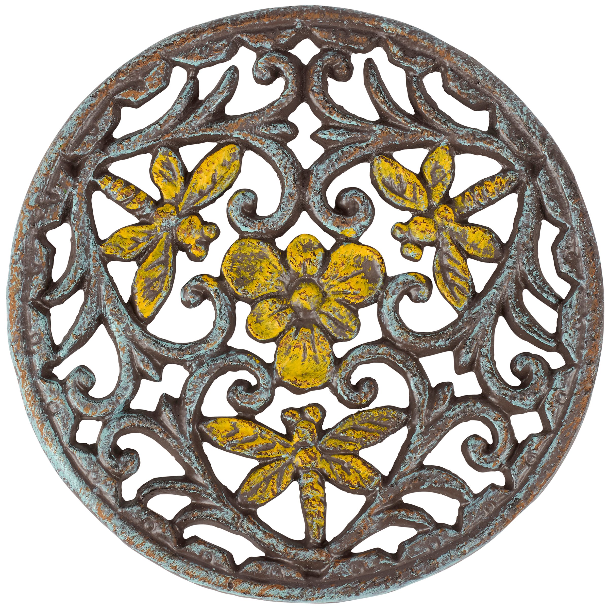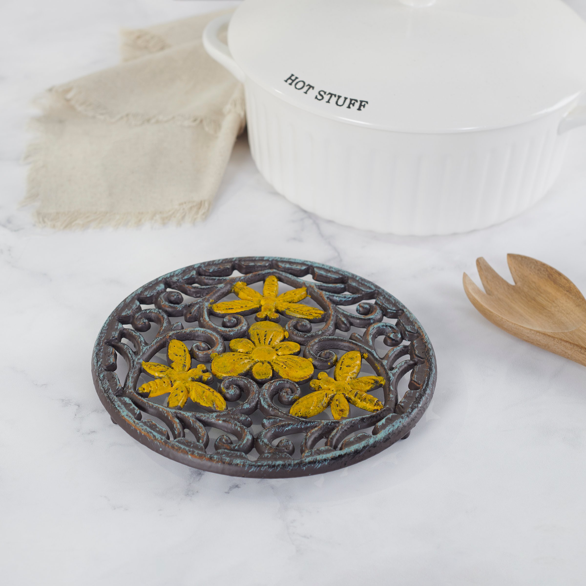 A metal trivet from our Garden Collection displaying a rustic dragonfly inspired design with painted and distressed details for a naturally aged appearance. Metal trivet features a footed base to safely place on kitchen surface. Our Dragonfly trivet is easy to hang to display when not in use. A rustic garden-themed kitchen accessory perfect for everyday use.