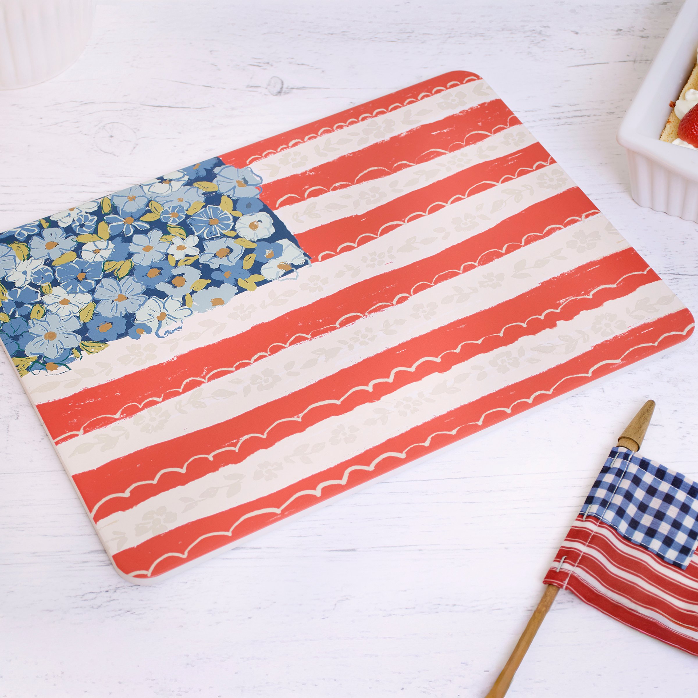 A stone trivet from our Patriotic Collection displaying a folk art inspired design of an American flag featuring floral details. Floral flag design is replicated from original art hand painted in a unique watercolor style. Our Floral Flag trivet features a cork base to safely place on kitchen surface. A stylish patriotic kitchen accessory perfect for 4th of July and Memorial Day decorating or celebrating stars and stripes all year round.