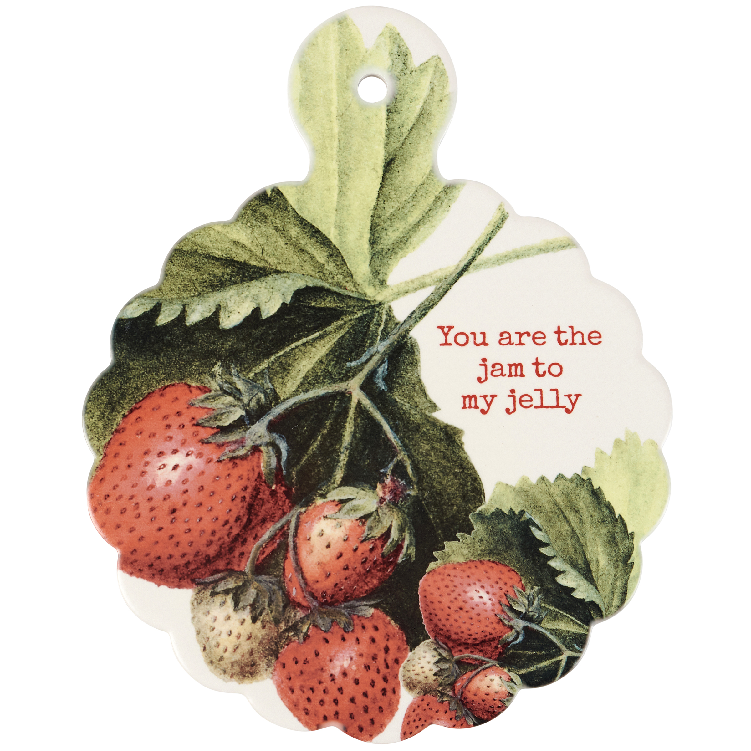 A stone trivet from our Garden Collection displaying a vintage design of wild strawberries with a coordinating punny sentiment that reads "You Are The Jam To My Jelly." Trivet features cork base to safely place on kitchen surface. Our Jam To My Jelly trivet is easy to hang via pre-drilled hole above design to display when not in use. A fun strawberry-themed kitchen accent that adds functional style.