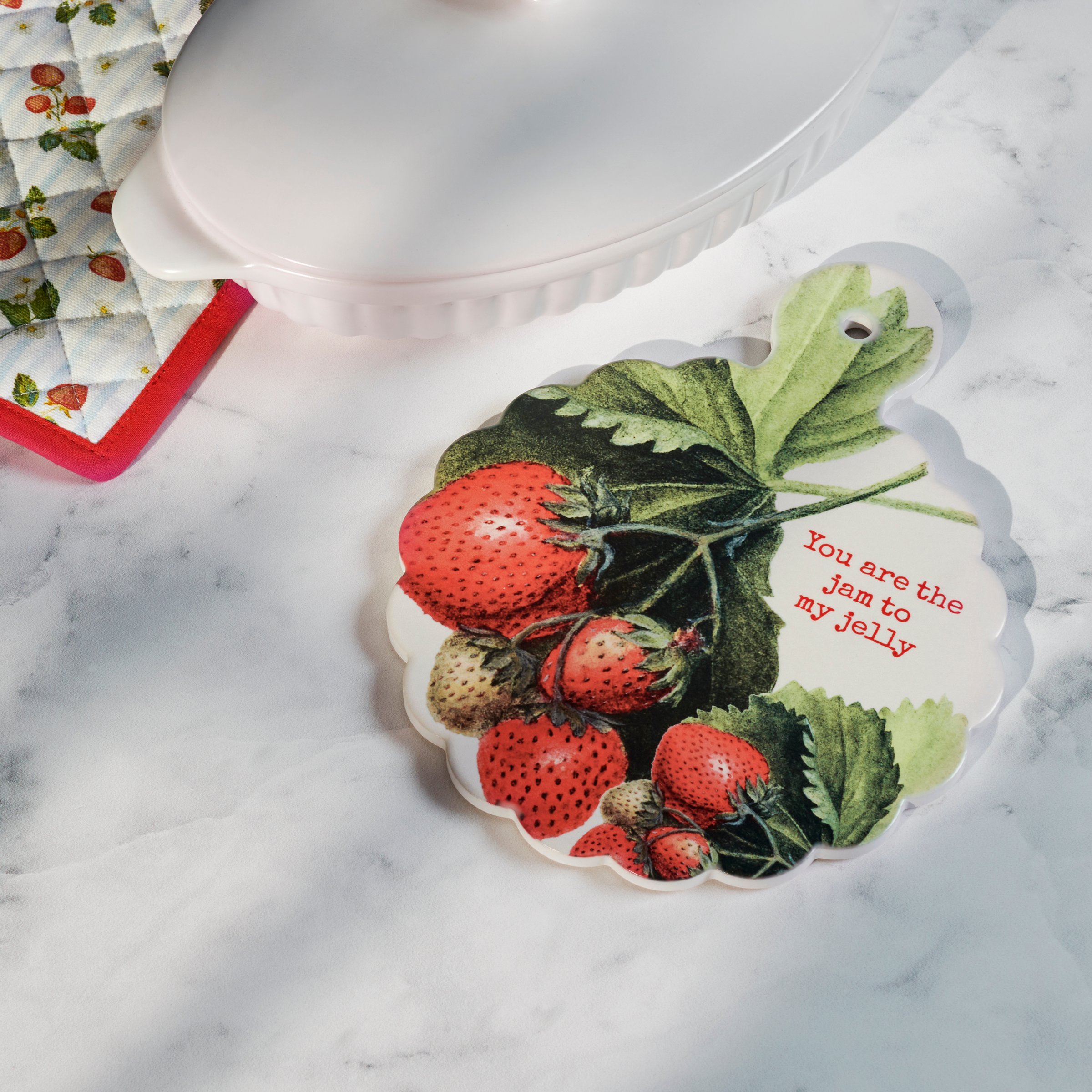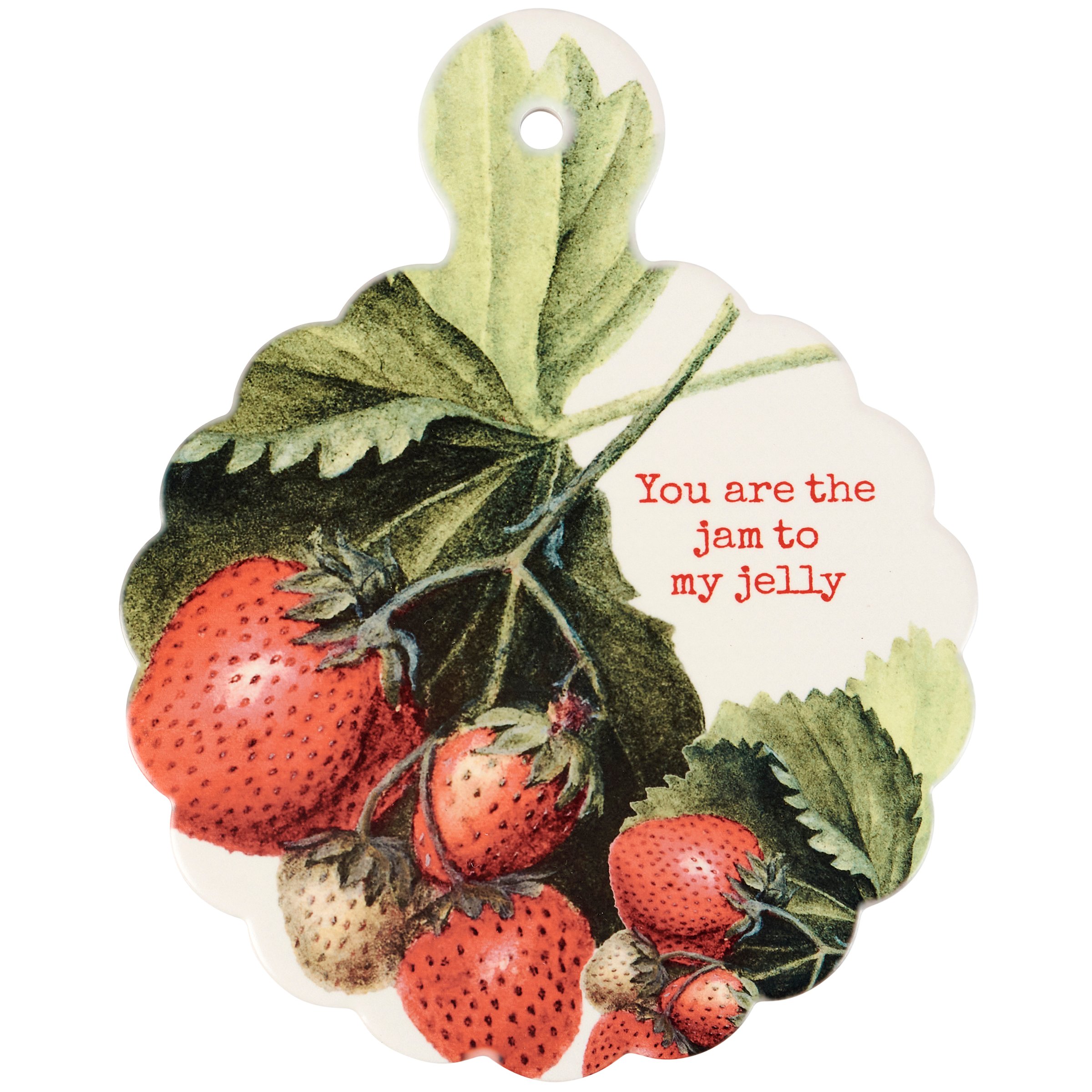 A stone trivet from our Garden Collection displaying a vintage design of wild strawberries with a coordinating punny sentiment that reads "You Are The Jam To My Jelly." Trivet features cork base to safely place on kitchen surface. Our Jam To My Jelly trivet is easy to hang via pre-drilled hole above design to display when not in use. A fun strawberry-themed kitchen accent that adds functional style.