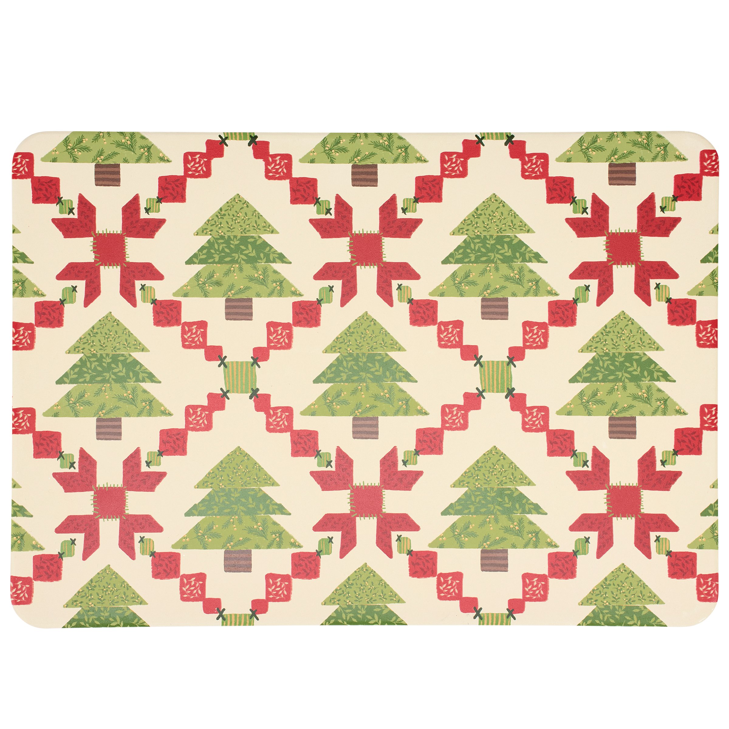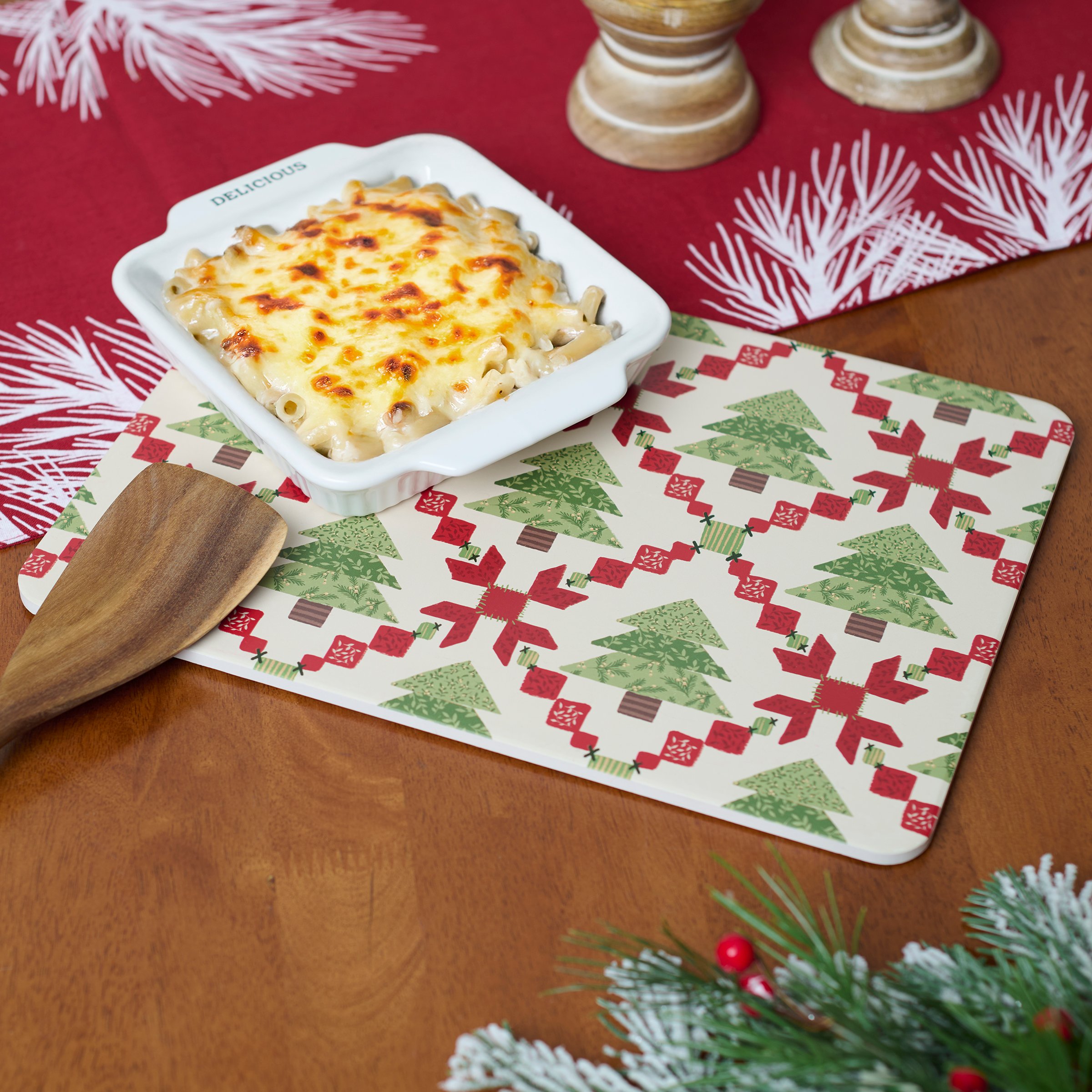 A stone trivet from our Christmas Collection displaying a craft inspired Christmas tree quilt pattern replicated from original art hand painted in a unique watercolor style. Our Tree Quilt trivet features a cork base to safely place on kitchen surface. A craft themed Christmas kitchen accessory that easily adds seasonal style to any kitchen.