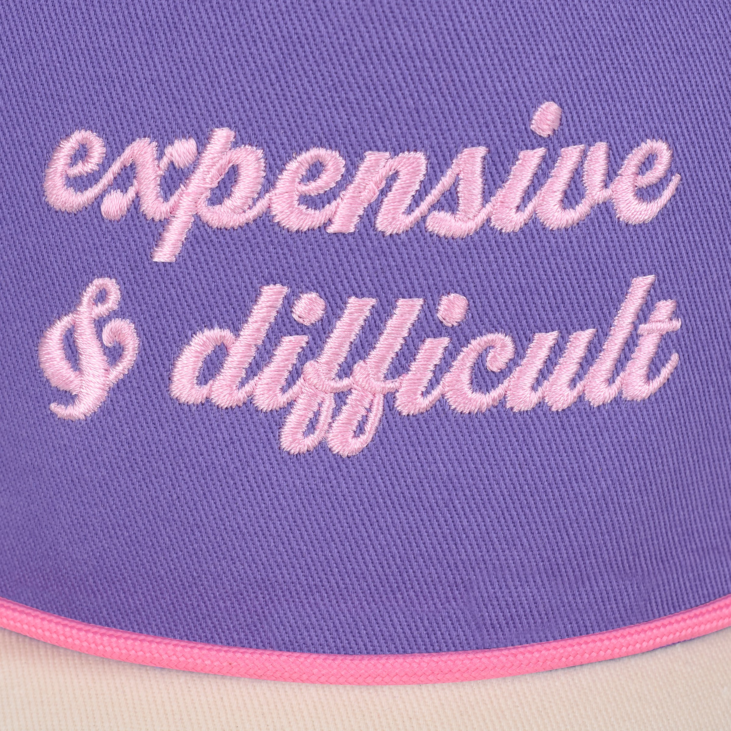 Let others know that nothing worth having comes easy with this trucker hat displaying a colorful retro style and a sassy sentiment that reads "Expensive & Difficult." Sassy sentiment is embroidered on purple cotton for eye-catching dimension with a coordinating pink color cording accent. Questionables trucker hats are one size fits most with an adjustable snap closure to create the perfect fit and feature a full mesh back for comfort and breathability in hot weather. Hand wash only. Our Expensive & Difficult trucker hat calls back to a retro style while also calling out a modern mentality, perfect for everyday self expression and or gifting to your high-maintenance hunny.