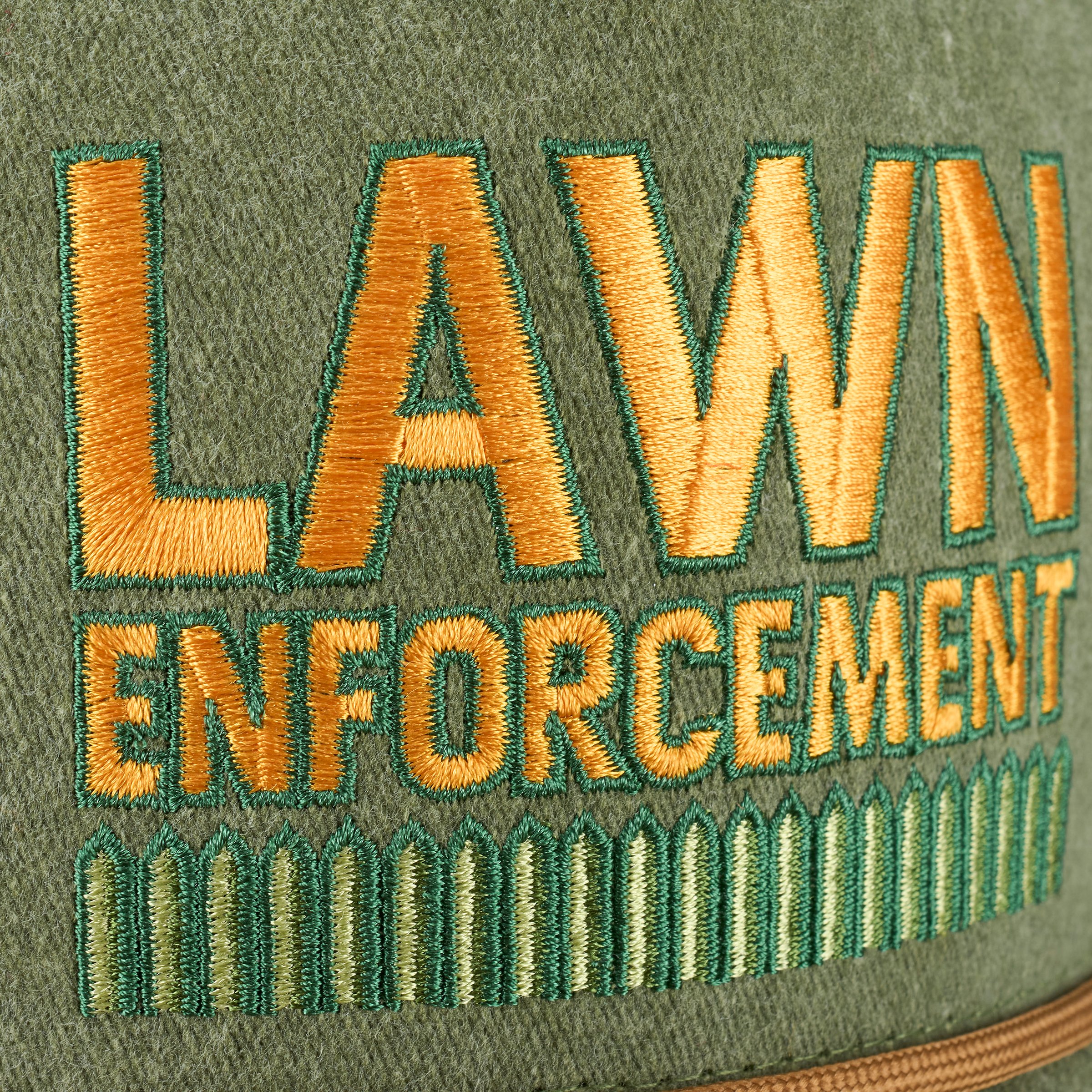 A cotton trucker hat from our Garden Collection featuring an earthy color palette and detailed embroidered design displaying a fun landscaping inspired sentiment that reads "Lawn Enforcement." Lawn-themed design is replicated from original hand illustrated artwork. Trucker hat also features a coordinating brown color cording accent. Our Lawn Enforcement trucker hat is one size fits most with an adjustable snap closure to create the perfect fit and full mesh back for comfort and breathability in hot weather. Hand wash only. A funny outdoor accessory great for gifting lovers of landscaping.