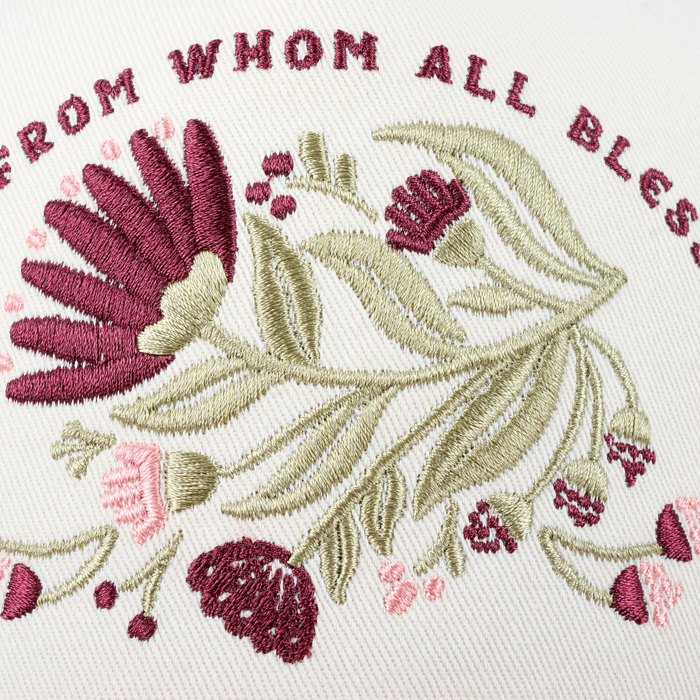 A cotton trucker hat from our Faith Collection displaying beautiful red flowers replicated from original hand illustrated art with a faith inspired sentiment that reads "Praise God From Whom All Blessings Flow." Floral design and faith sentiment is embroidered for added texture with a coordinating pink color cording accent. Our Praise God trucker hat is one size fits most with an adjustable snap closure to create the perfect fit and full mesh back for comfort and breathability in hot weather. Hand wash only. A faith-themed accessory perfect for gifting and everyday self expression.