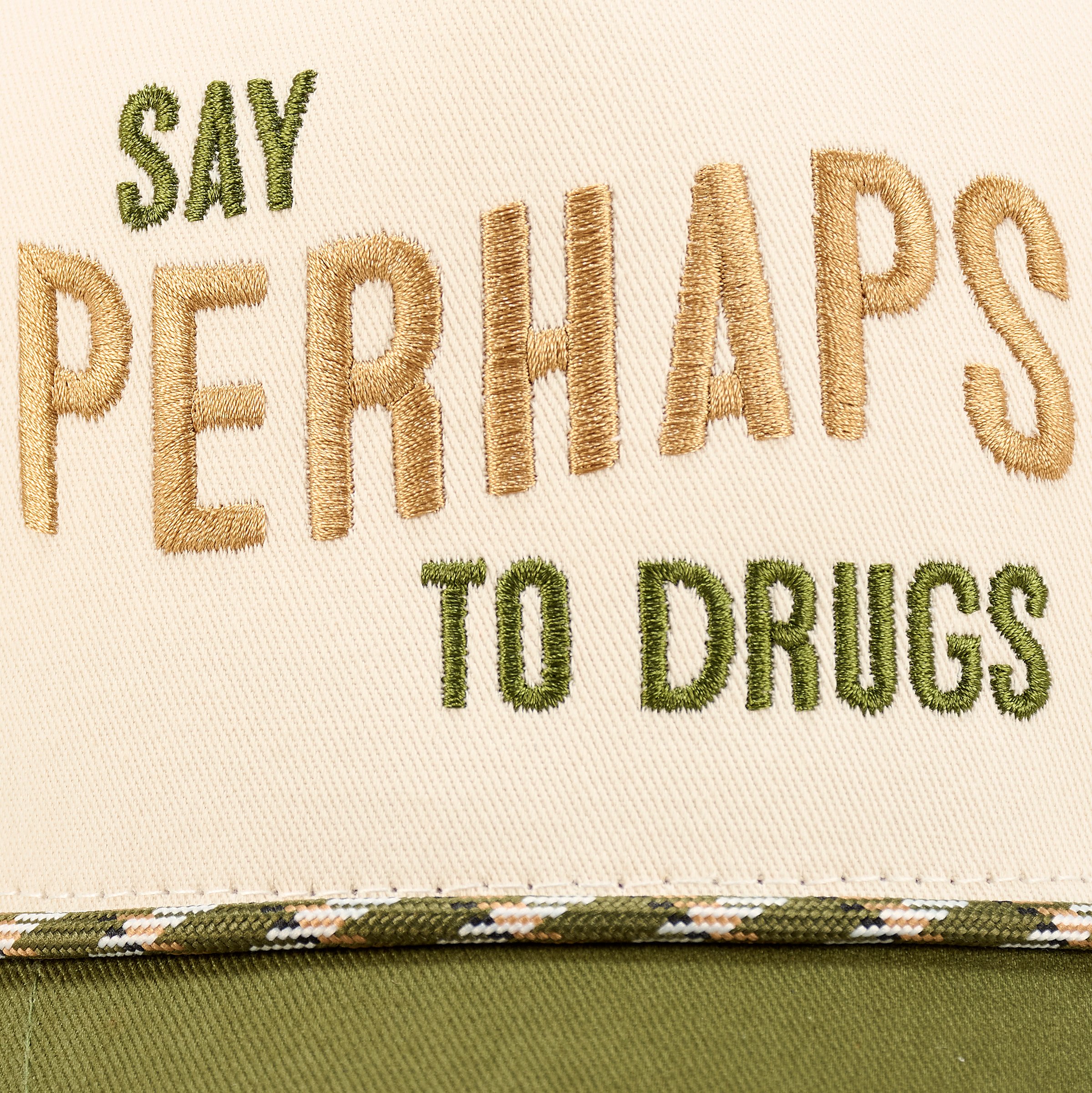 Consider a more open-minded third option with this trucker hat displaying a chill sentiment that reads "Say Perhaps To Drugs" in an earthy style. This down-to-earth design is embroidered on cream cotton for eye-catching dimension with coordinating pot green accents throughout the hat. Questionables trucker hats are one size fits most with an adjustable snap closure to create the perfect fit and feature a full mesh back for comfort and breathability in hot weather. Hand wash only. Our Say Perhaps trucker hat puts out chill vibes making it perfect for everyday expression.