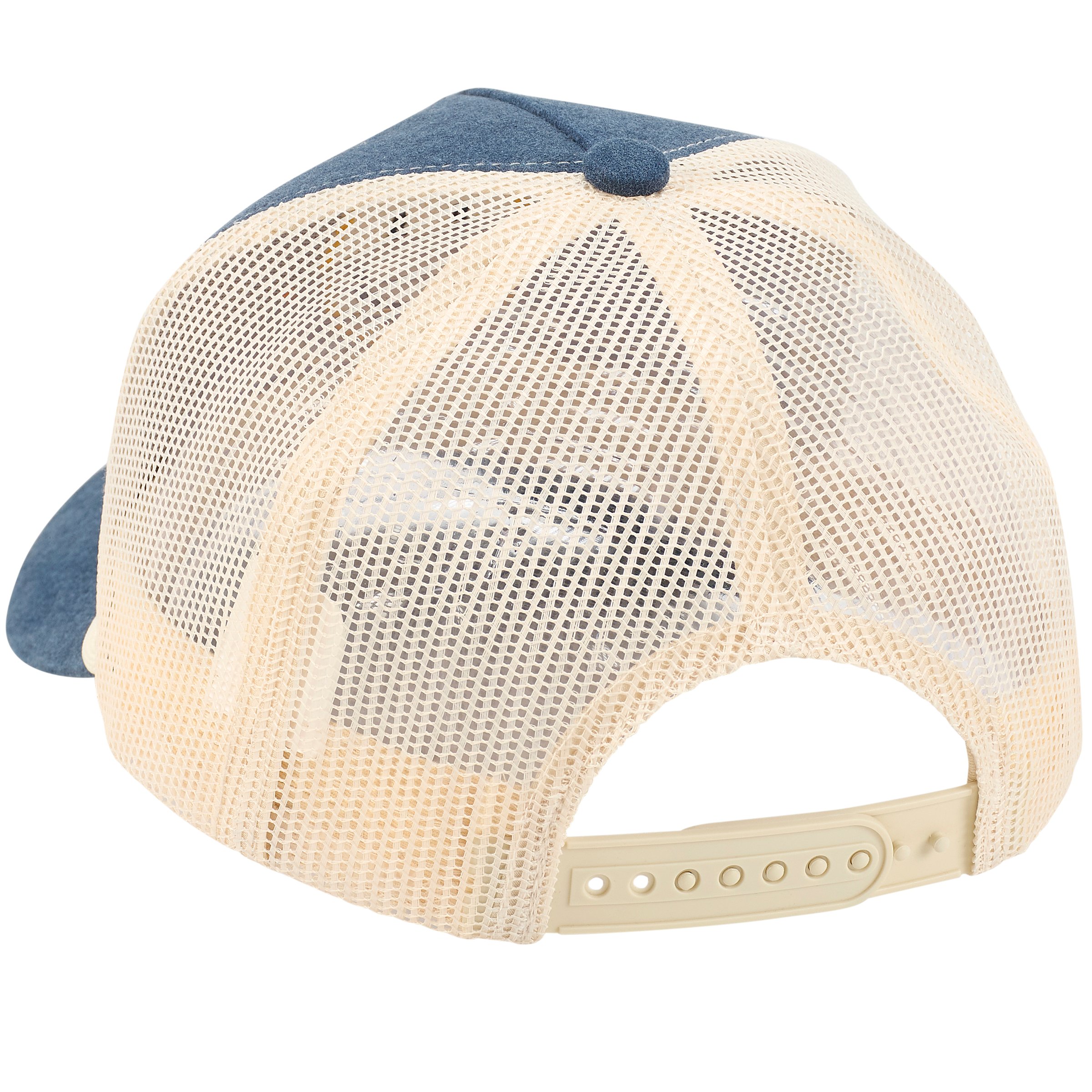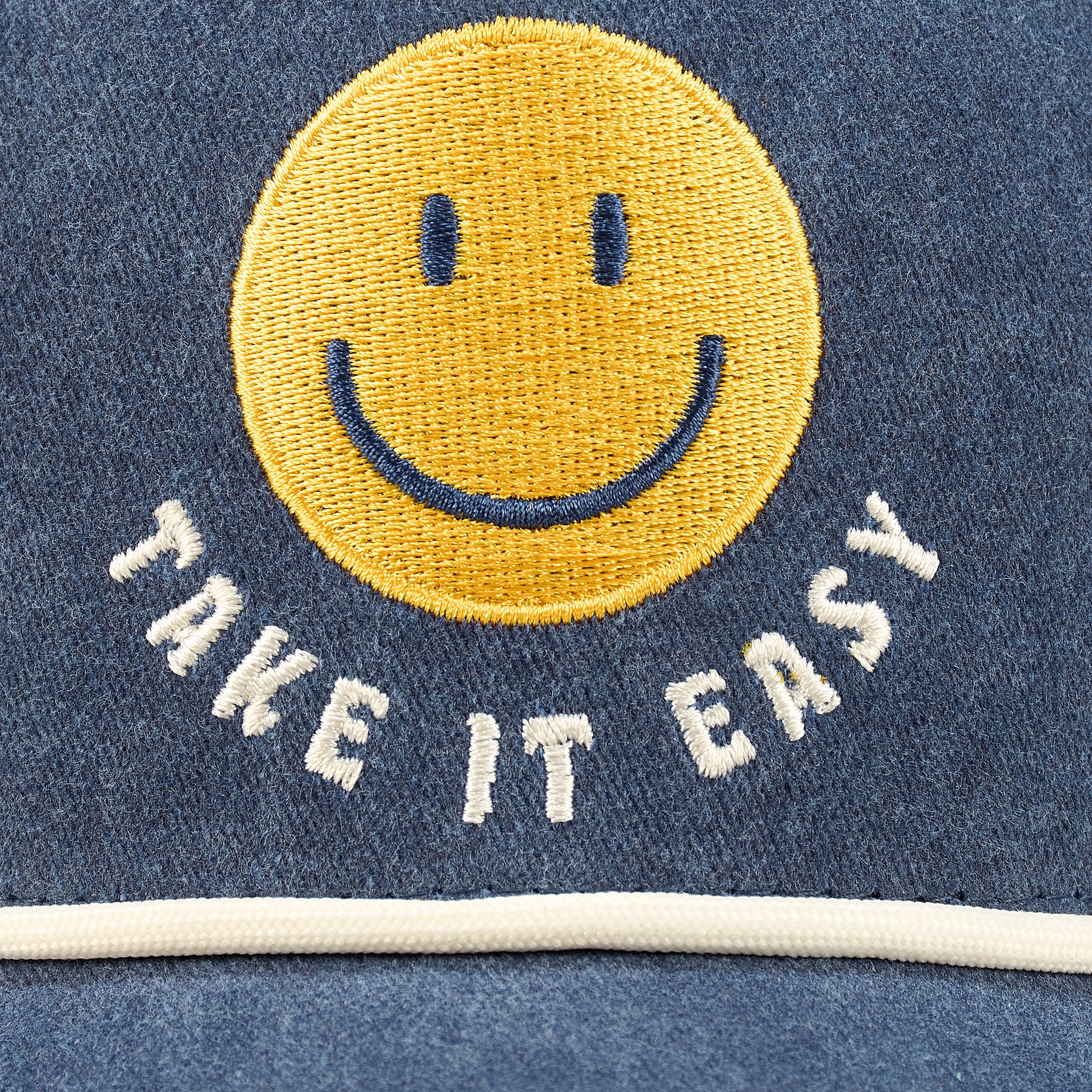 Send good vibes everywhere you go with this trucker hat displaying a classic smiley face design and friendly sentiment that reads "Take It Easy" in a fun retro style. This happy design is embroidered on stonewashed blue cotton for eye-catching dimension with a coordinating cream color cording accent. Questionables trucker hats are one size fits most with an adjustable snap closure to create the perfect fit and feature a full mesh back for comfort and breathability in hot weather. Hand wash only. Our Take It Easy trucker hat is perfect for everyday expression and inspiring calm auras all around you.