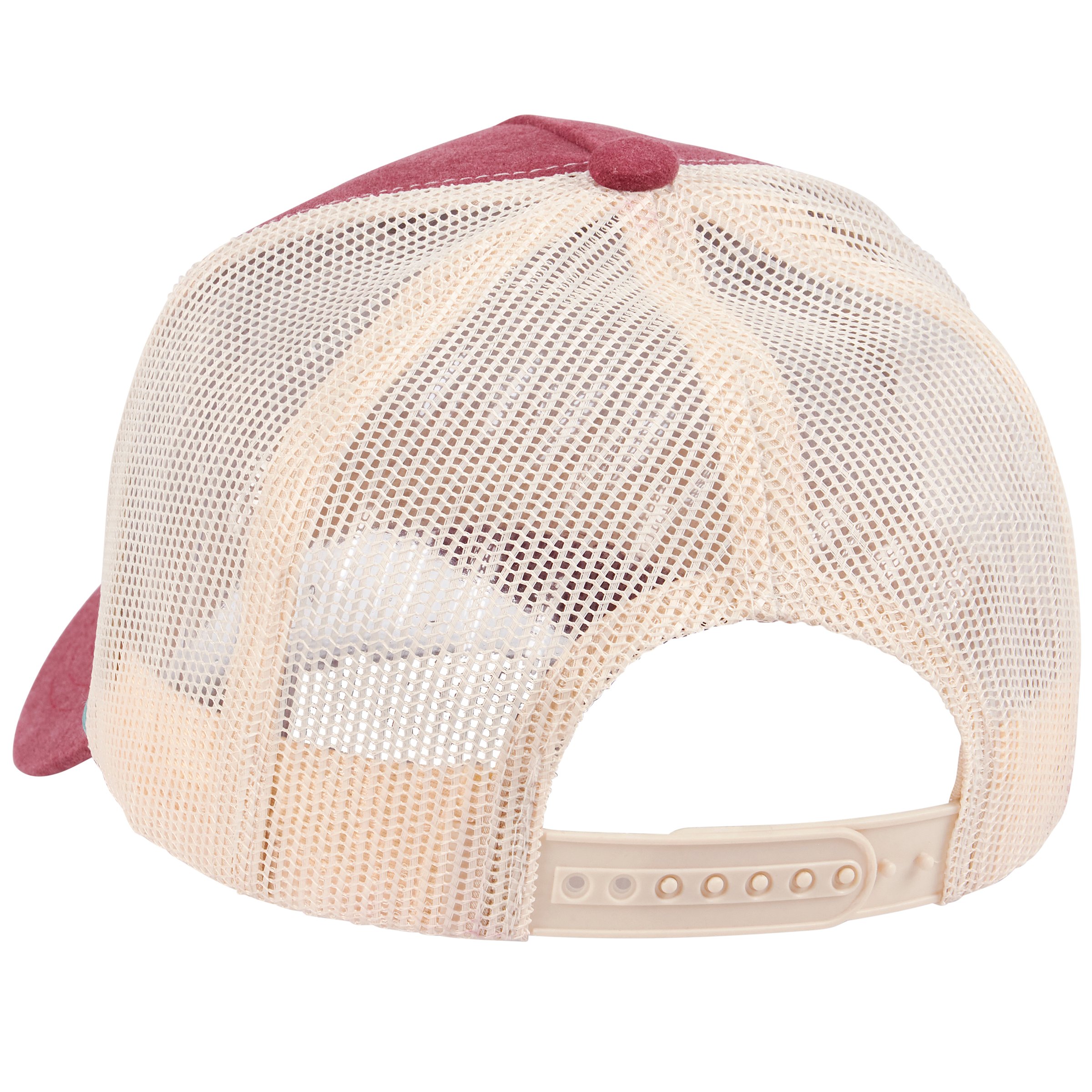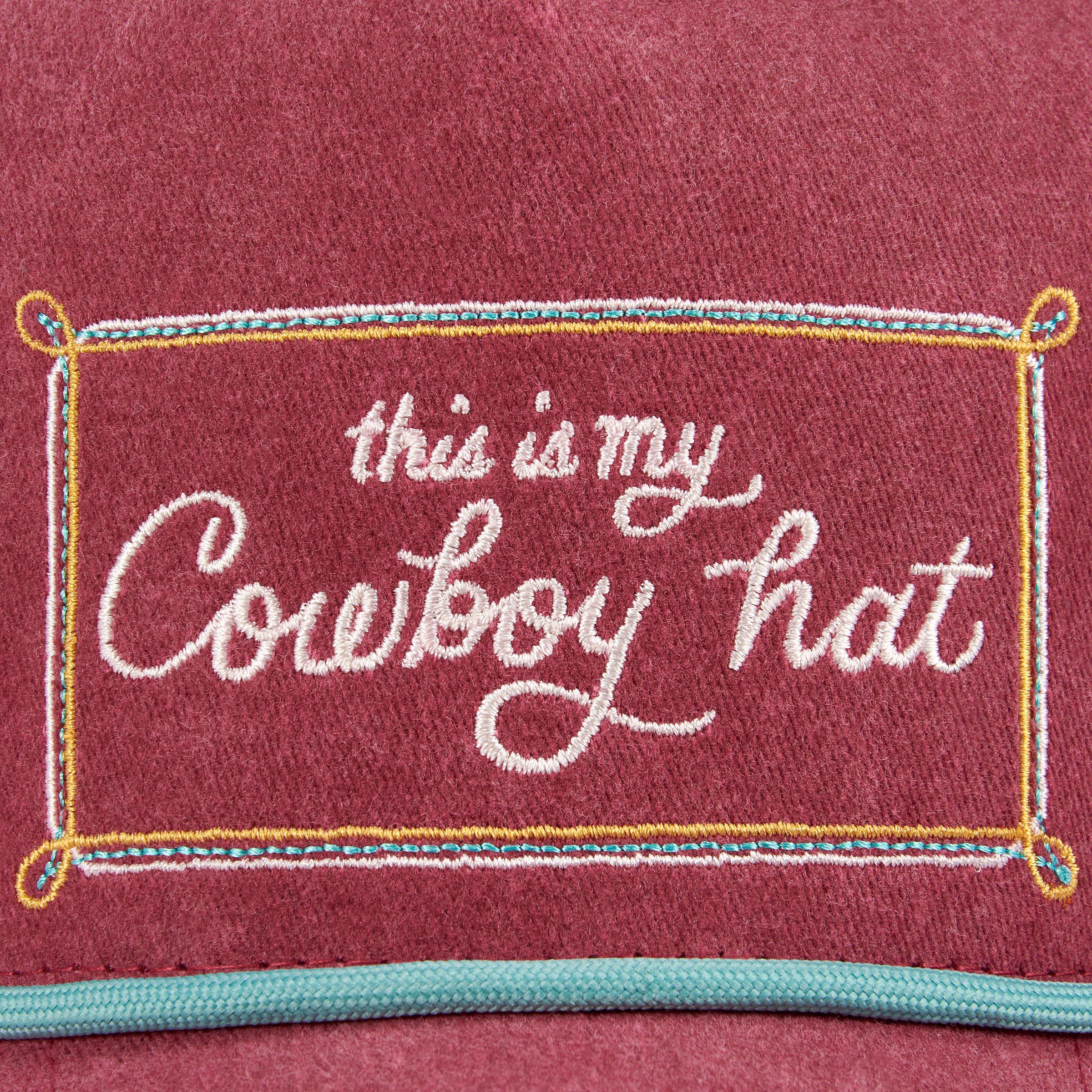 A cotton trucker hat from our Western Collection displaying a fun western inspired sentiment that reads "This Is My Cowboy Hat" replicated from original hand illustrated art. Western design is embroidered on maroon red cotton for added texture with a coordinating teal blue color cording accent. Our This Is My Cowboy Hat trucker hat is one size fits most with an adjustable snap closure to create the perfect fit and full mesh back for comfort and breathability in hot weather. Hand wash only. A fun western-themed accessory perfect for gifting.