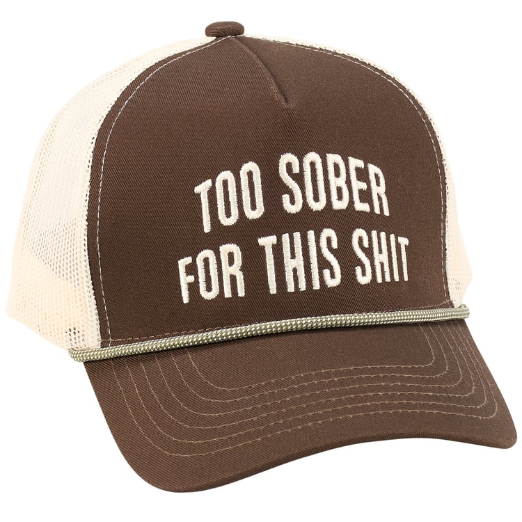 Give anyone that steps into personal space a vibe check with this trucker hat displaying a relatable sentiment that reads "Too Sober For This Shit" in an earthy style. This down-to-earth design is embroidered on brown cotton for eye-catching dimension with a coordinating grassy green cording accent. Questionables trucker hats are one size fits most with an adjustable snap closure to create the perfect fit and feature a full mesh back for comfort and breathability in hot weather. Hand wash only. Our Too Sober trucker hat puts out chill vibes making it perfect for everyday expression.