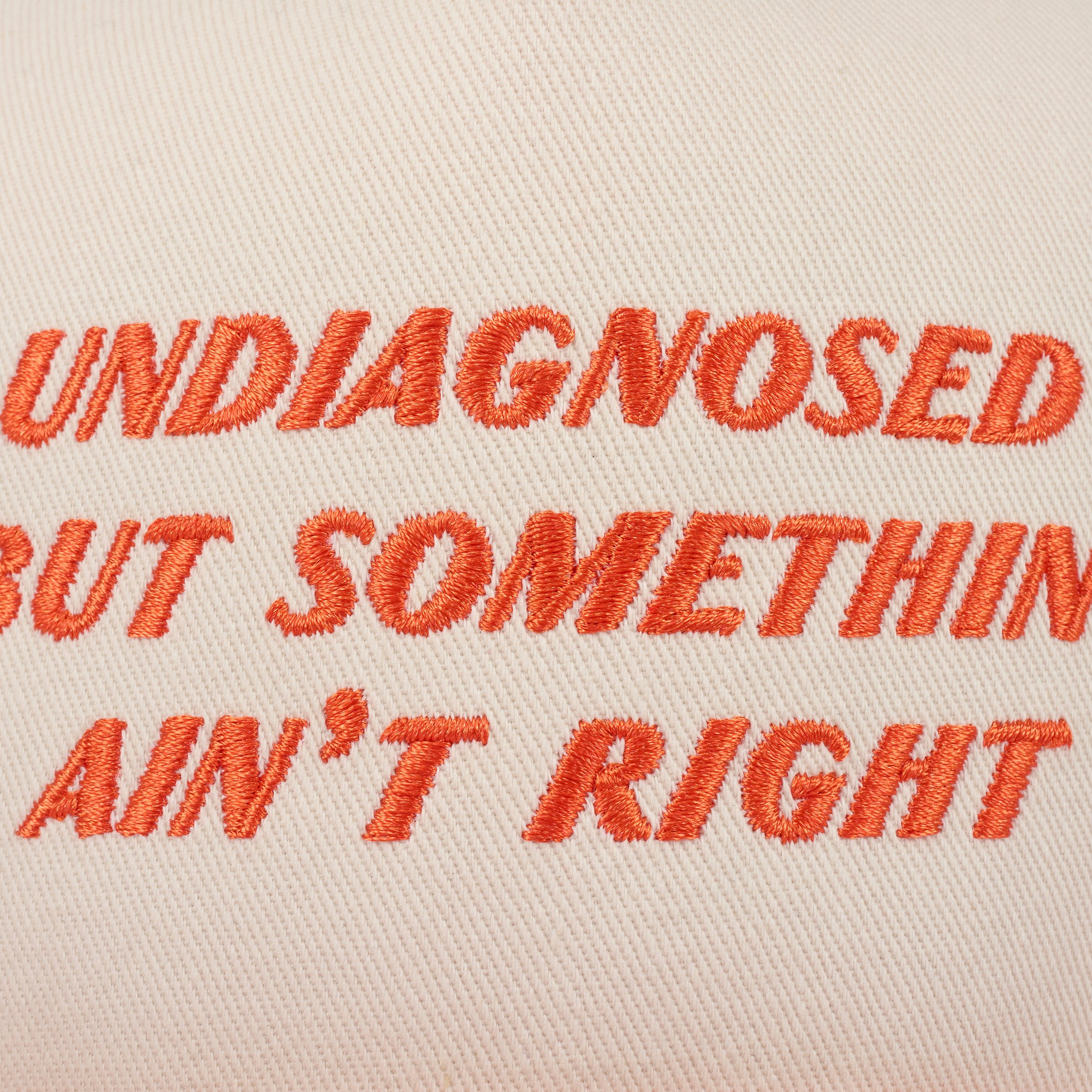 Give anyone that steps into personal space a vibe check with this trucker hat displaying an honest sentiment that reads "Undiagnosed But Something Ain't Right" in a fun retro style. Honest sentiment is fully embroidered for eye-catching dimension with a coordinating orange cording accent. Questionables trucker hats are one size fits most with an adjustable snap closure to create the perfect fit and feature a full mesh back for comfort and breathability in hot weather. Hand wash only. Our Undiagnosed But trucker hat is perfect for everyday self expression or gifting to that quirky friend or family member.