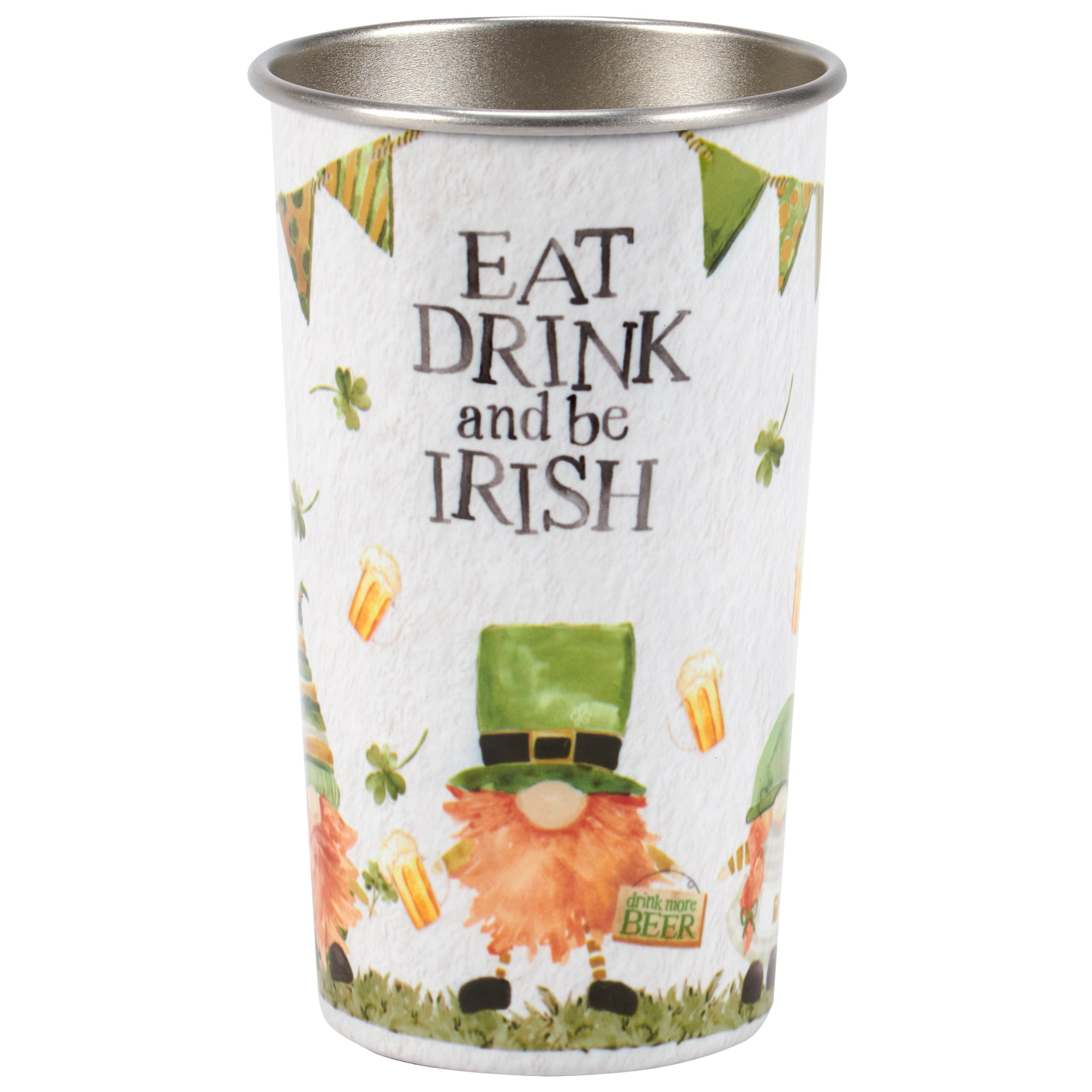 A stainless steel drink tumbler from our St. Patrick's Day Collection displaying a fun hand painted design of celebrating Irish gnomes with a seasonal sentiment that reads "Eat Drink And Be Irish." Our Eat Drink And Be Irish tumbler holds up to 22 oz. Hand-wash only. A fun St. Patrick's Day accessory perfect for seasonal gifting.