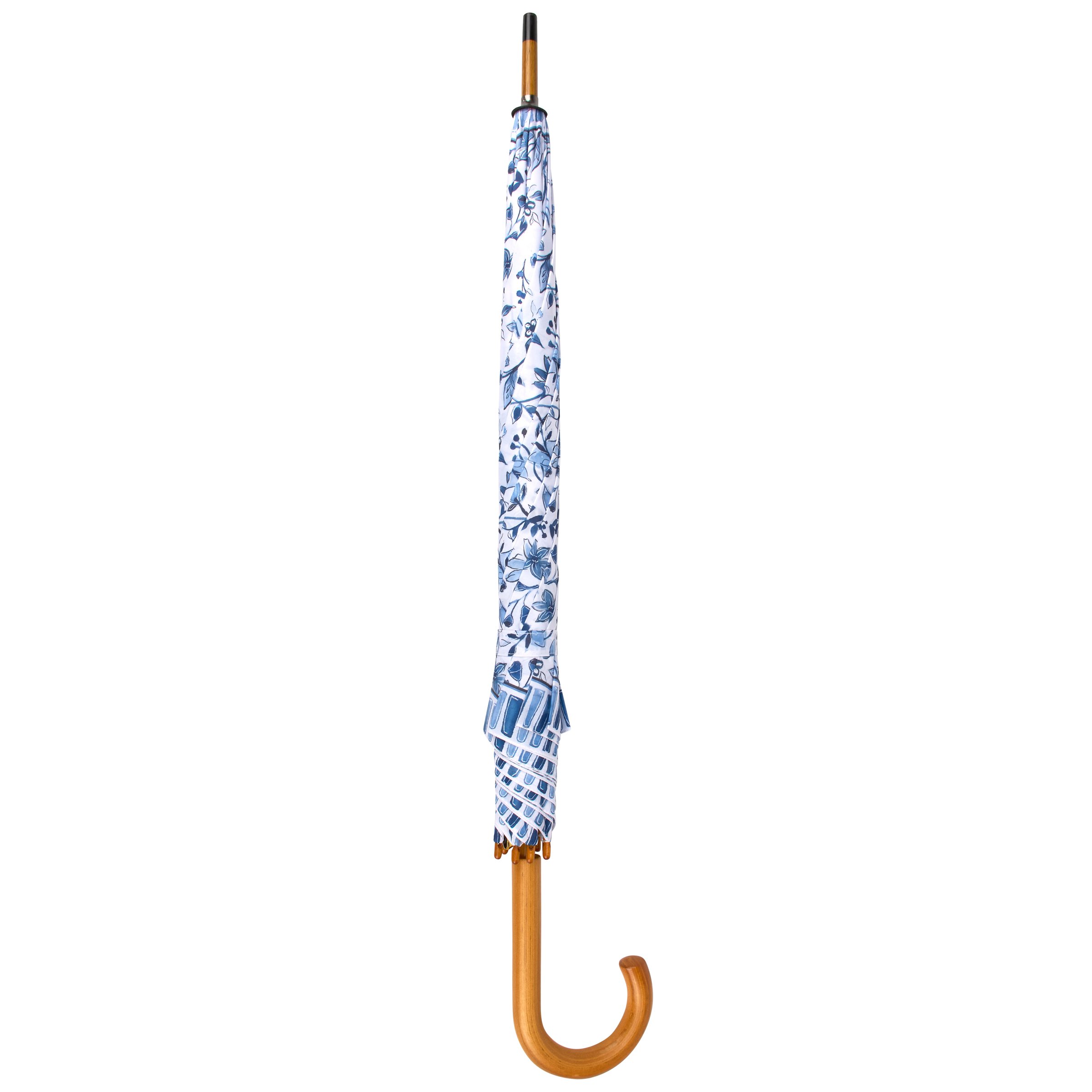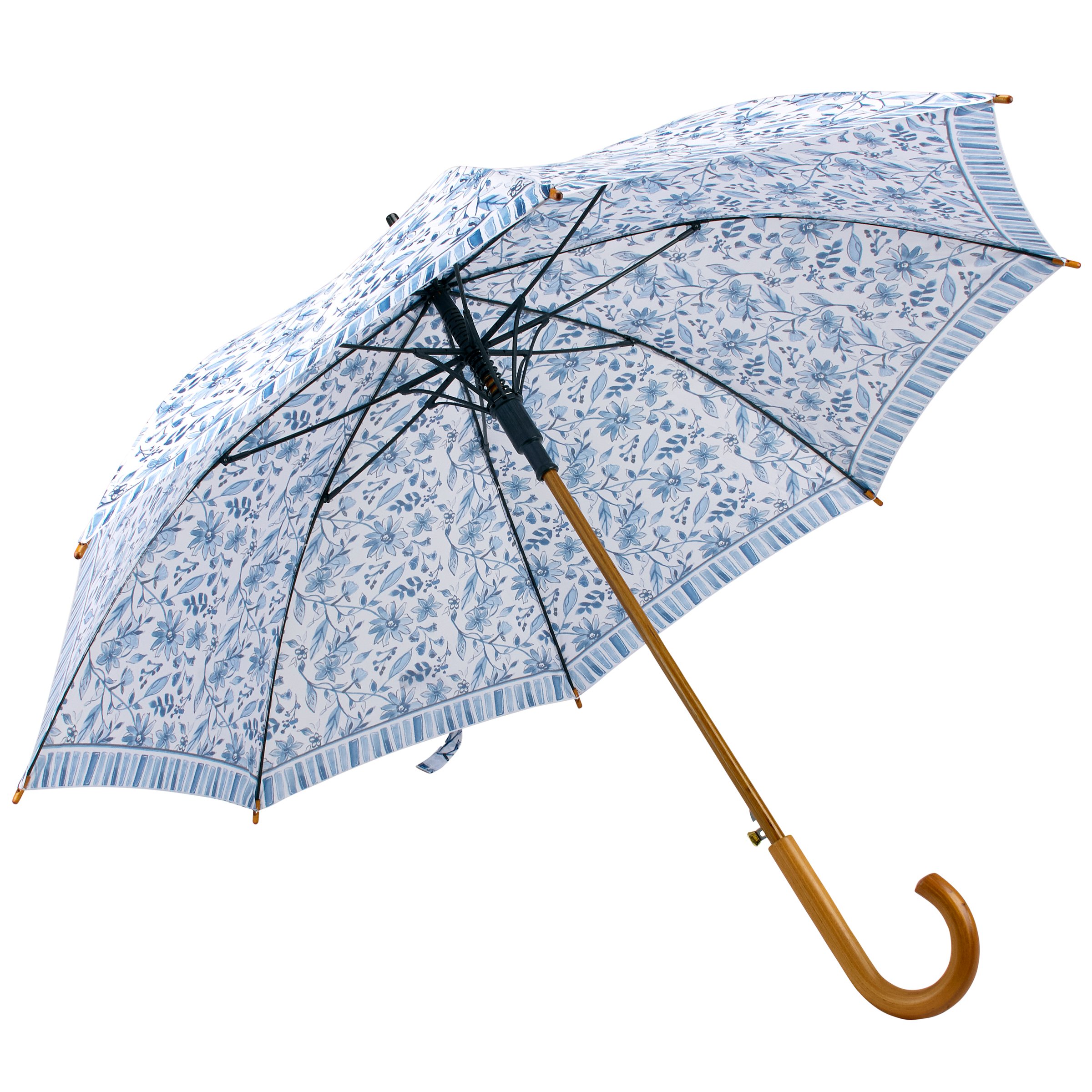 A stylish umbrella from our Indigo Collection displaying a pattern of flowers in a calming indigo color palette on the canopy. Floral pattern is replicated from original art hand painted in a unique watercolor style. This floral umbrella features a durable curved wooden handle with easy to open canopy and push button to collapse and tie shut with coordinating strap. Our Blue Florals umbrella canopy features a spread of over 40 inches for plenty of coverage from the weather. A stylish floral themed accessory that is great for gifting.