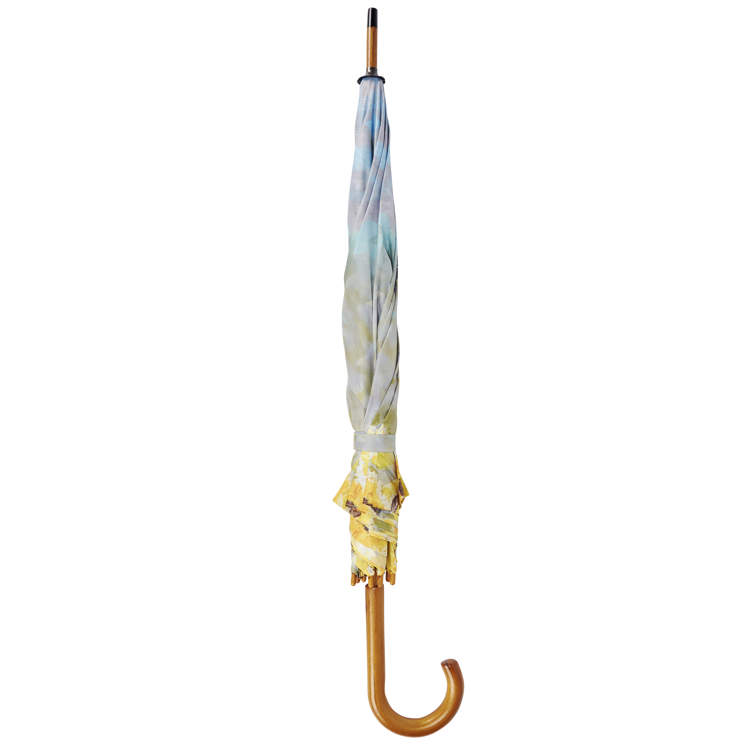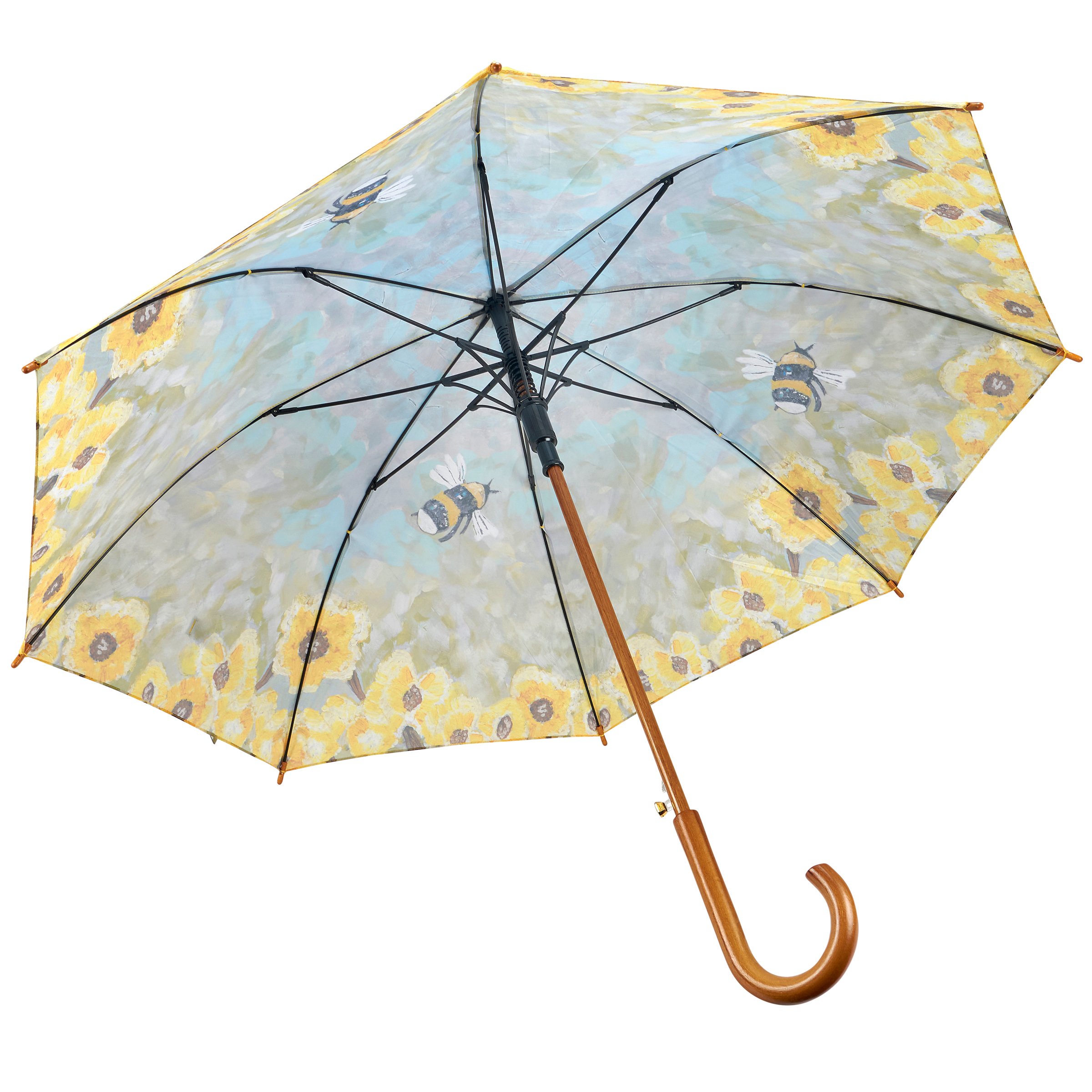 A stylish umbrella from our Friendship Heart Gallery displaying a full color design of bumblebees buzzing over yellow flowers on the canopy. Bumblebee design is replicated from original art created at the Friendship Heart Gallery in downtown Lancaster, PA that supports artists with intellectual disabilities and autism. Artful umbrella is a classic design featuring a durable curved wooden handle with easy to open canopy and push button to collapse and tie shut with coordinating strap. Our Bumblebees umbrella canopy features a spread of over 40 inches for plenty of coverage from the weather. A stylish everyday accessory that is great for gifting.