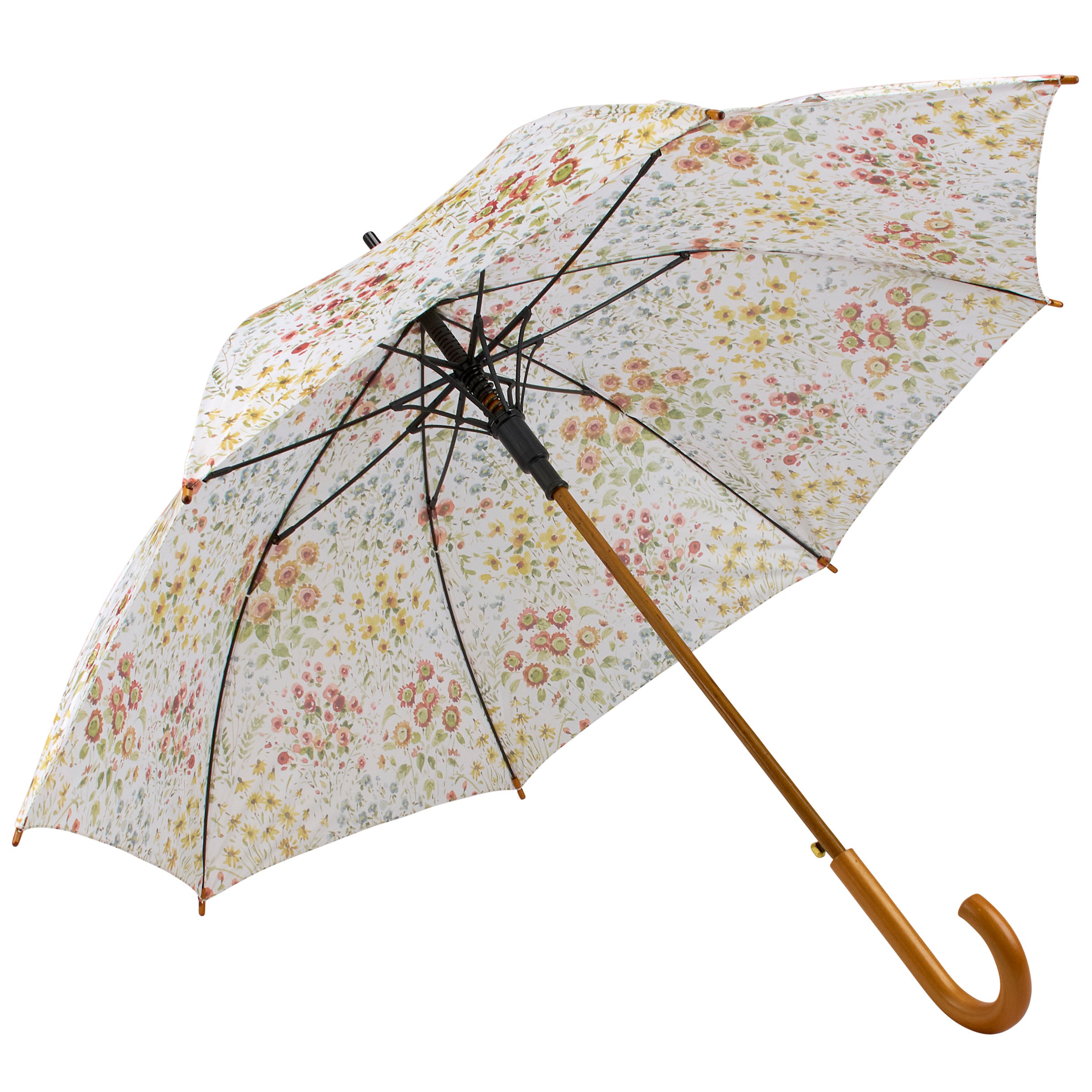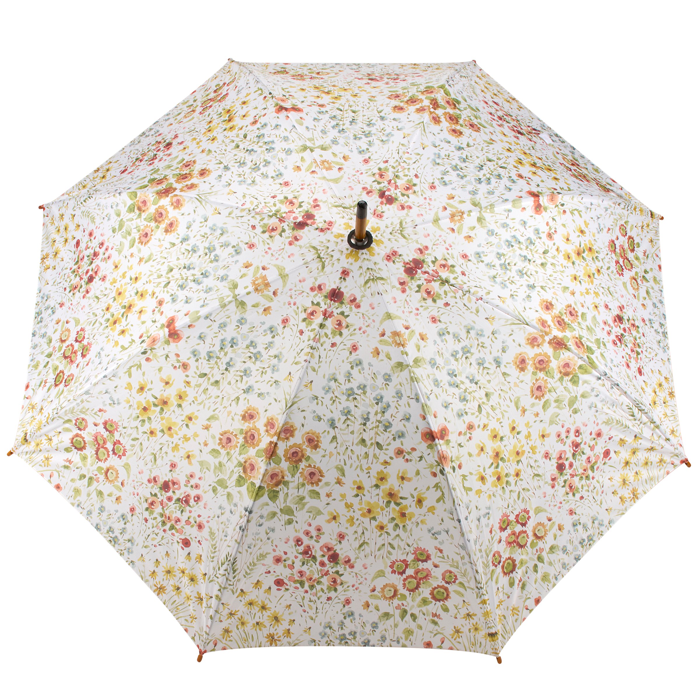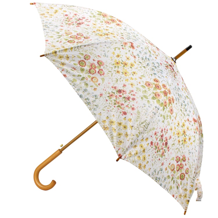 A stylish umbrella from our Fall & Harvest Collection displaying a pattern of fall wildflowers replicated from original art hand painted in a delicate watercolor style. This seasonal umbrella features a durable curved wooden handle with easy to open canopy and push button to collapse and tie shut with coordinating strap. Our Fall Wildflowers umbrella canopy features a spread of over 40 inches for plenty of coverage from the weather. A fall accessory that is great for gifting.